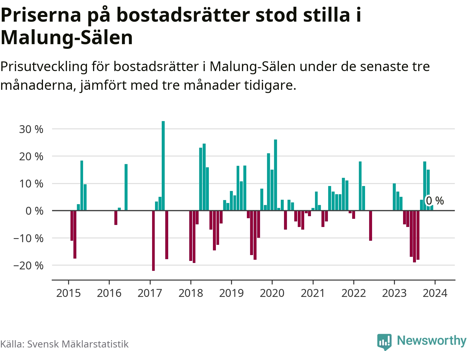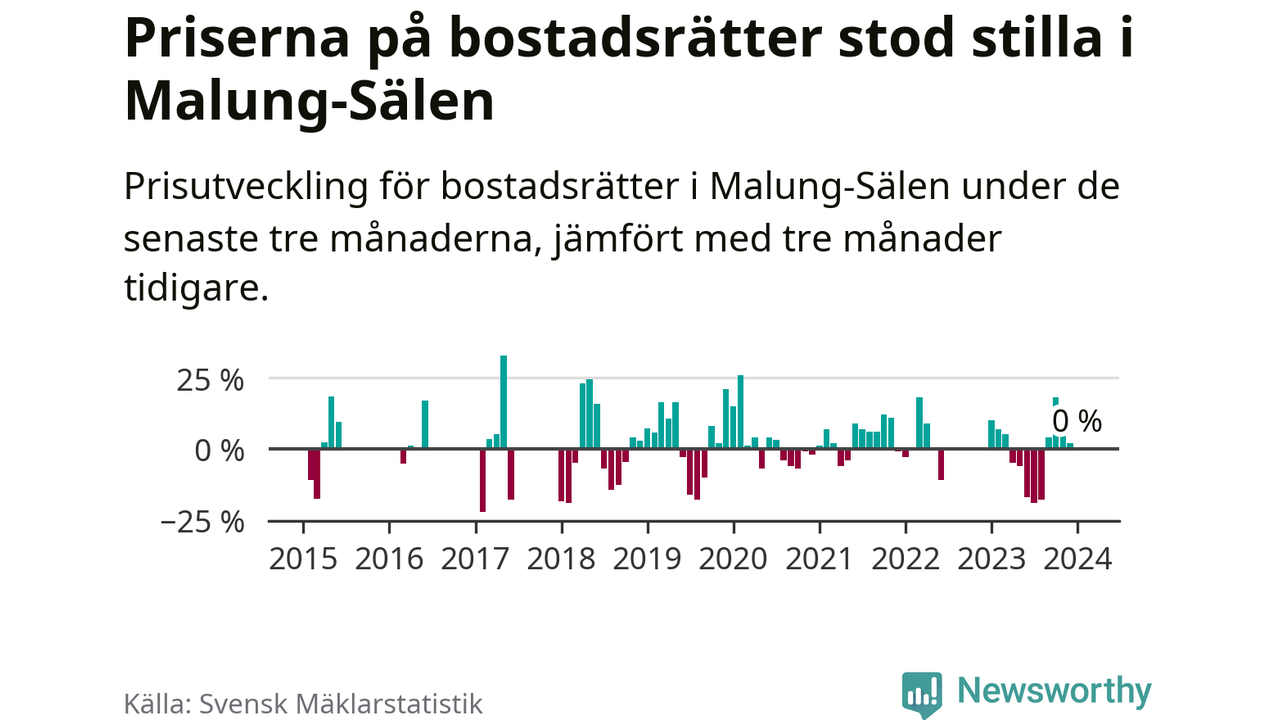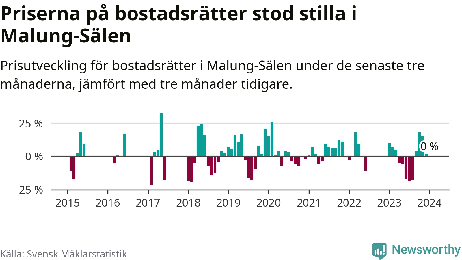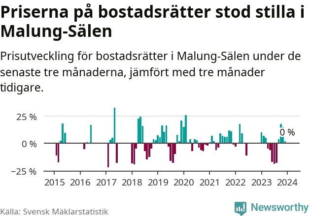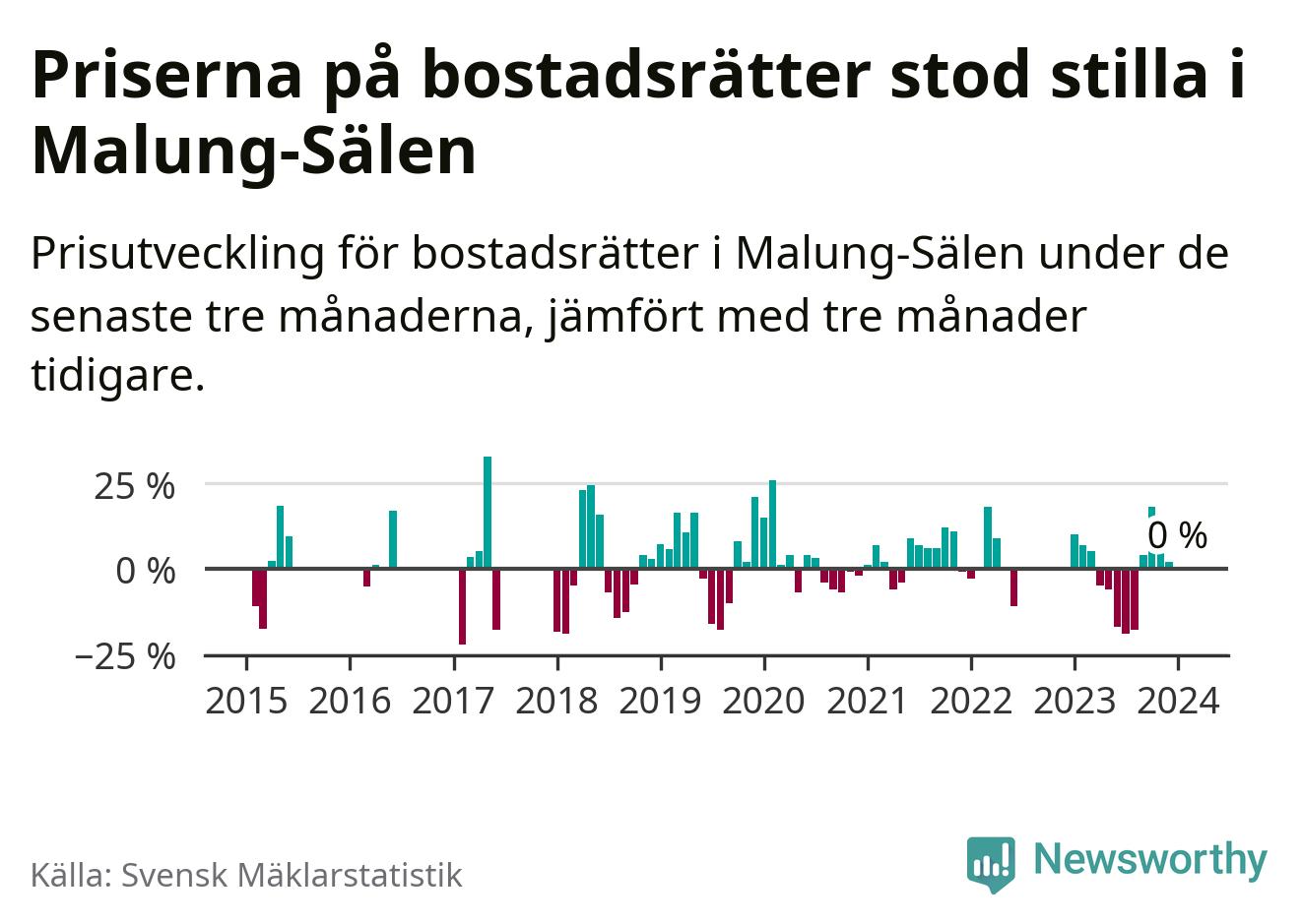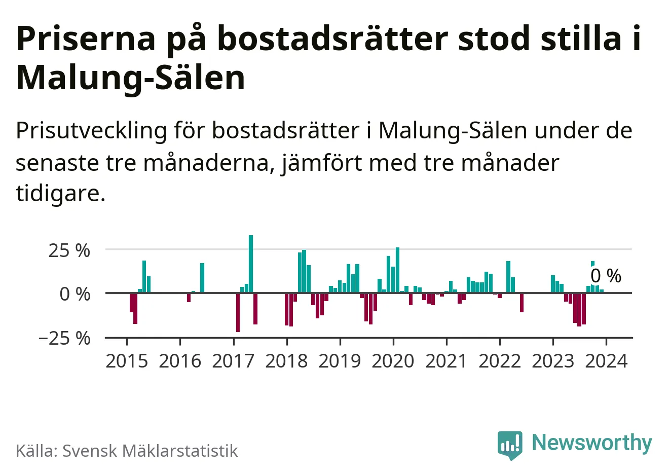 Priserna på bostadsrätter står i stort sett stilla i Malung-Sälens kommun. Medelpriset på de på försäljningarna under de senaste tre månaderna låg på samma nivå som för tre månader sedan.