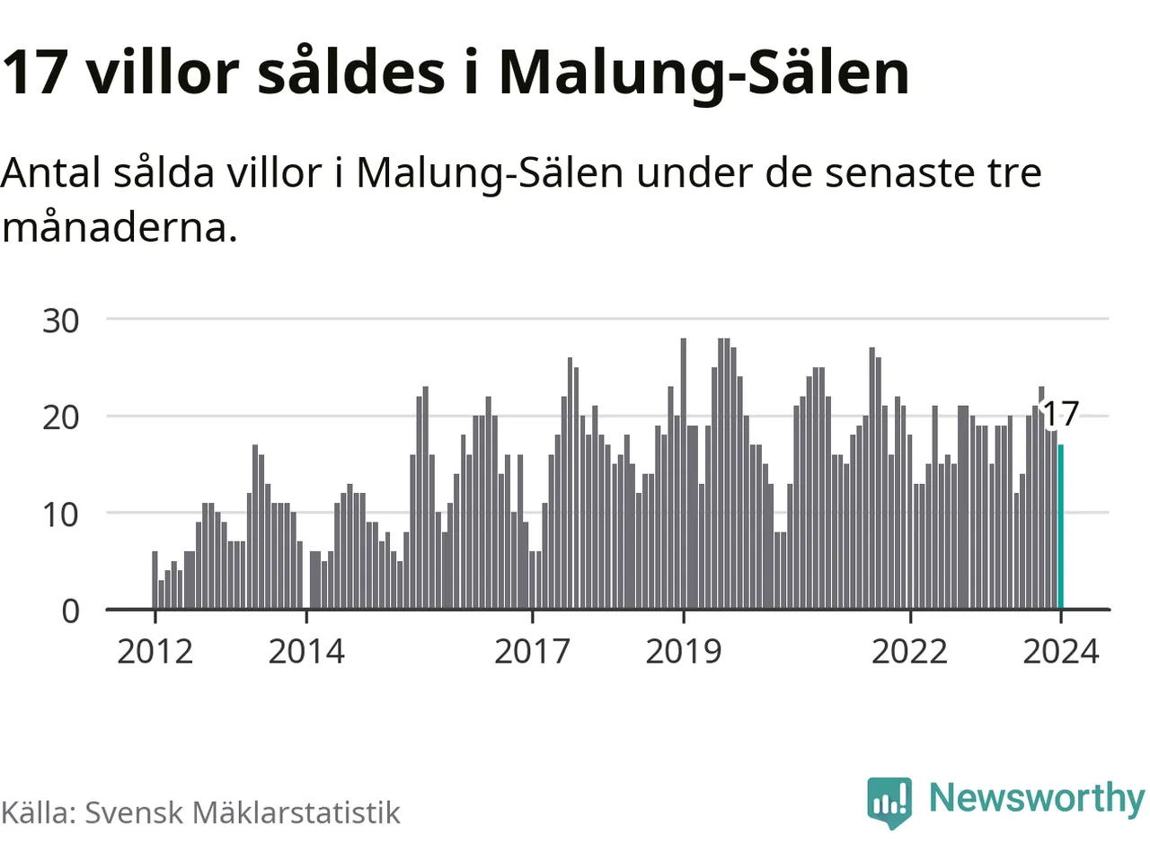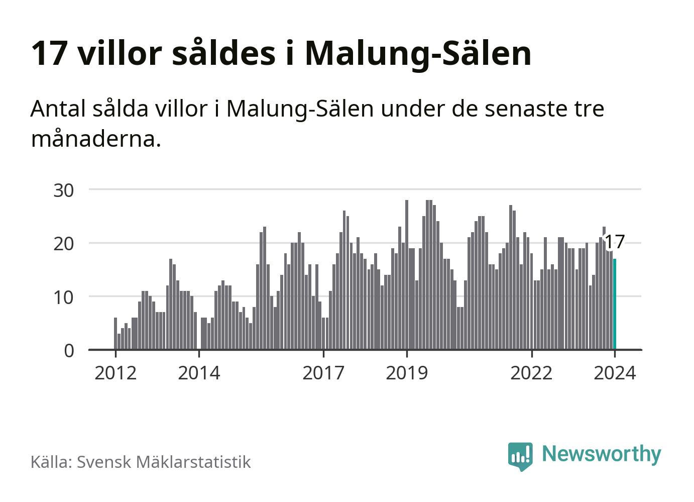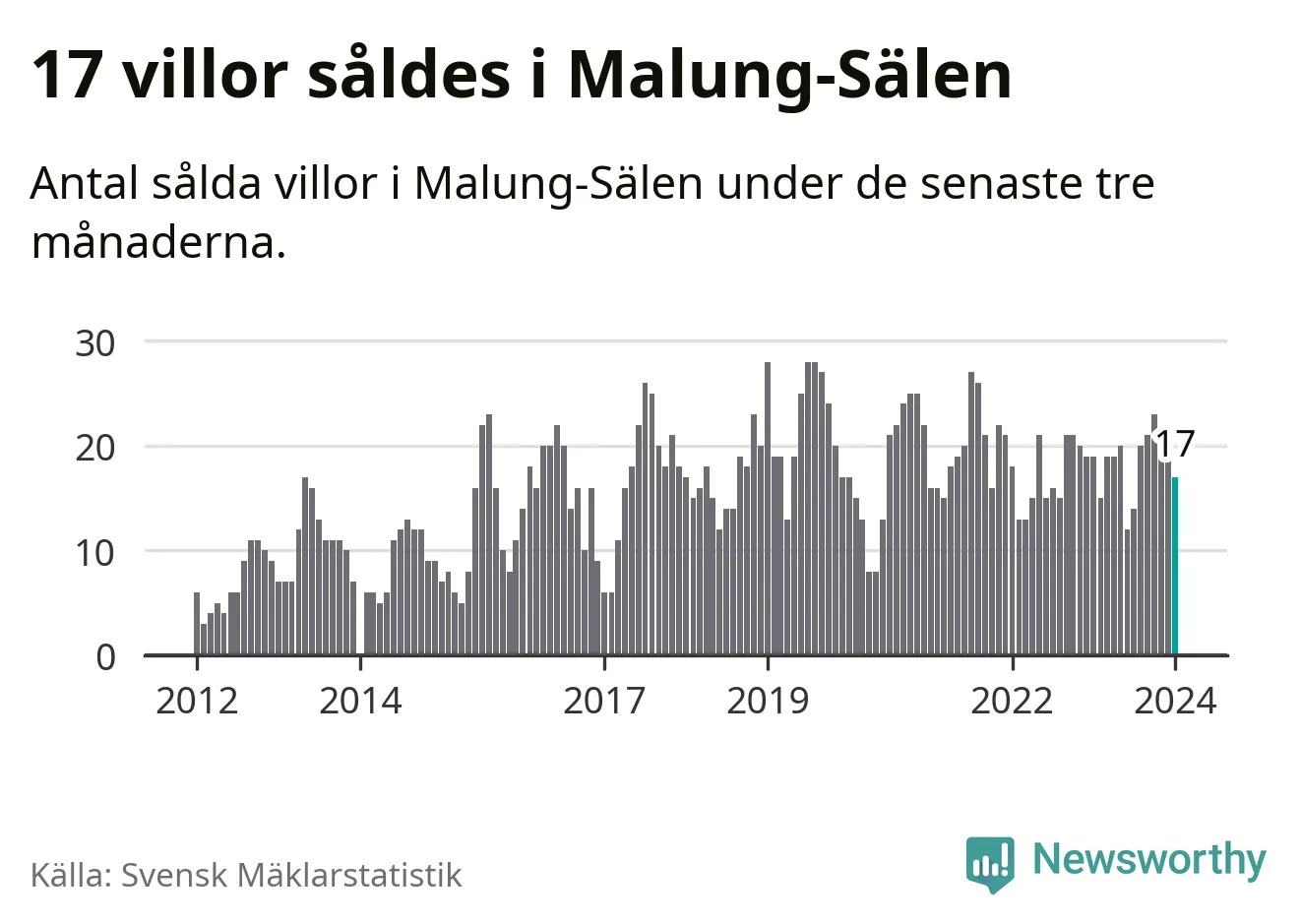 Mellan november och januari gjordes sammanlagt 17 affärer med villor i Malung-Sälens kommun. Det kan jämföras med 19 vid motsvarande tid i fjol.