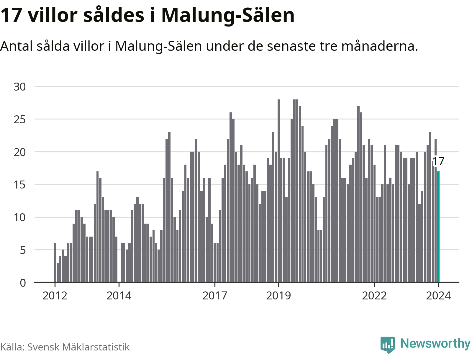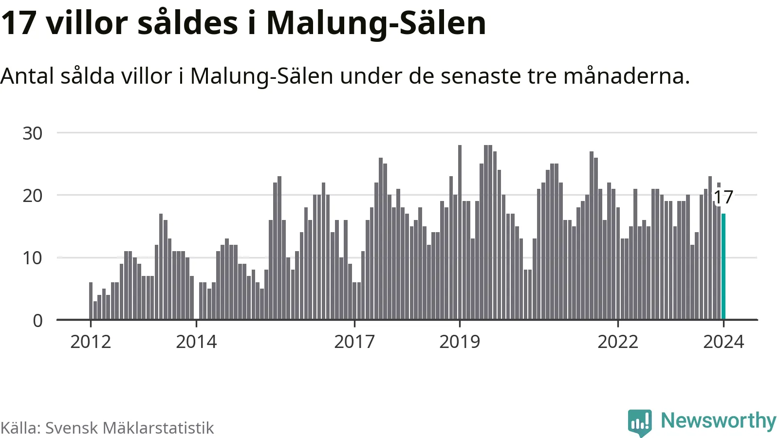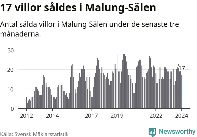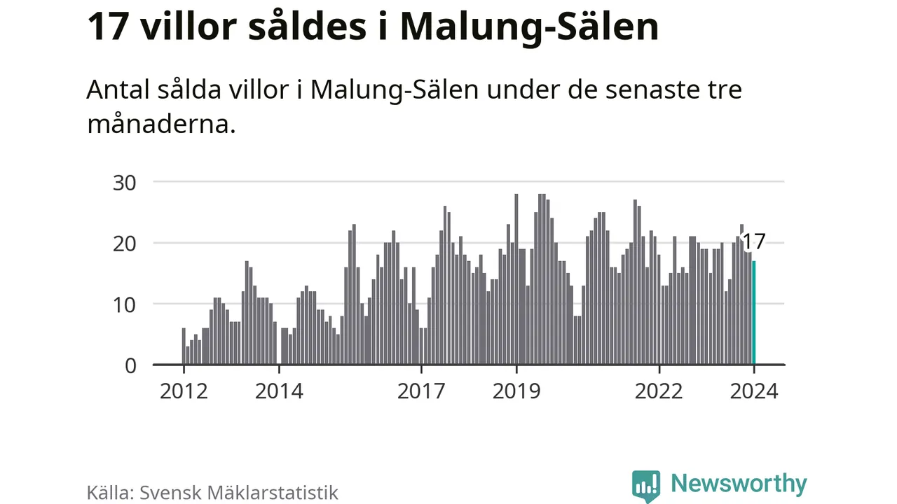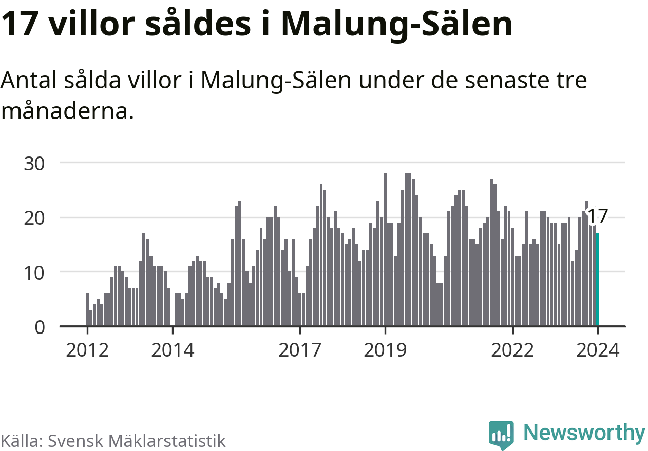 Mellan november och januari gjordes sammanlagt 17 affärer med villor i Malung-Sälens kommun. Det kan jämföras med 19 vid motsvarande tid i fjol.