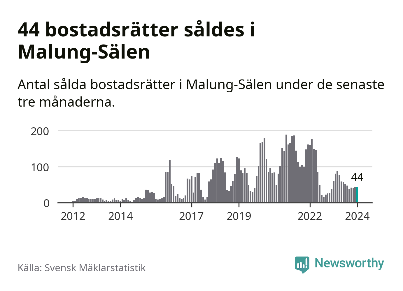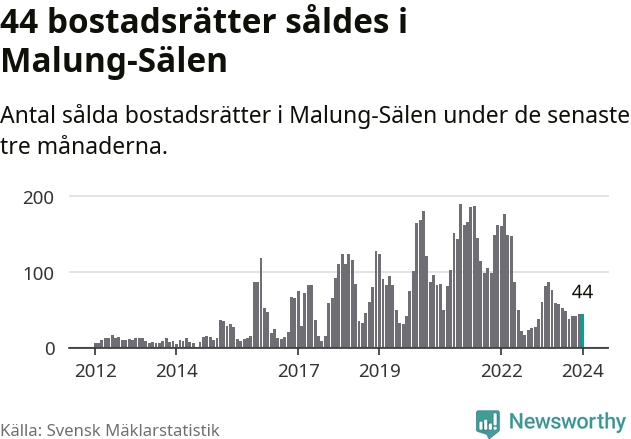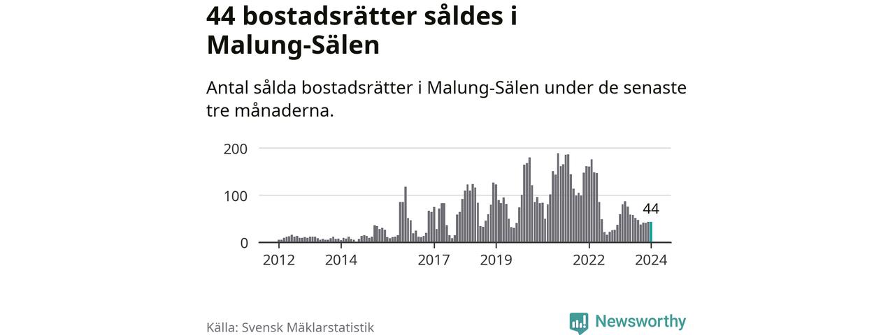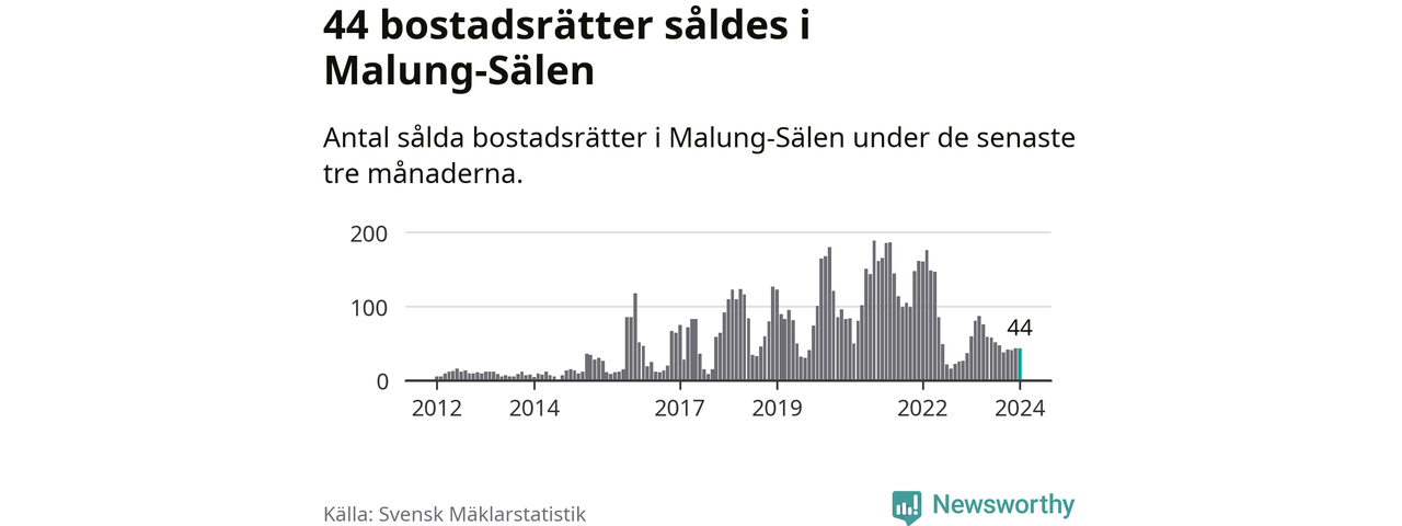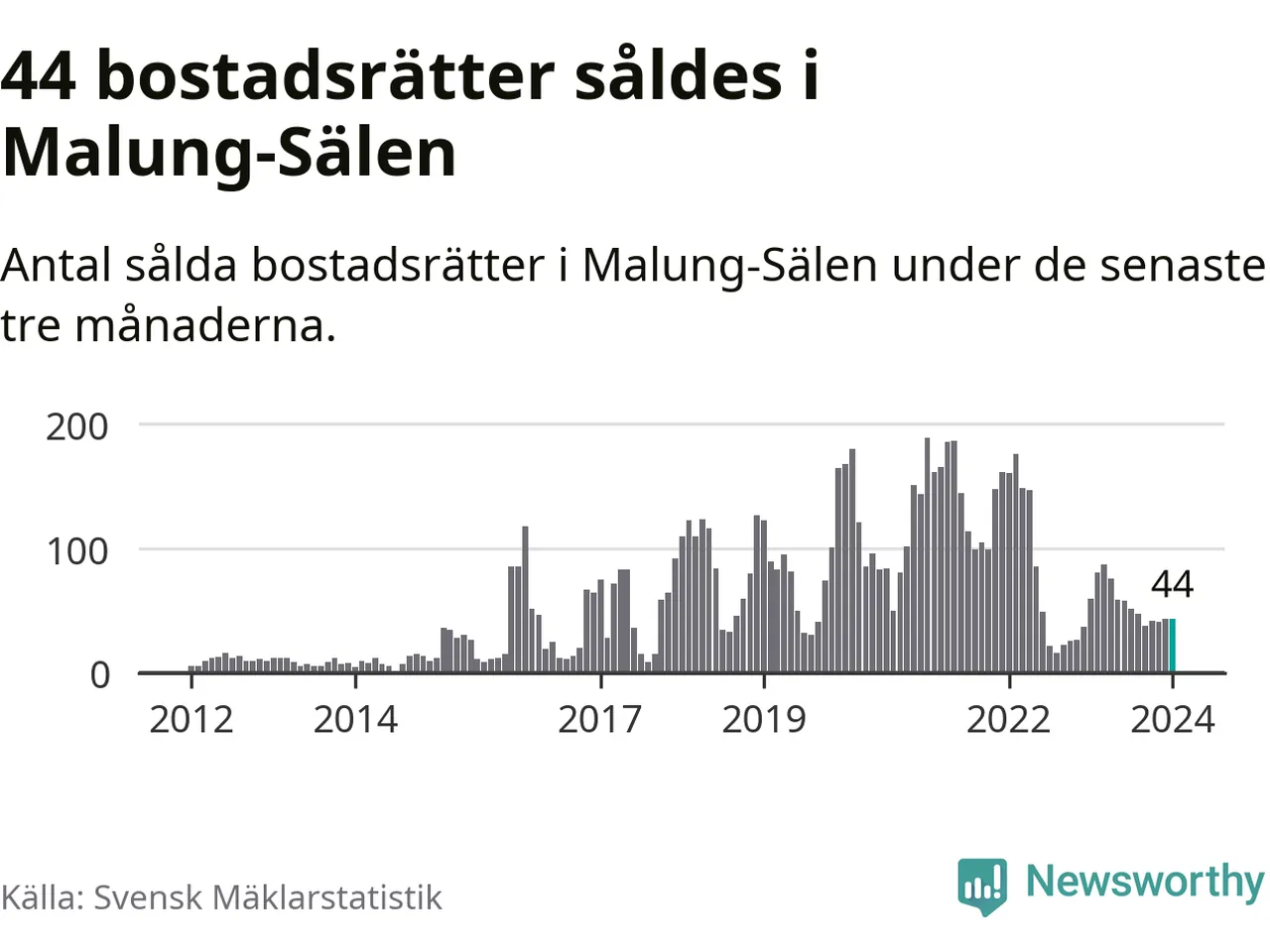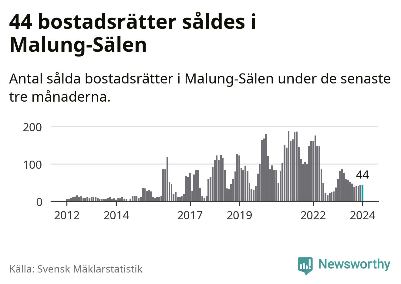 Sammanlagt såldes 44 bostadsrätter i Malung-Sälens kommun mellan november och januari till ett genomsnittligt pris på 3,2 miljoner kronor. I fjol gjordes 60 affärer vid den här tiden på året.