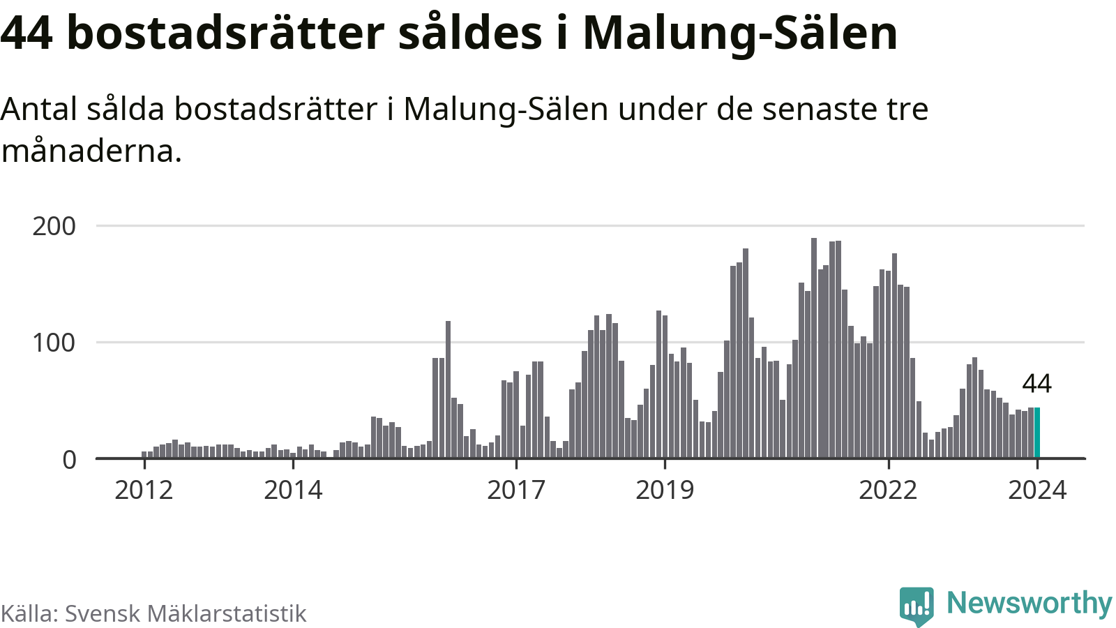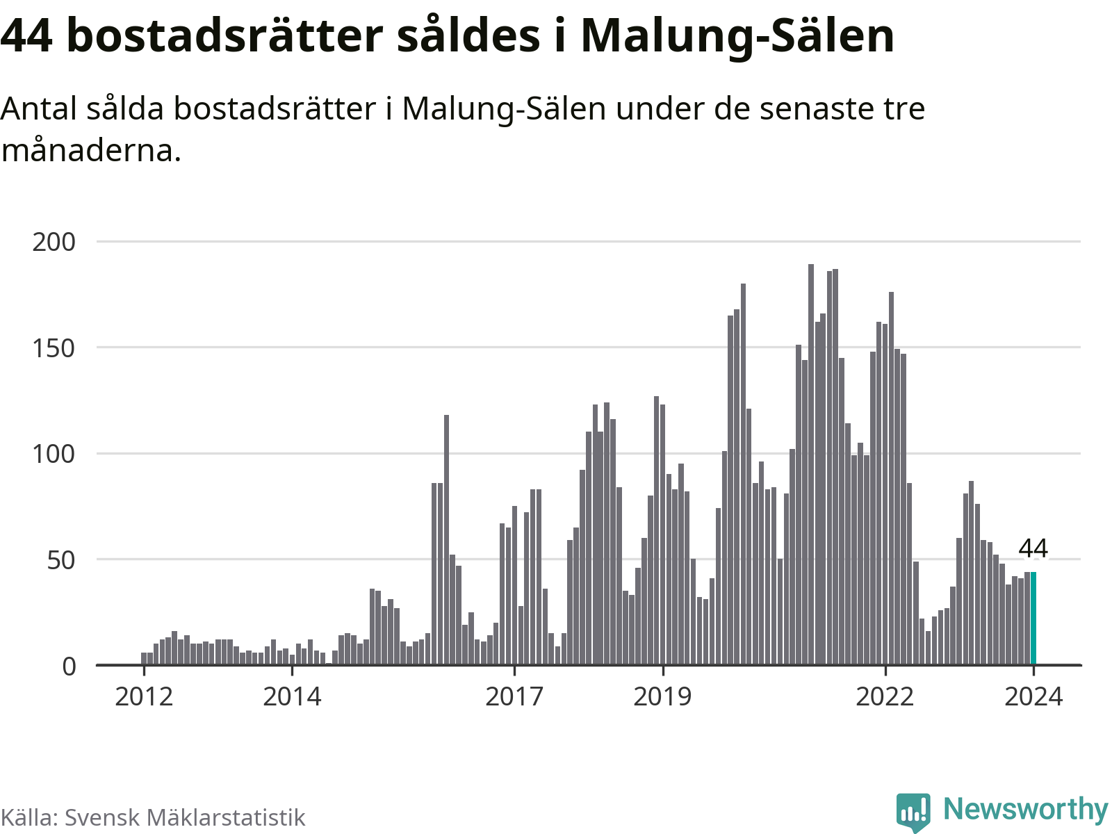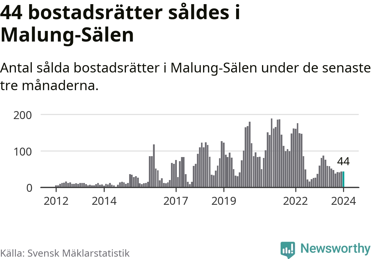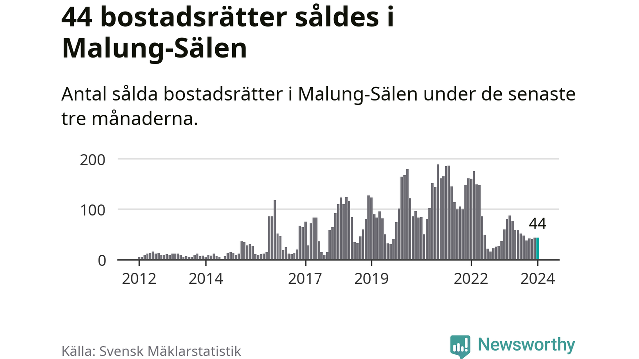 Sammanlagt såldes 44 bostadsrätter i Malung-Sälens kommun mellan november och januari till ett genomsnittligt pris på 3,2 miljoner kronor. I fjol gjordes 60 affärer vid den här tiden på året.