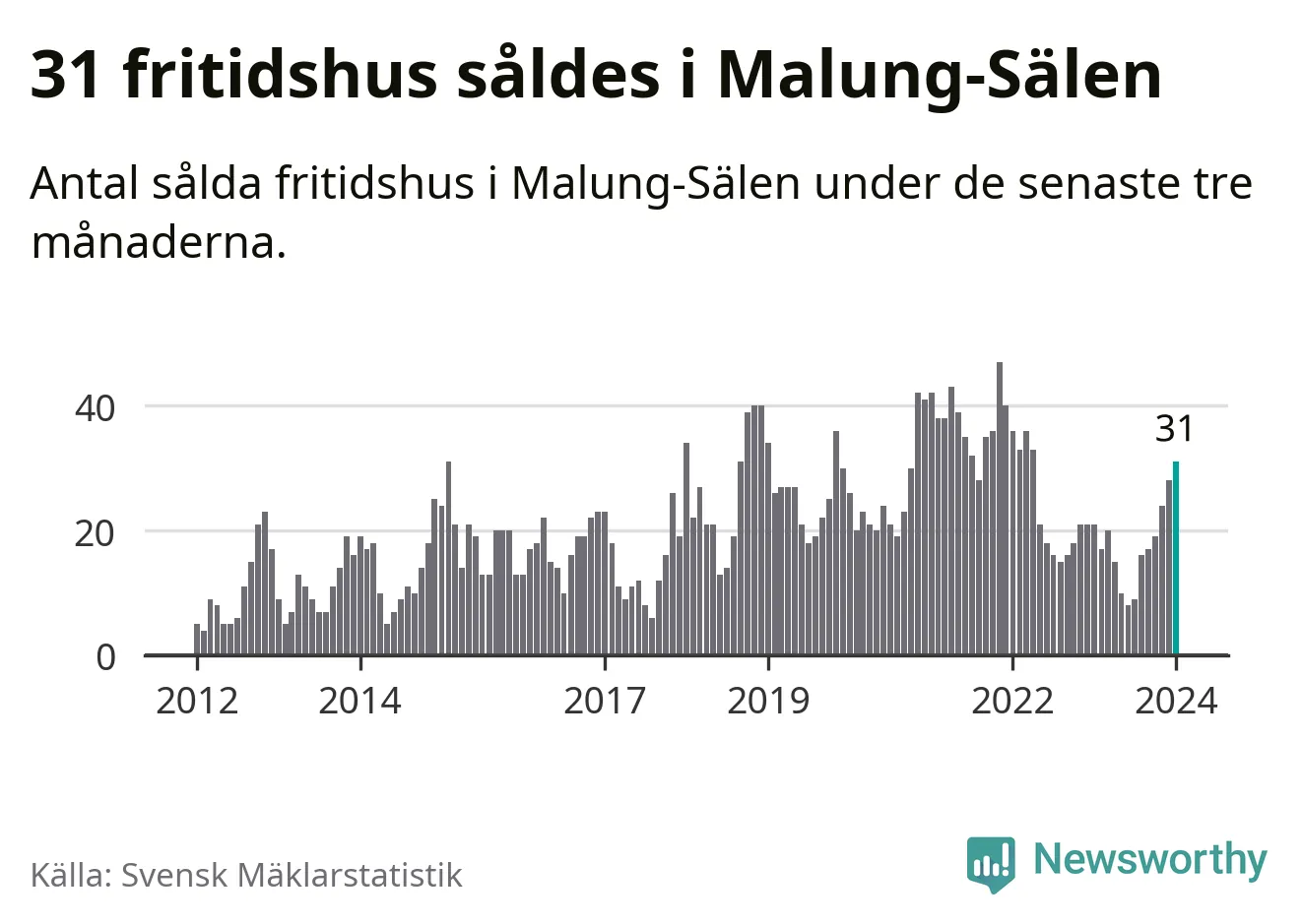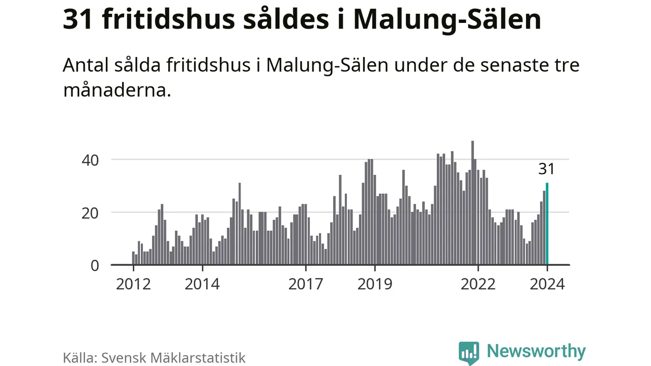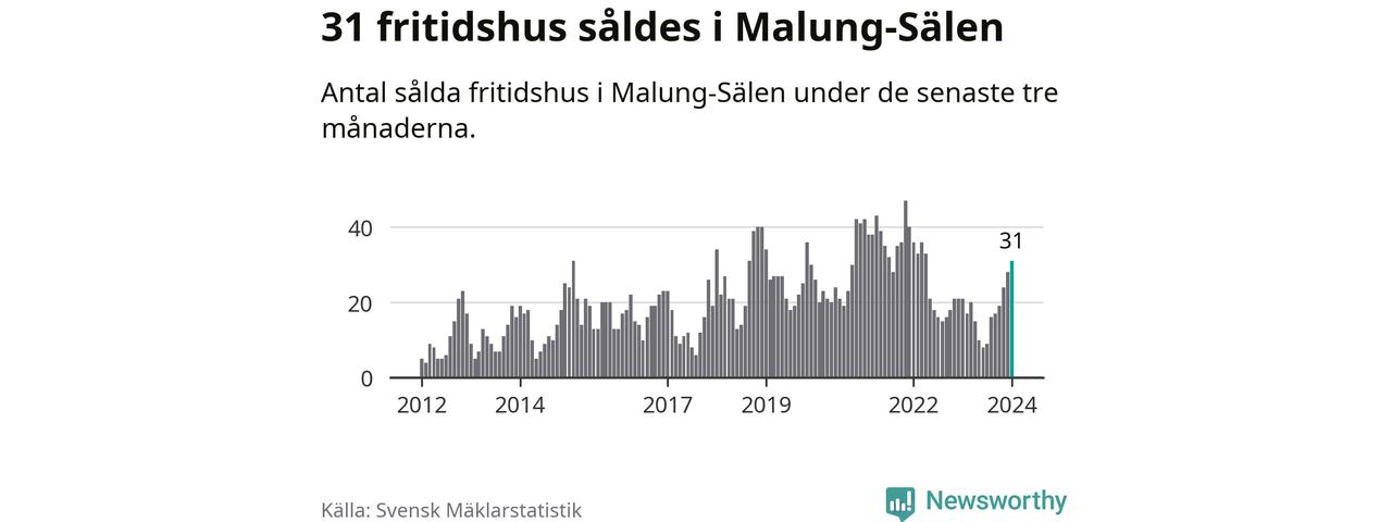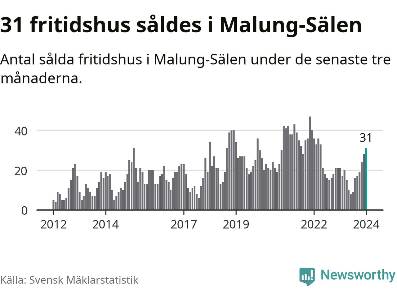 Mellan november och januari såldes 31 fritidshus i Malung-Sälens kommun. Det är relativt många sett till aktiviteten på bostadsmarknaden i kommunen under de senaste tolv månaderna, samt det historiska snittet för den här tiden på året.