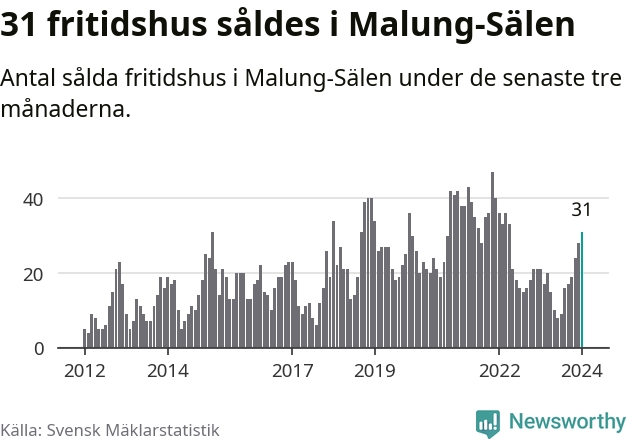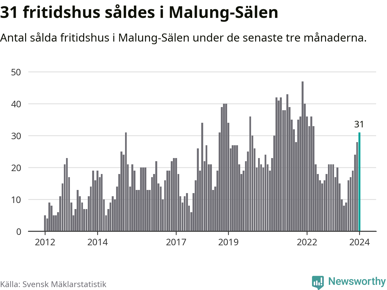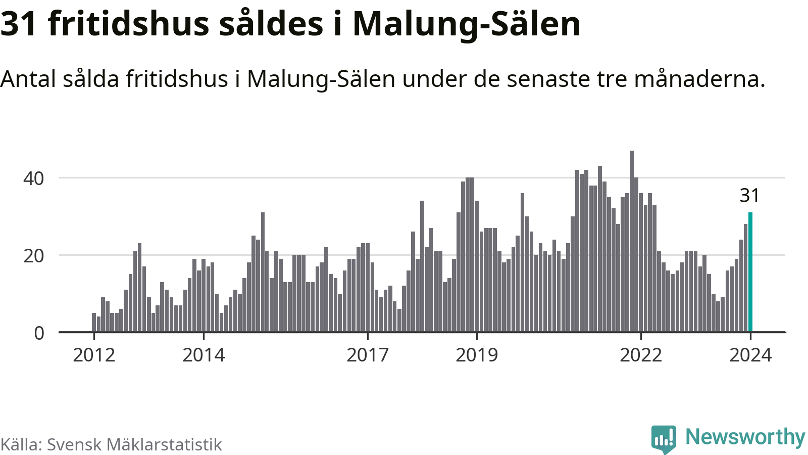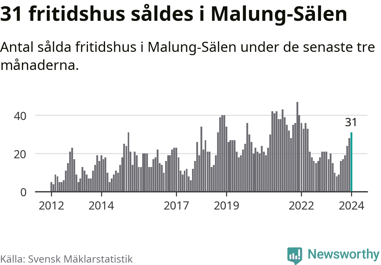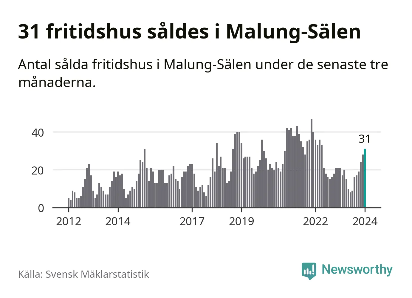 Mellan november och januari såldes 31 fritidshus i Malung-Sälens kommun. Det är relativt många sett till aktiviteten på bostadsmarknaden i kommunen under de senaste tolv månaderna, samt det historiska snittet för den här tiden på året.