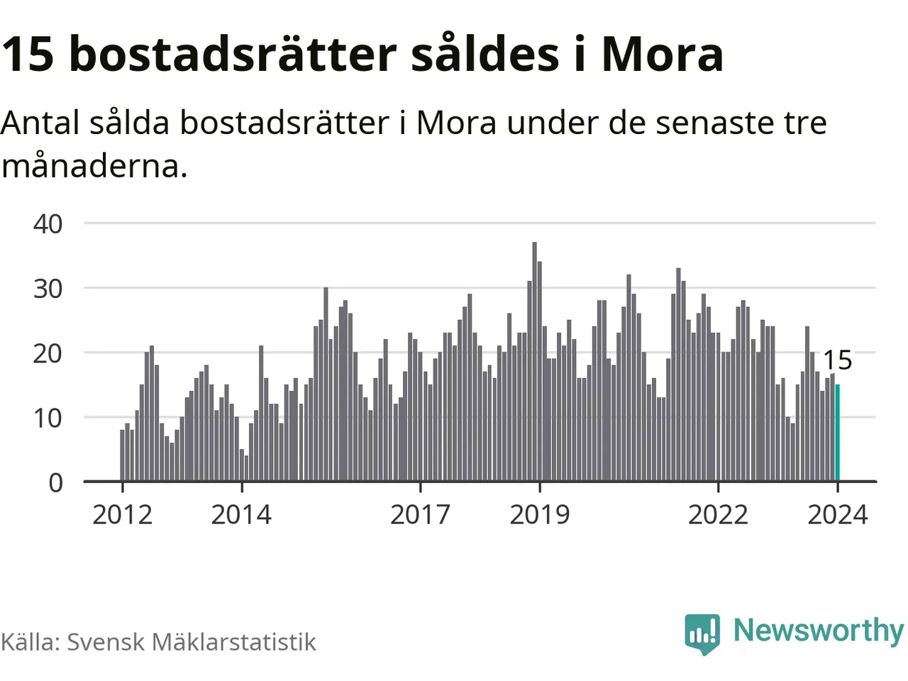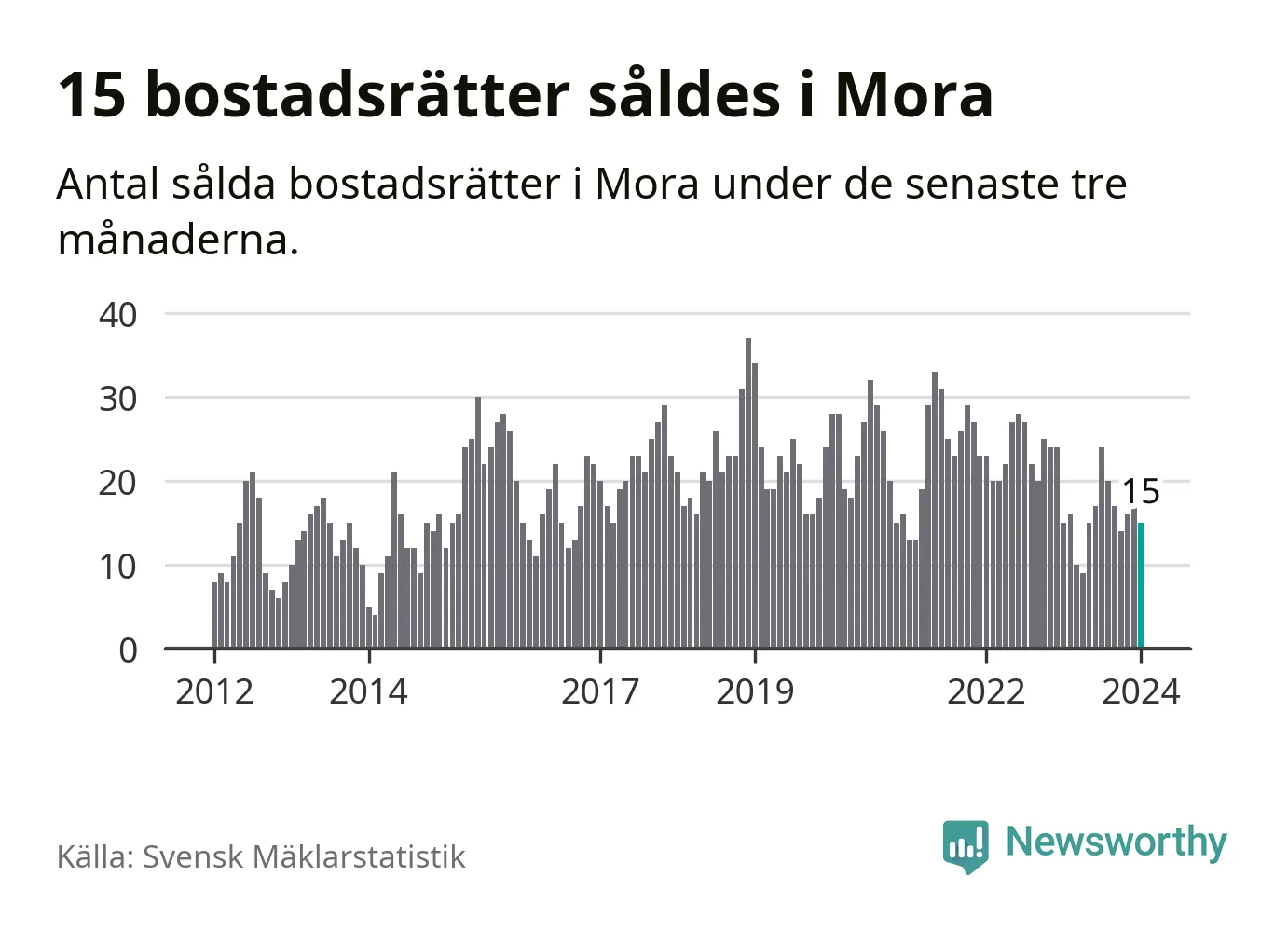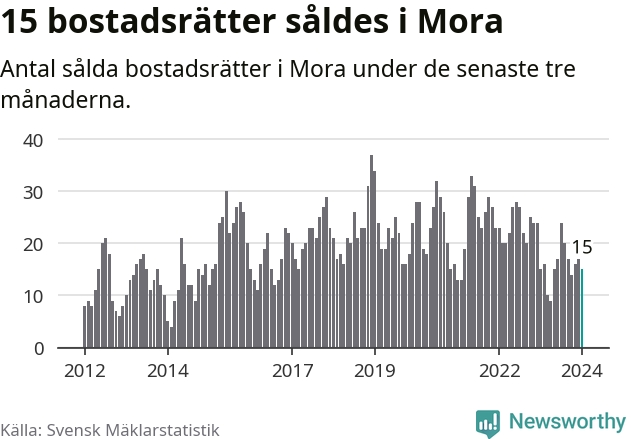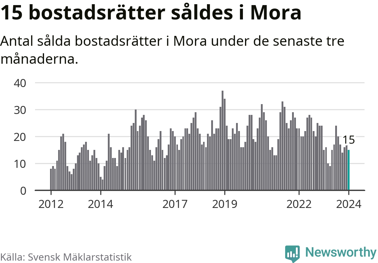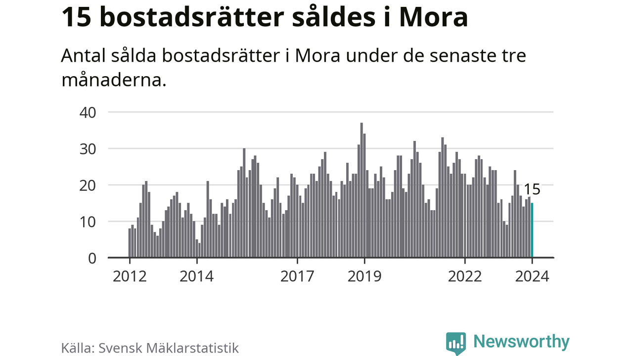 Mellan november och januari gjordes sammanlagt 15 affärer med bostadsrätter i Mora kommun. Det är lika många affärer som vid motsvarande tid i fjol.