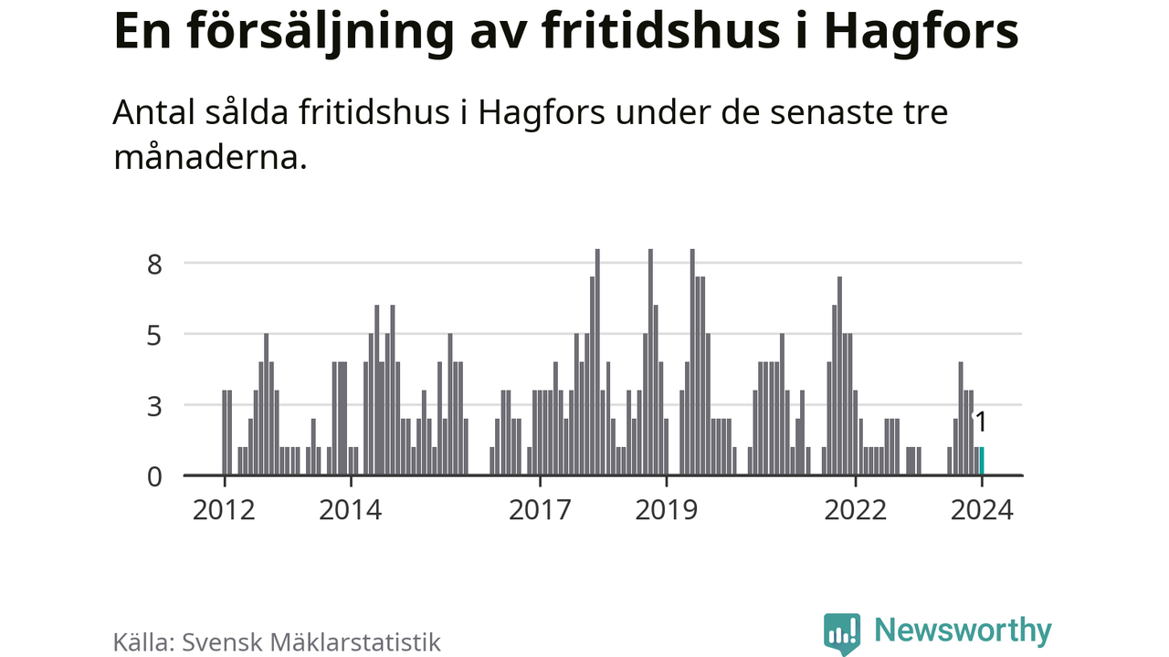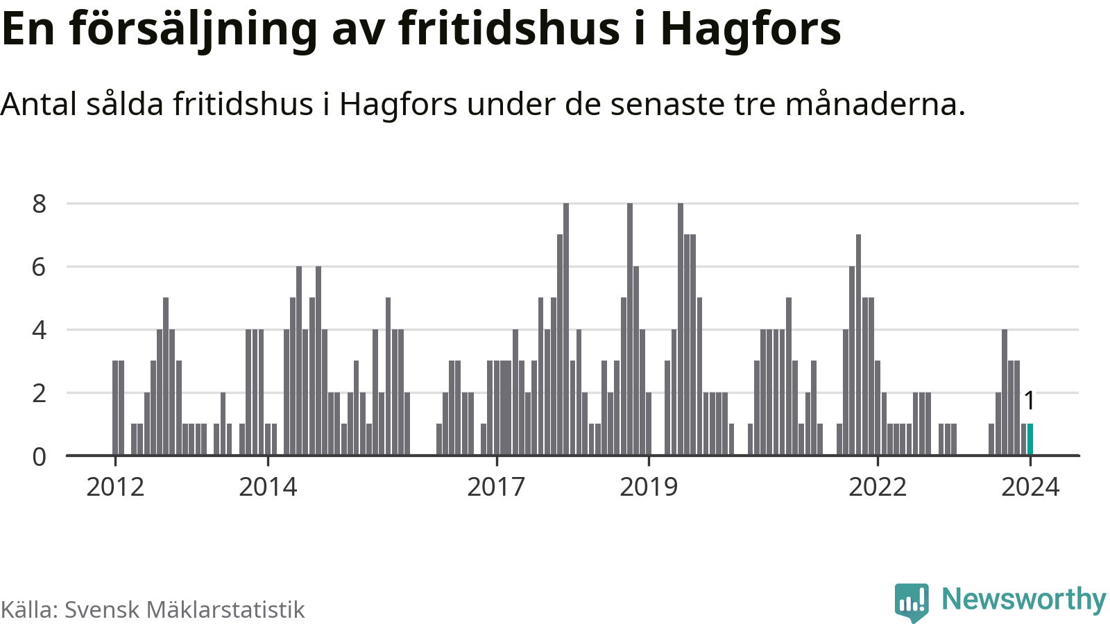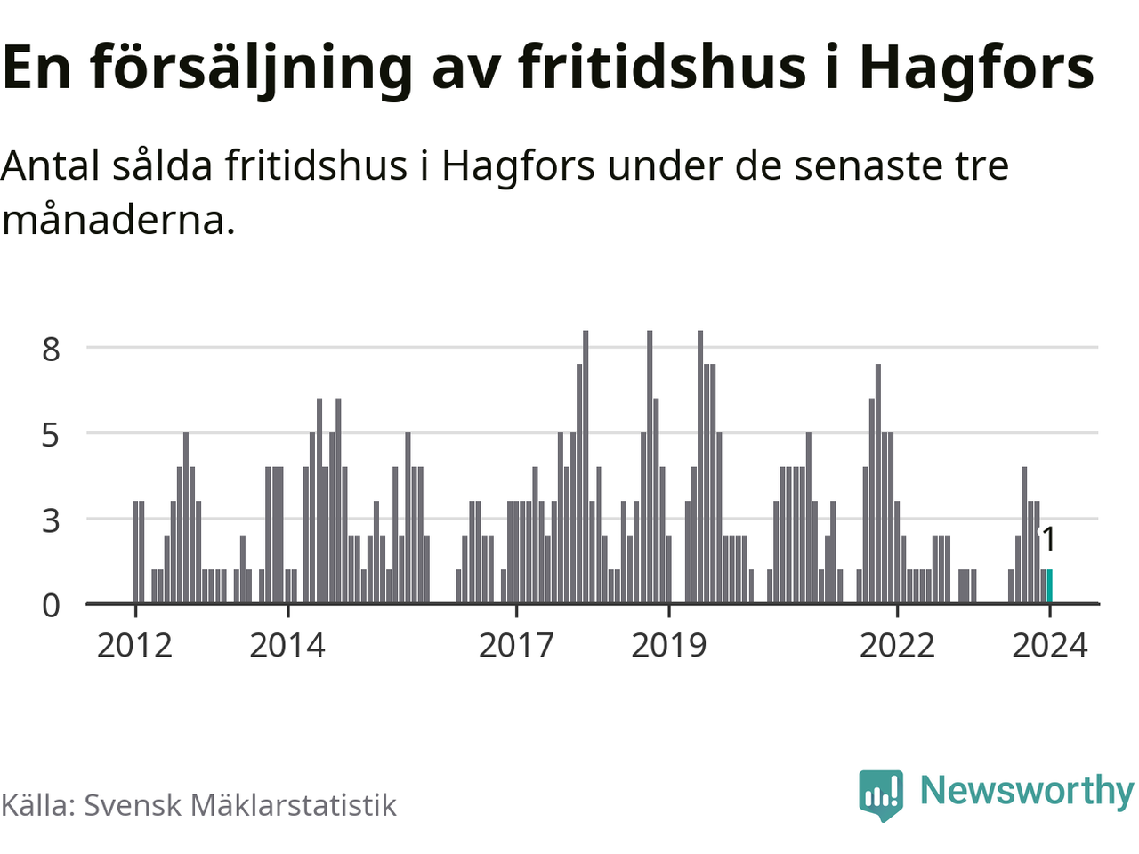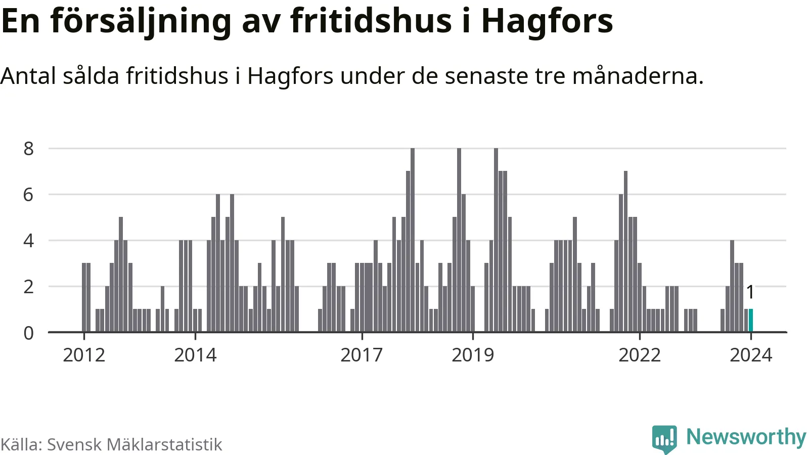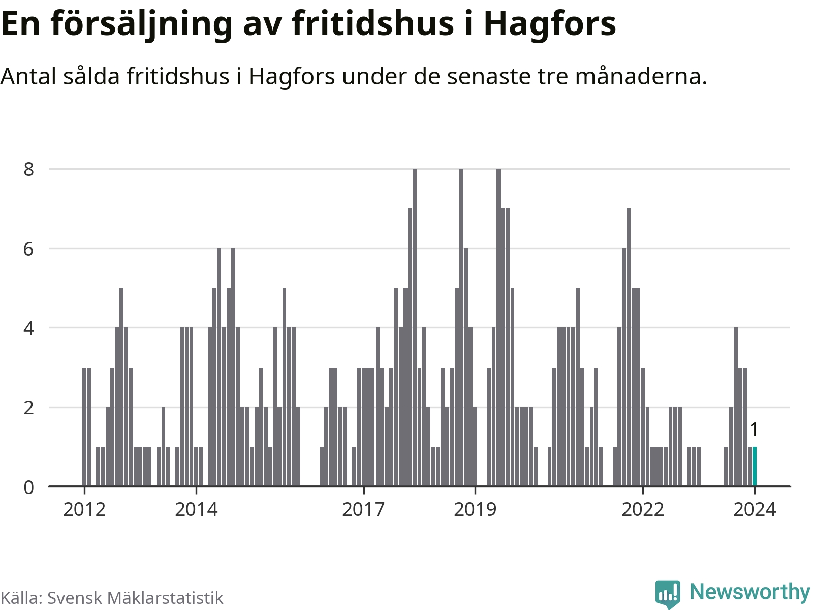 Mellan november och januari gjordes sammanlagt en affär med fritidshus i Hagfors kommun. Det är lika många affärer som vid motsvarande tid i fjol.
