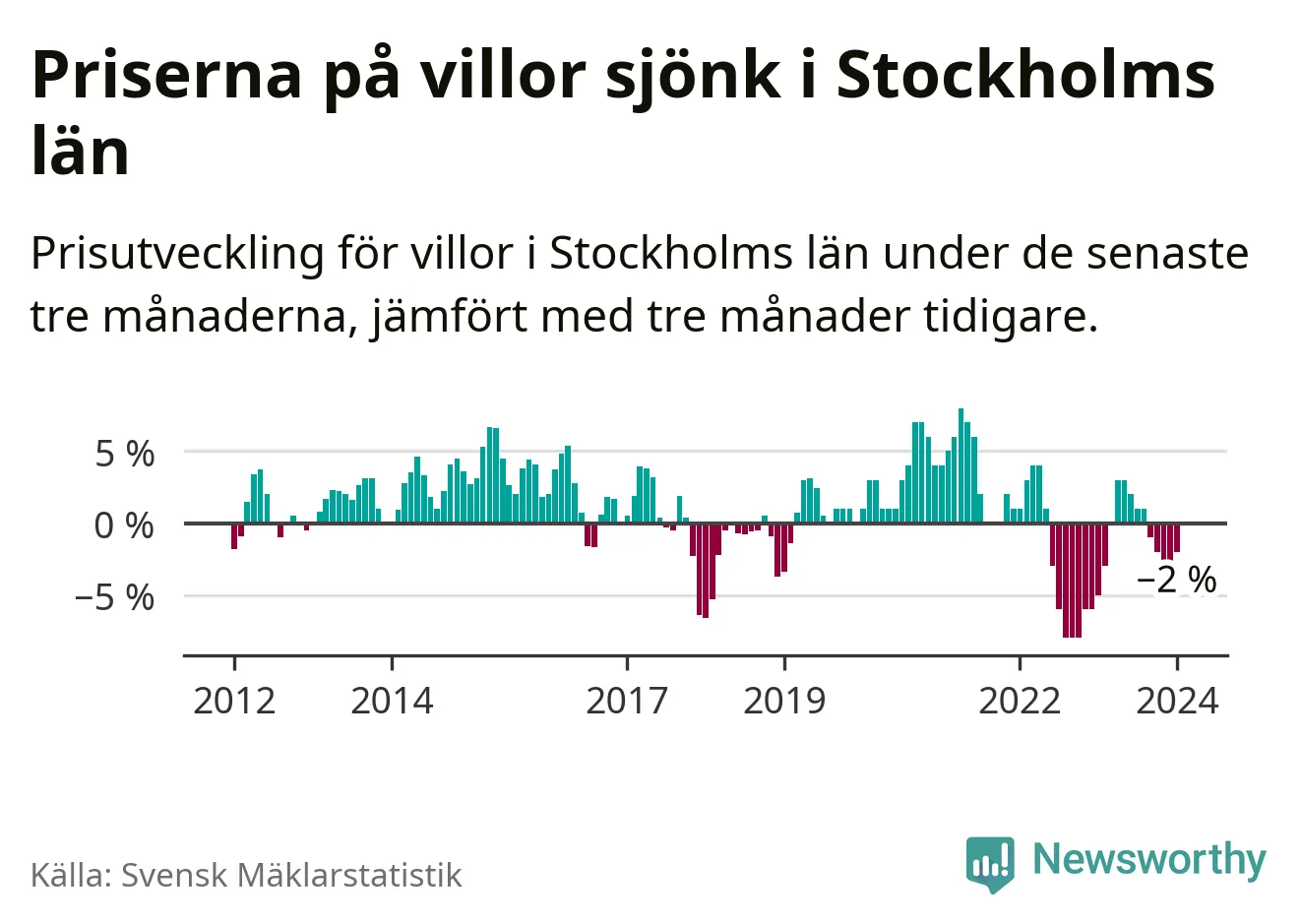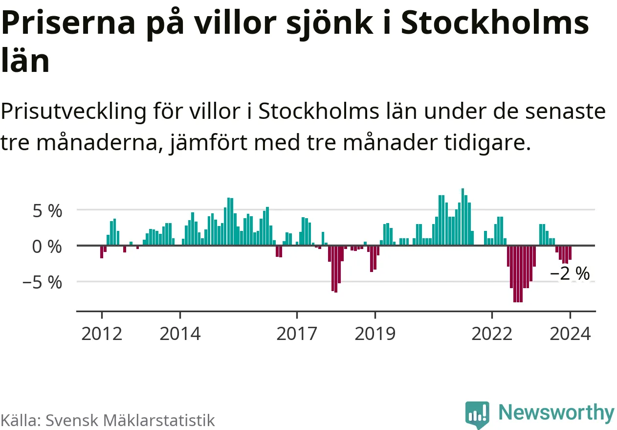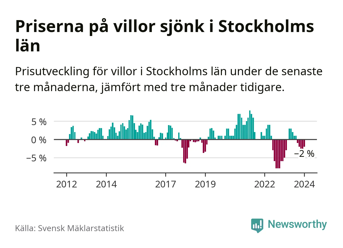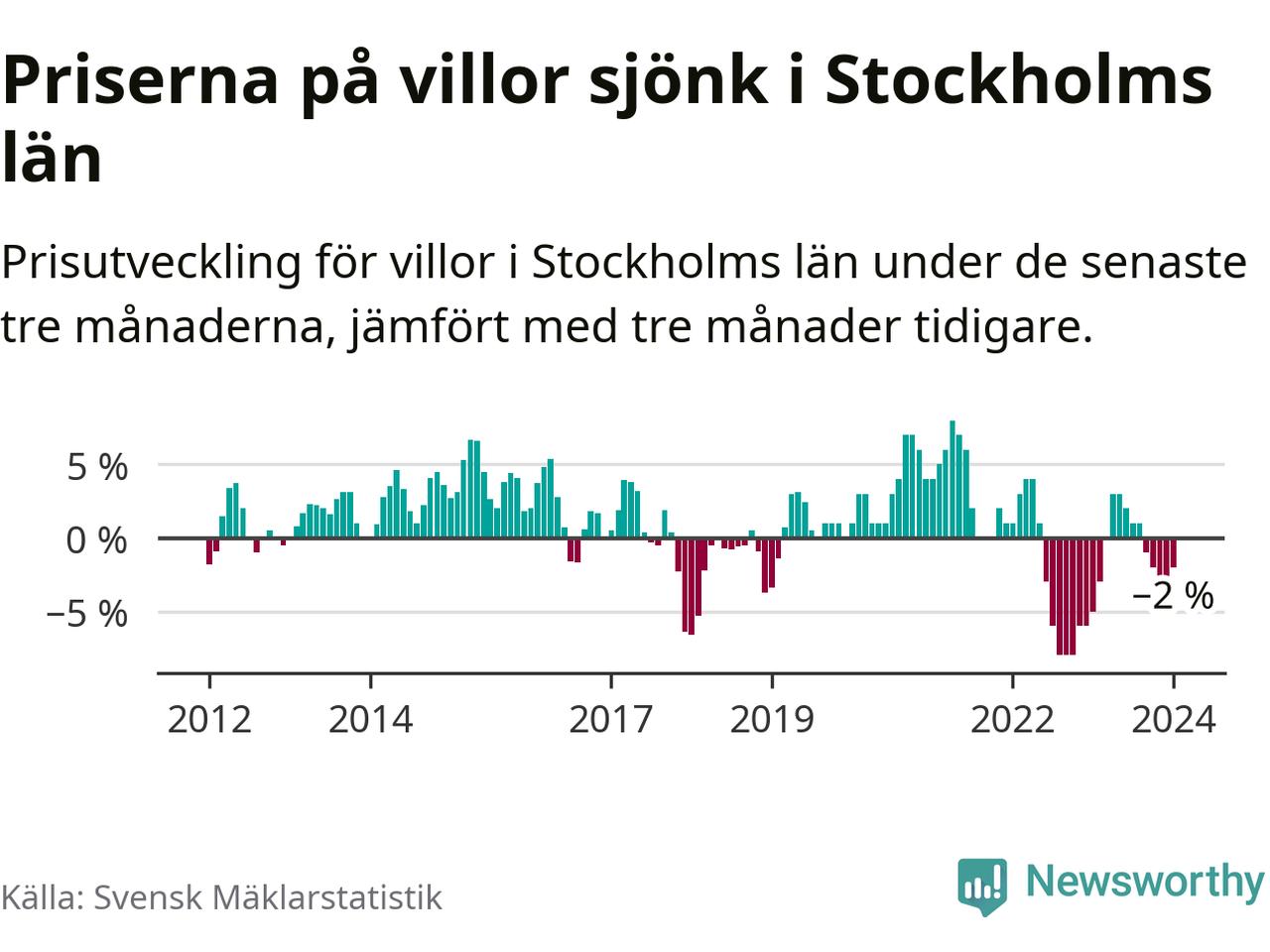 I Stockholms län som helhet går villapriserna ner med 2 procent. Även i hela Sverige sjunker villapriserna. I hela riket noterades en prisnedgång på 3 procent.