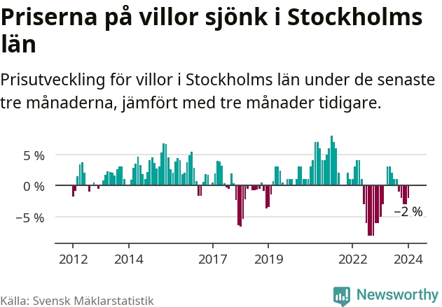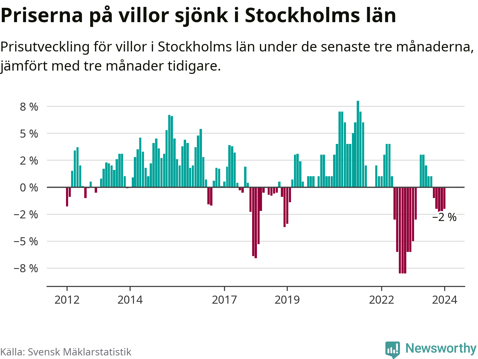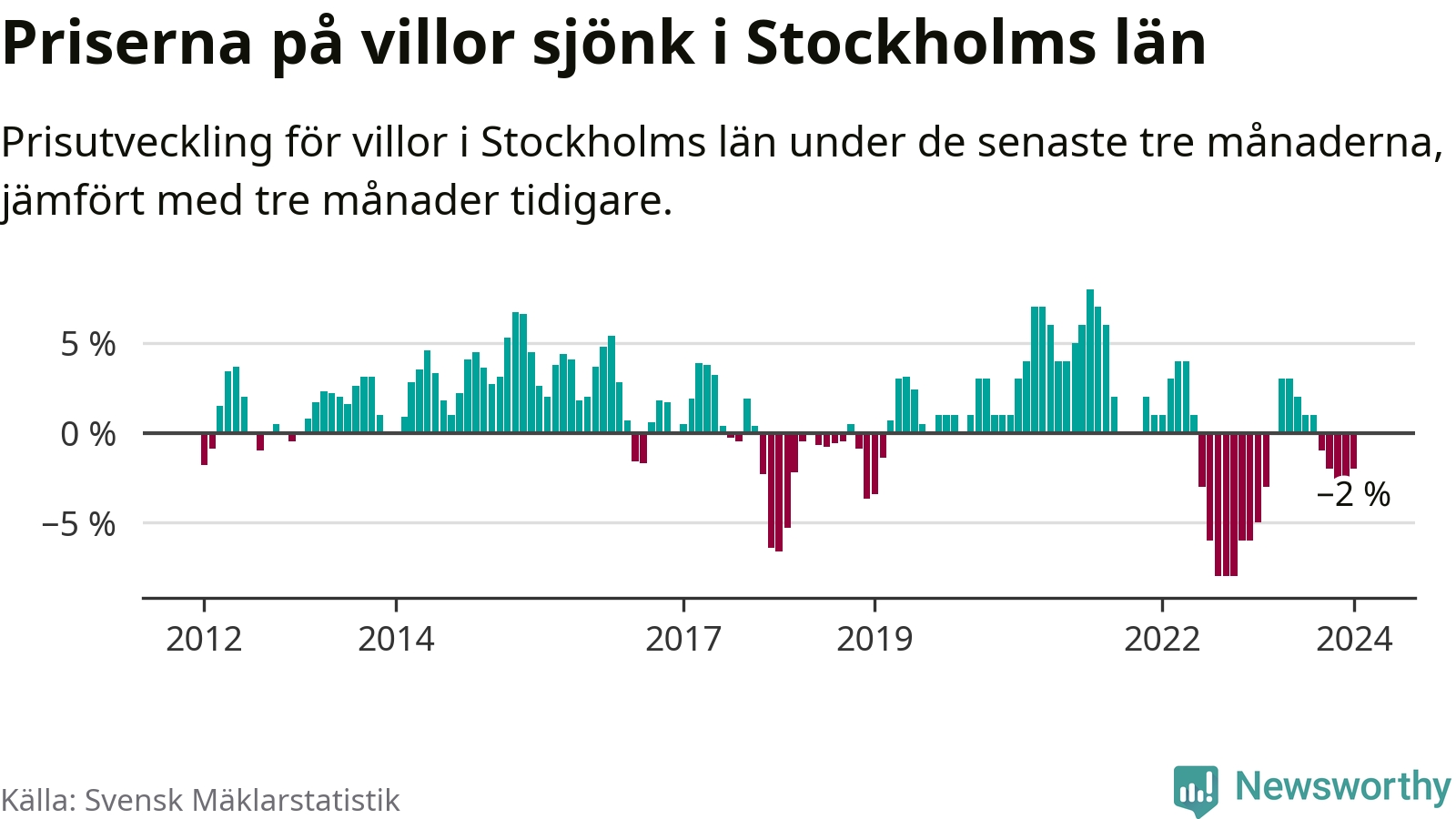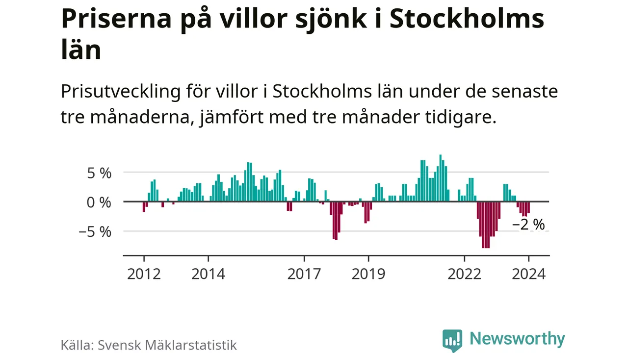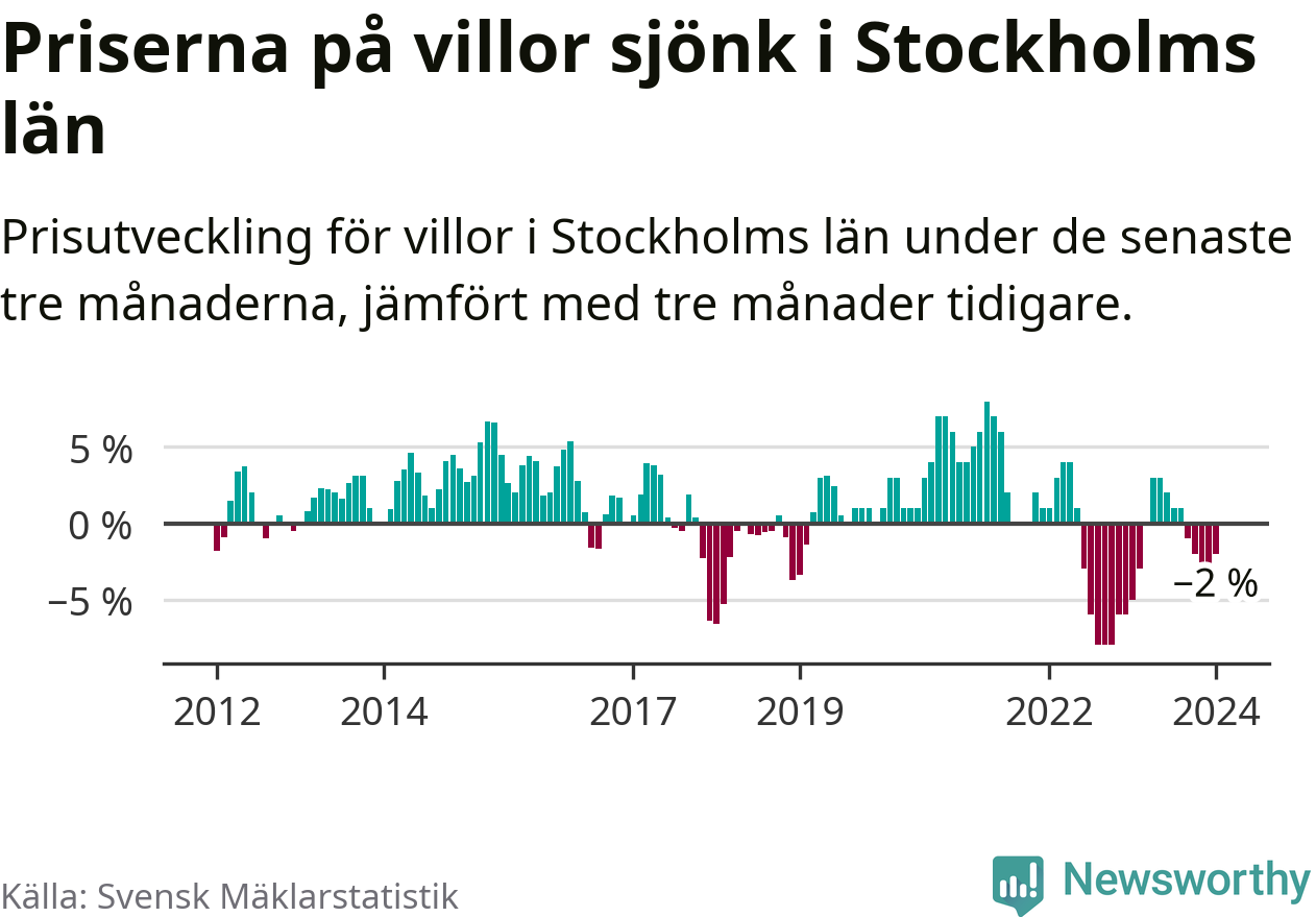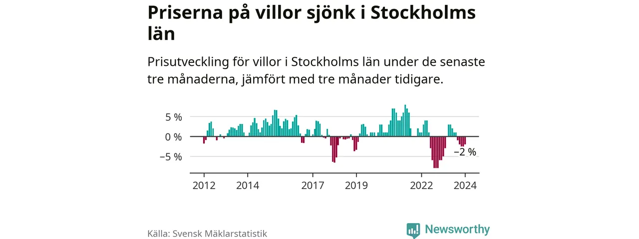 I Stockholms län som helhet går villapriserna ner med 2 procent. Även i hela Sverige sjunker villapriserna. I hela riket noterades en prisnedgång på 3 procent.