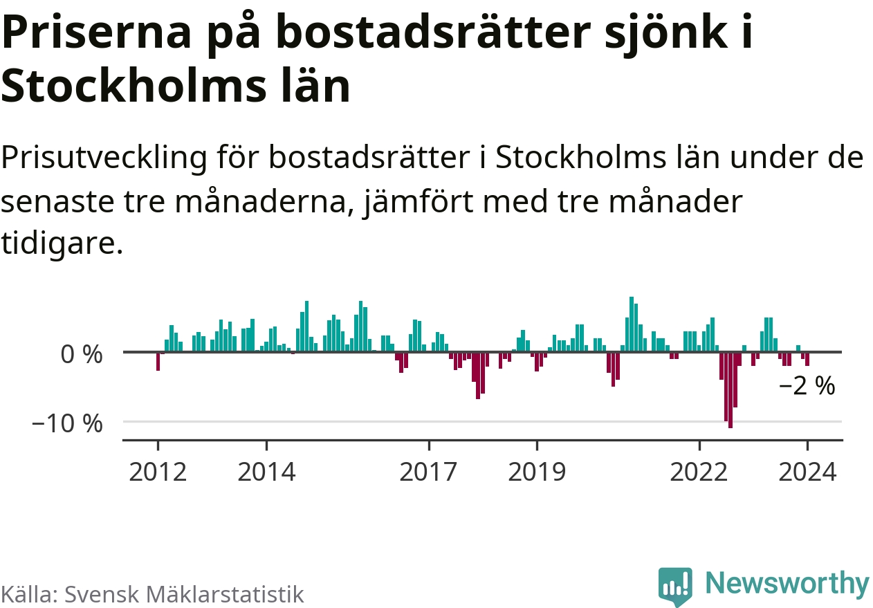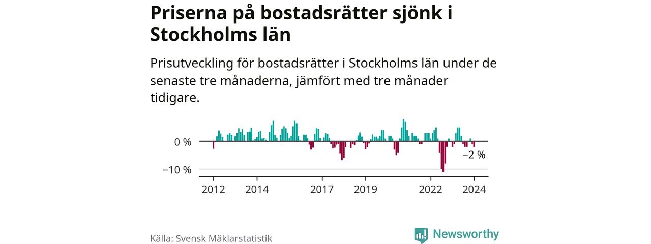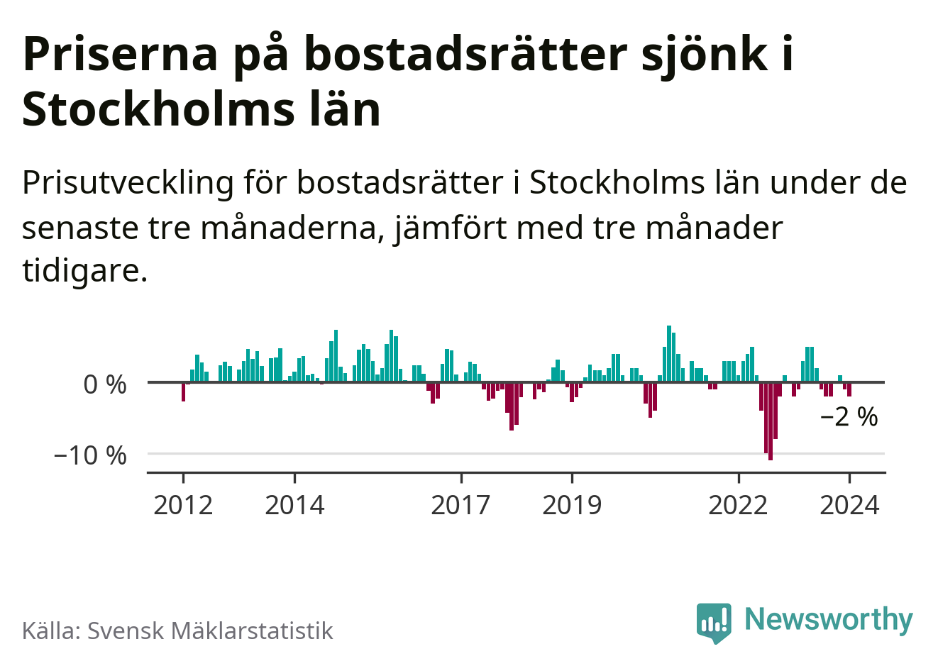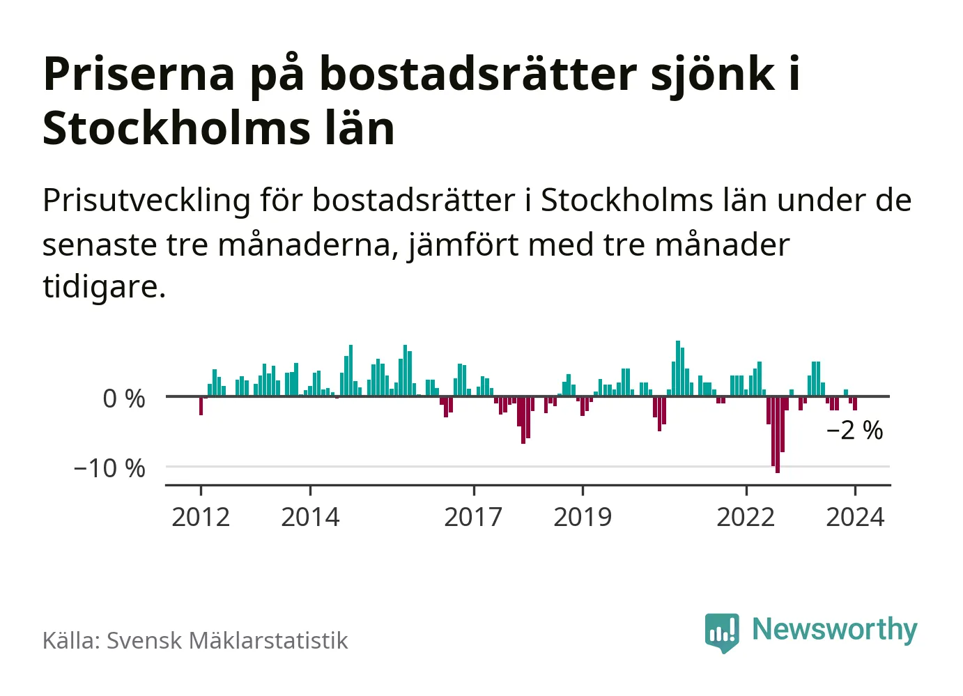 Priserna på bostadsrätter har gått ner i Stockholms län. Medelpriset på försäljningarna under de senaste tre månaderna visar på en nedgång med 2 procent.