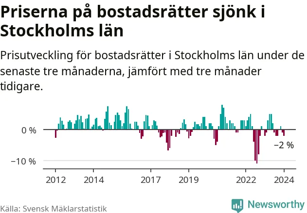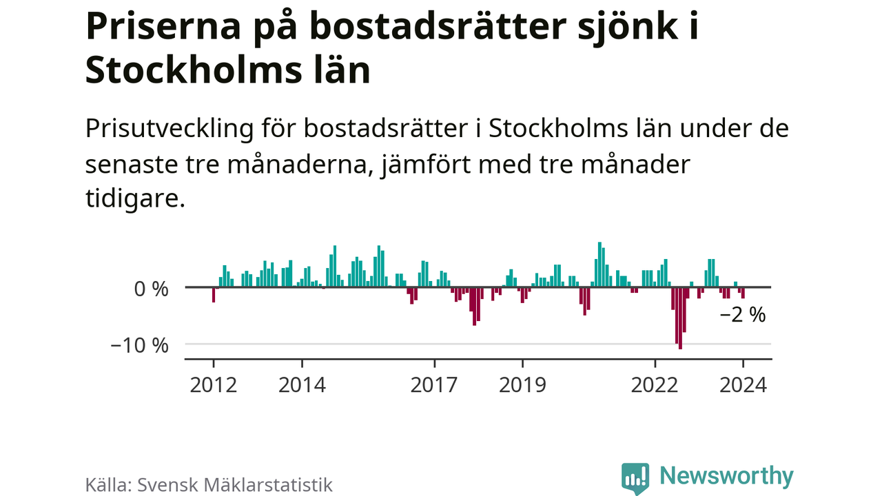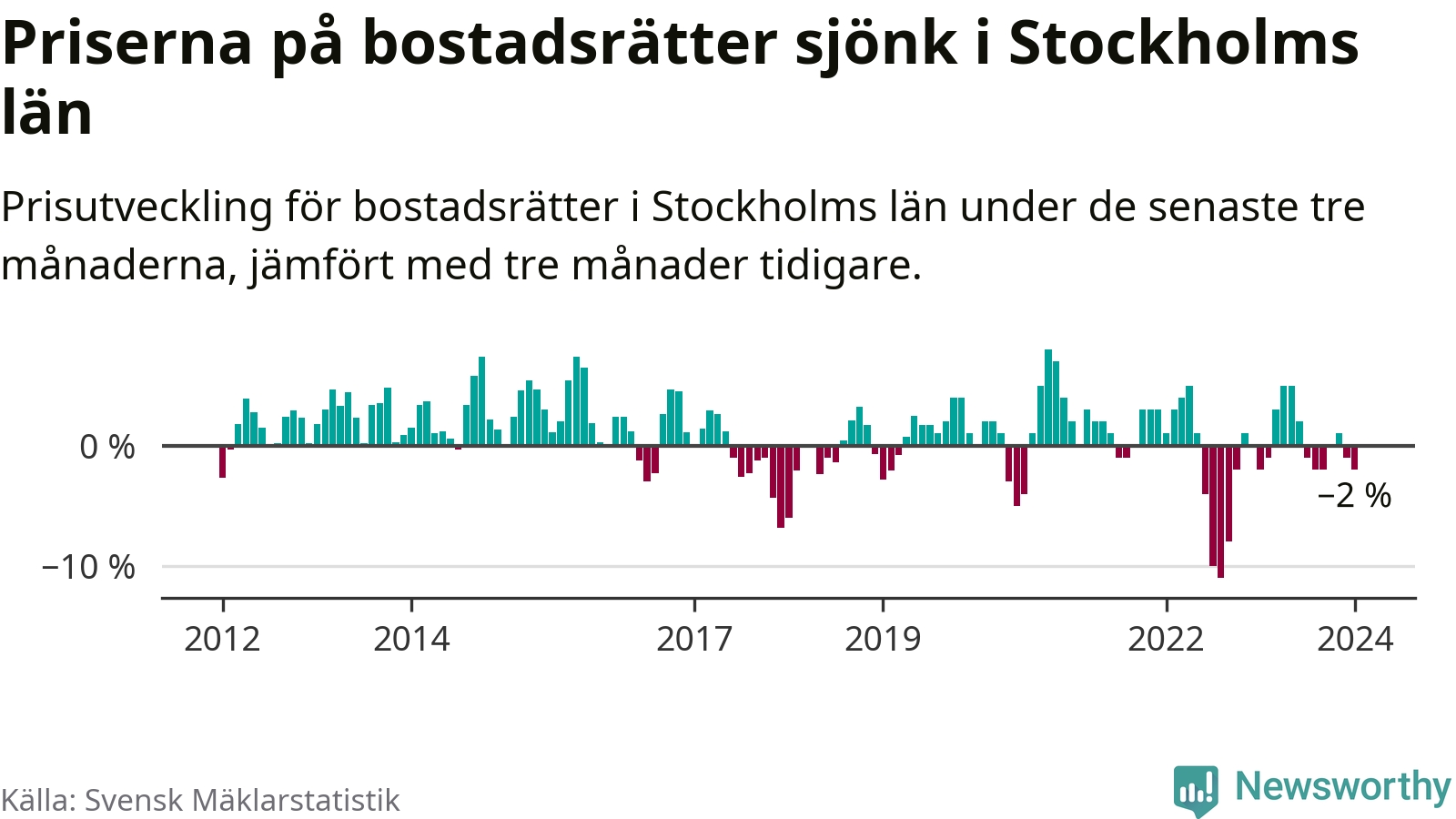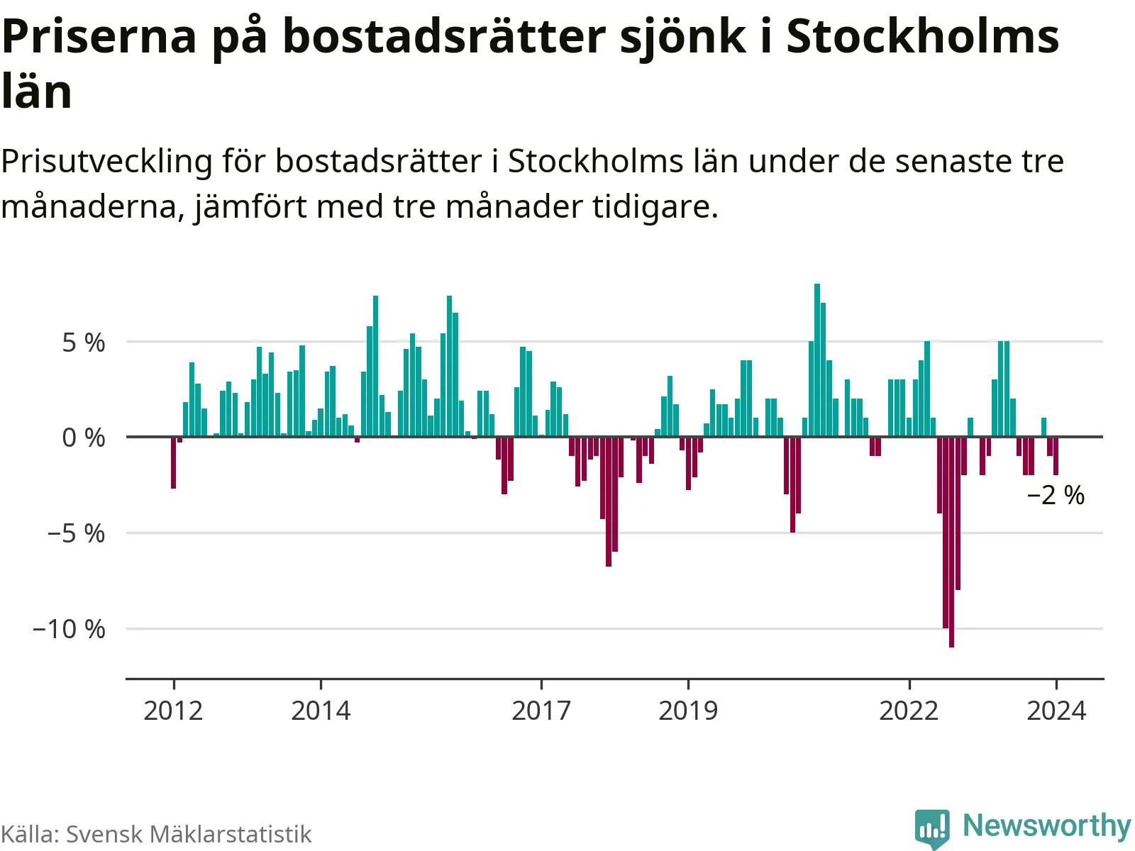 Priserna på bostadsrätter har gått ner i Stockholms län. Medelpriset på försäljningarna under de senaste tre månaderna visar på en nedgång med 2 procent.