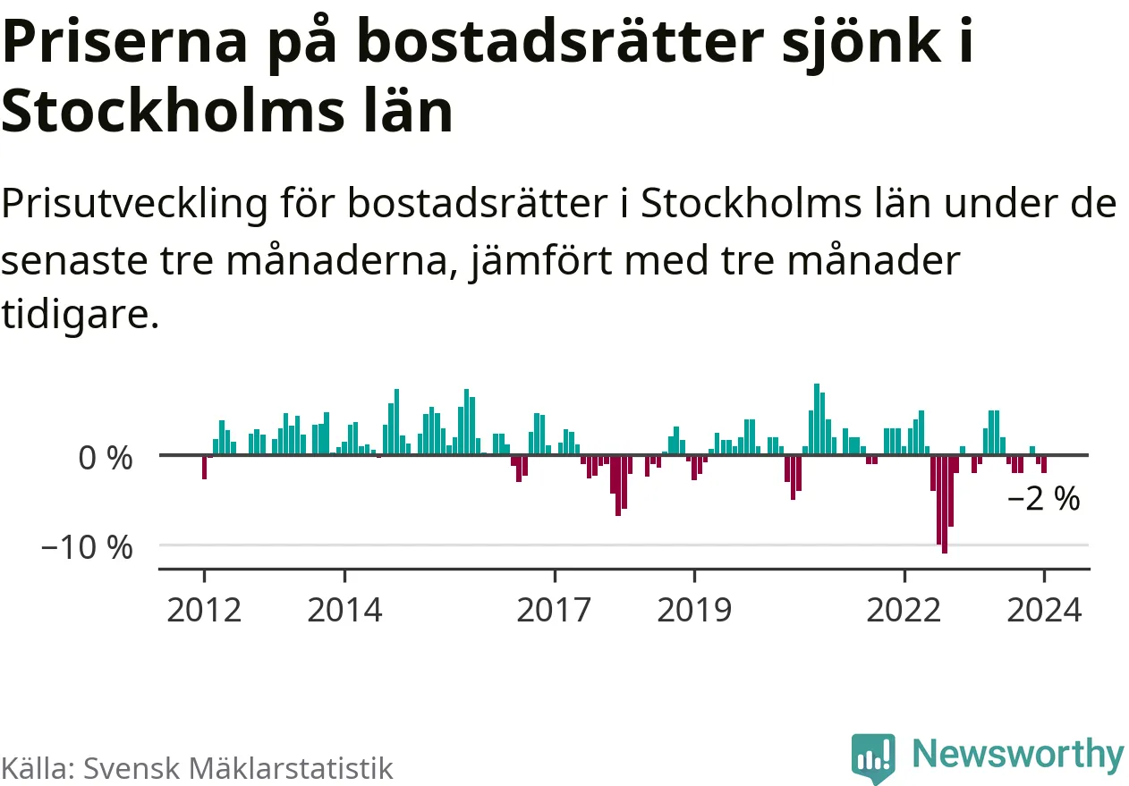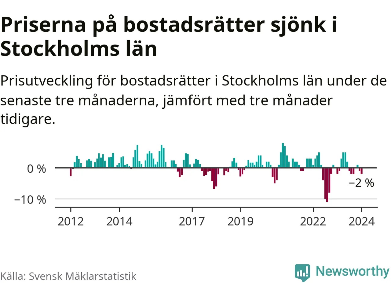 Även i hela Sverige sjunker priserna på bostadsrätter. I hela riket noterades en prisnedgång på 3 procent.