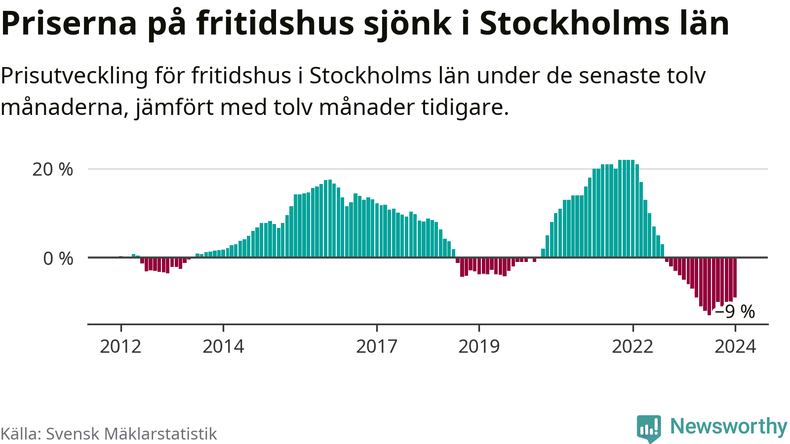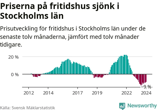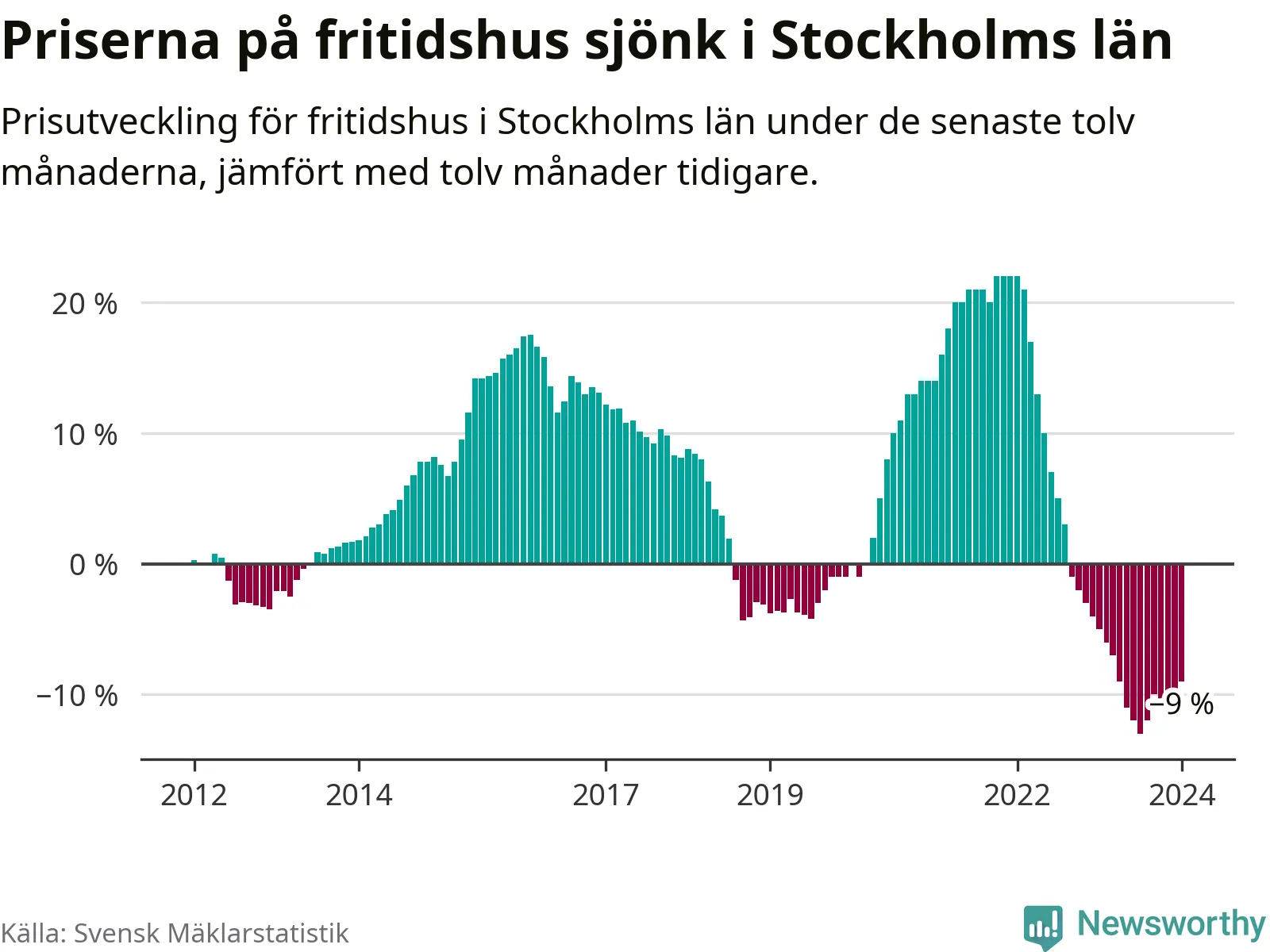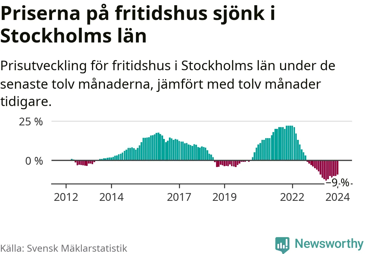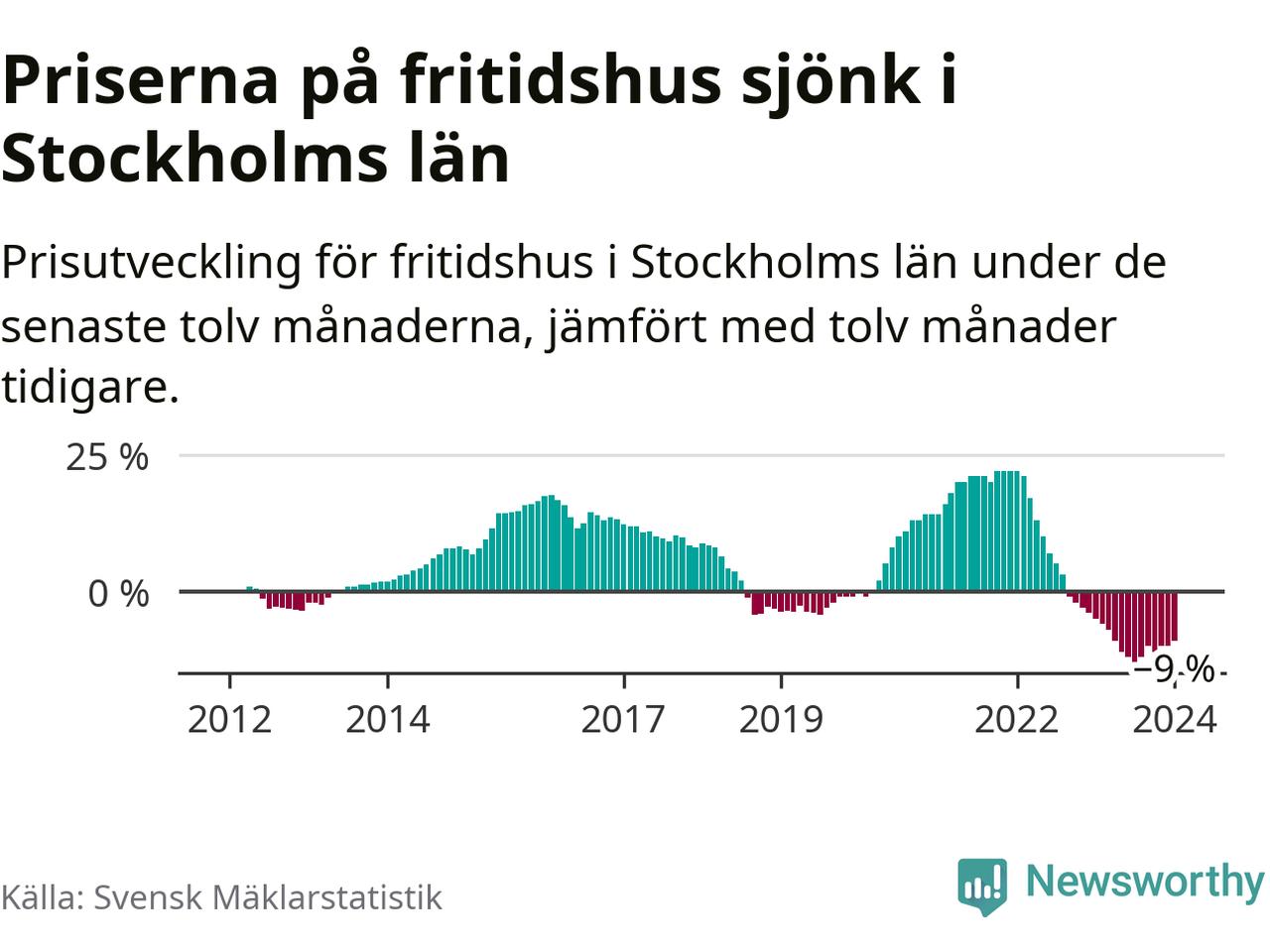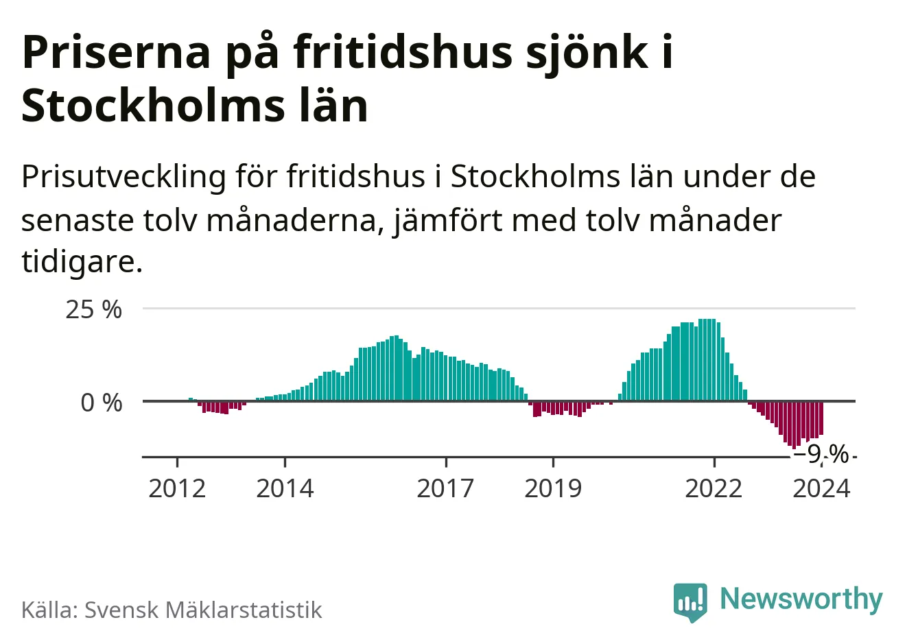 På grund av få försäljningar saknas uppgifter om prisförändringar för fritidshus i 23 av länets 26 kommuner. Bland de tre vi har uppgifter om sjunker priserna i samtliga.I Stockholms län som helhet går priserna på fritidshus ner med 9 procent. Även i hela Sverige sjunker priserna på fritidshus. I hela riket noterades en prisnedgång på 6 procent.
