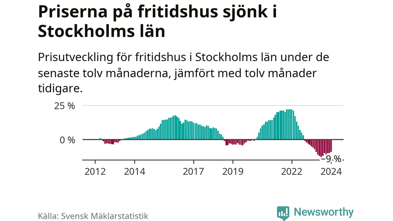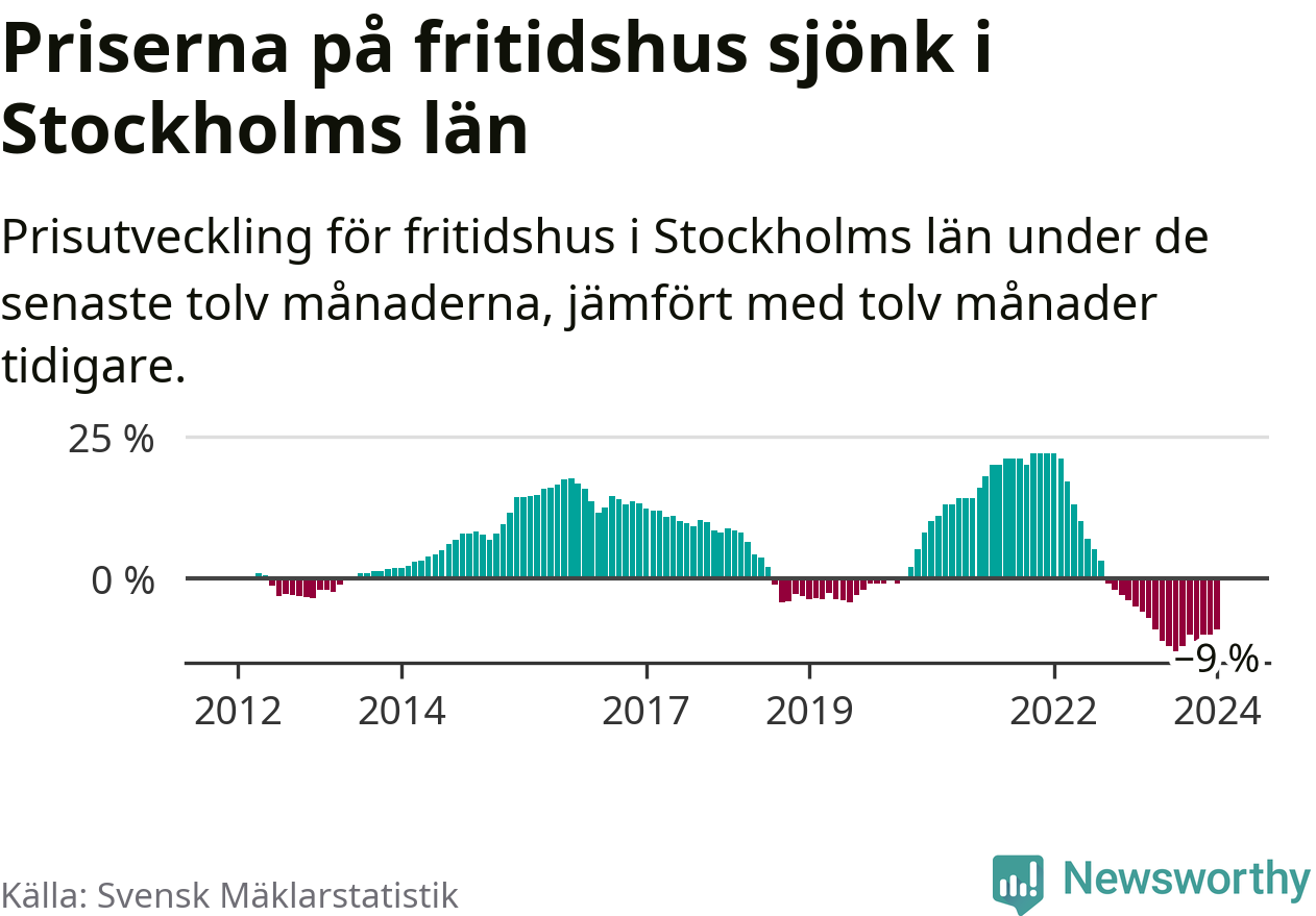En rad kommuner i Stockholms län ser en prisnedgång på fritidshus. Störst var nedgången i Österåker där priserna sjönk med 16 procent.