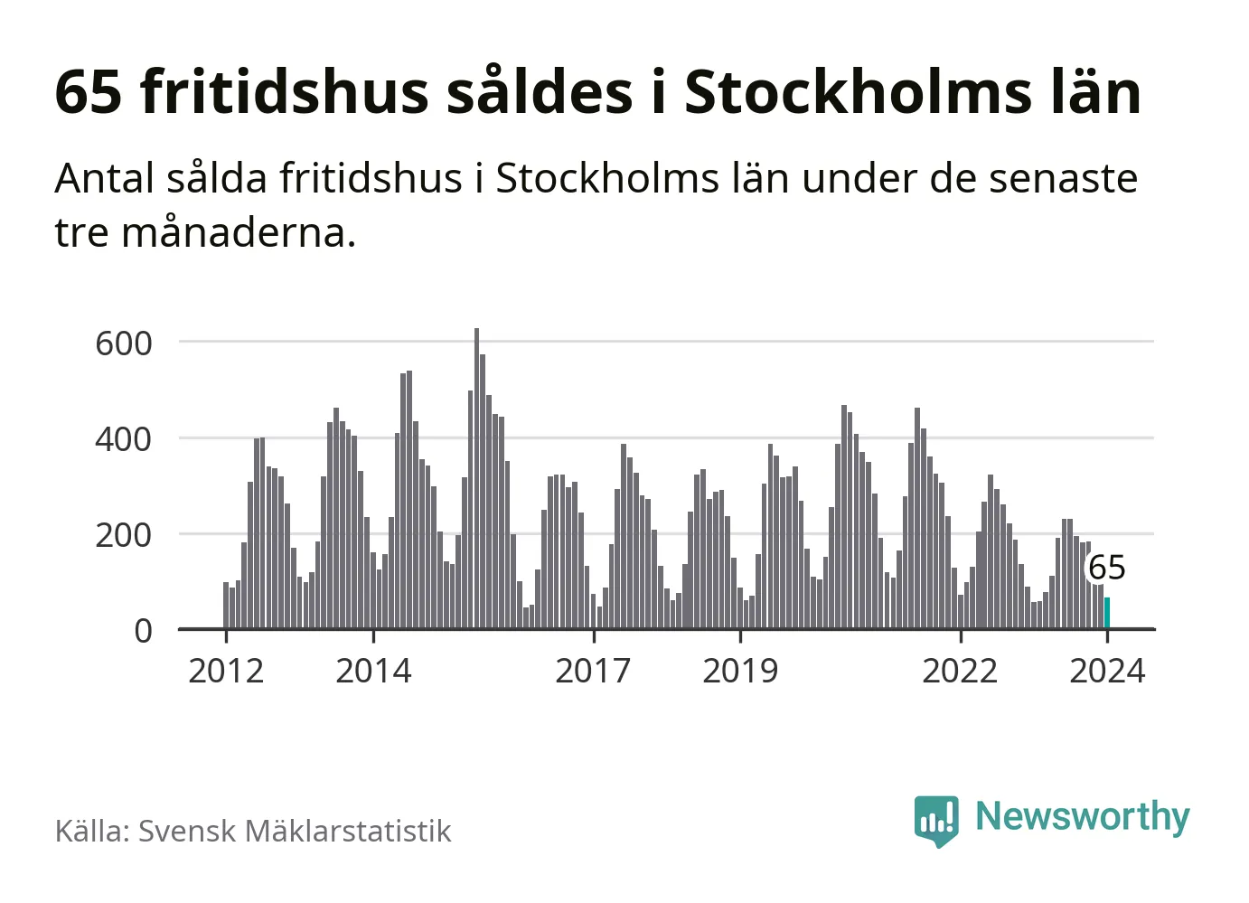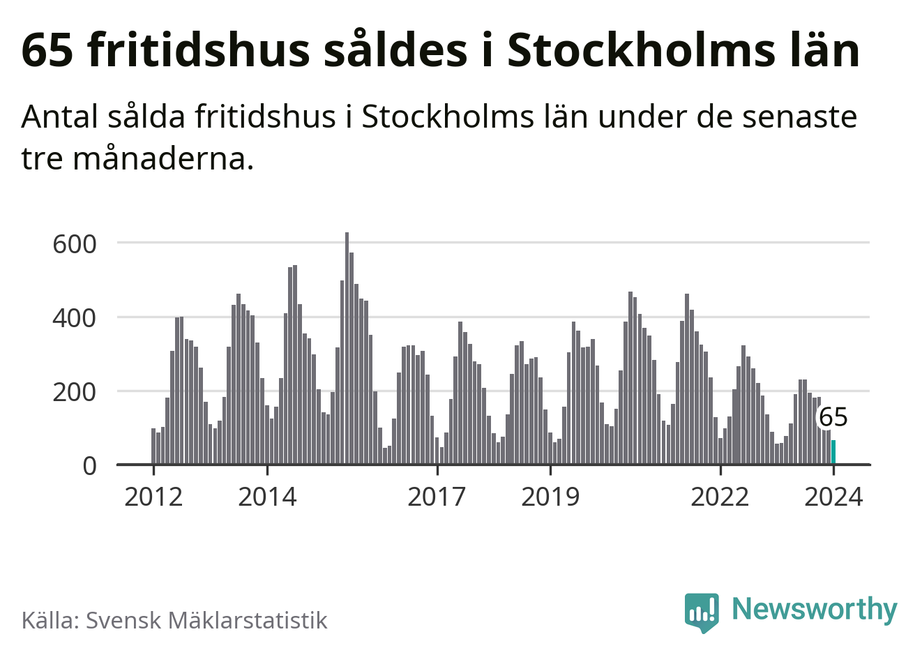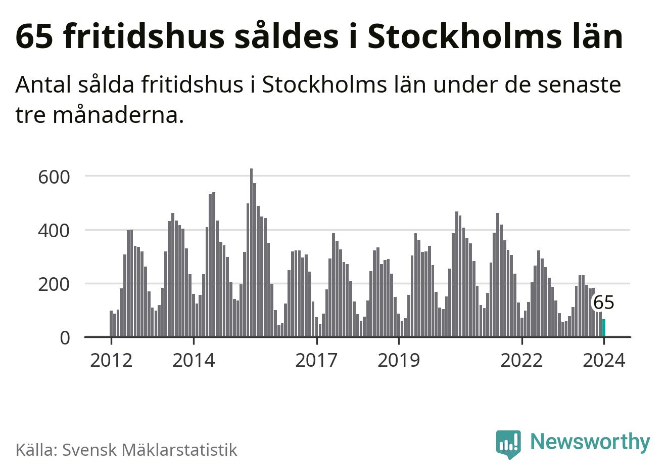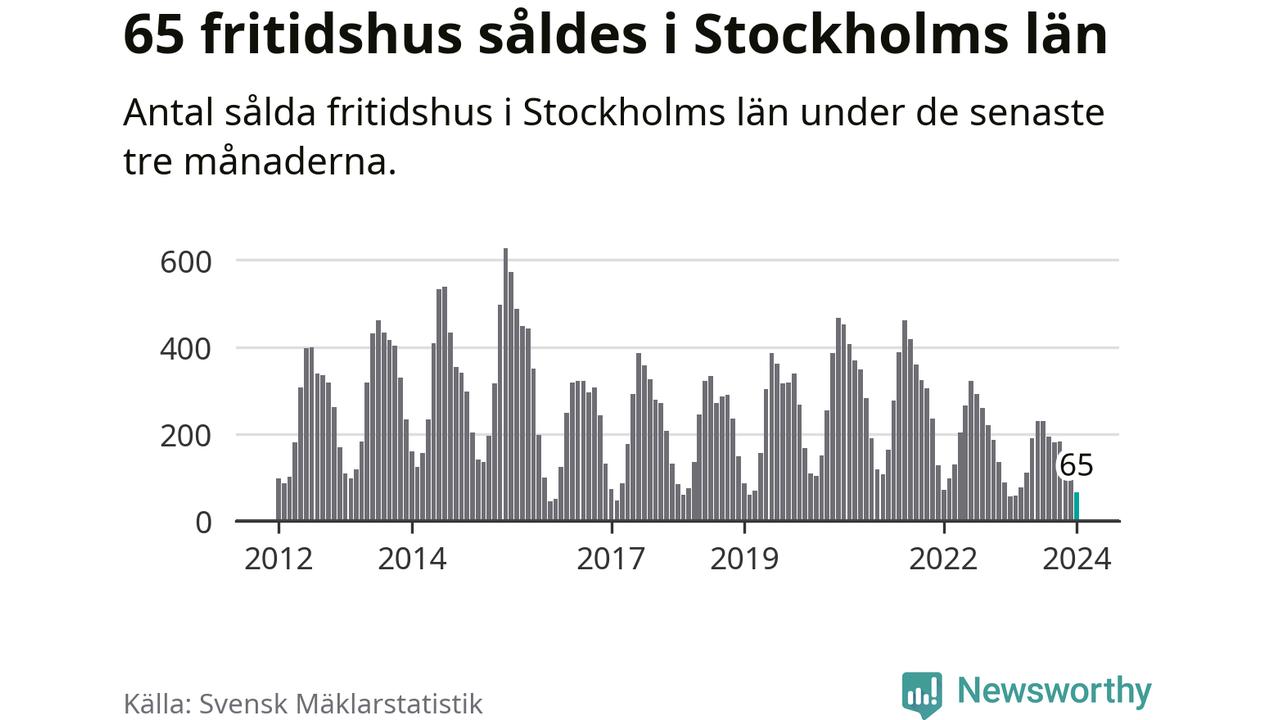 Sammanlagt såldes 65 fritidshus i Stockholms län mellan november 2023 och januari till ett genomsnittligt pris på 3,0 miljoner kronor. I fjol gjordes 56 affärer vid den här tiden på året.