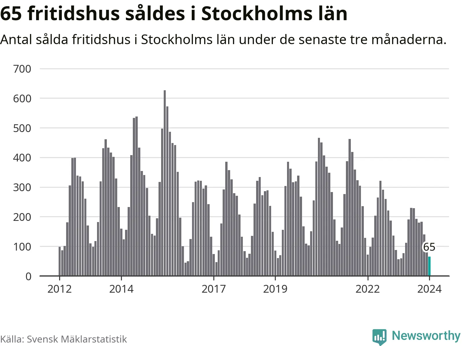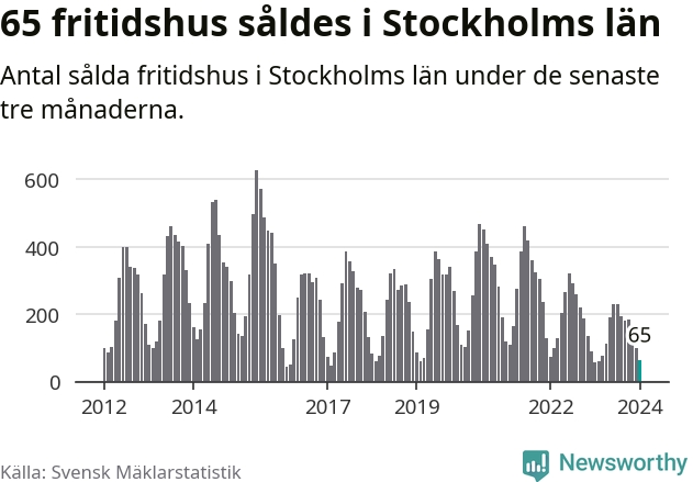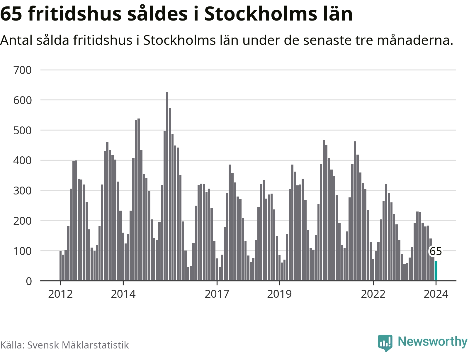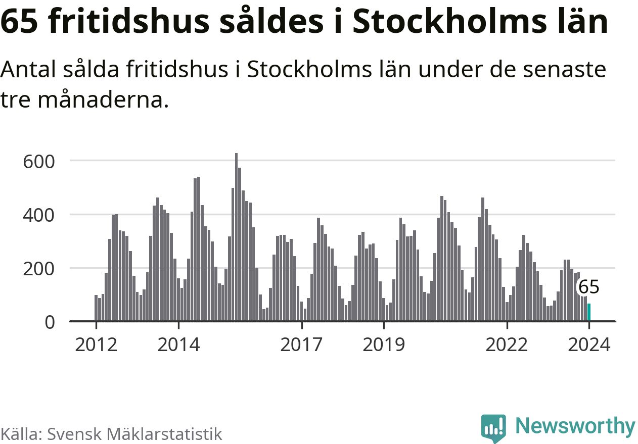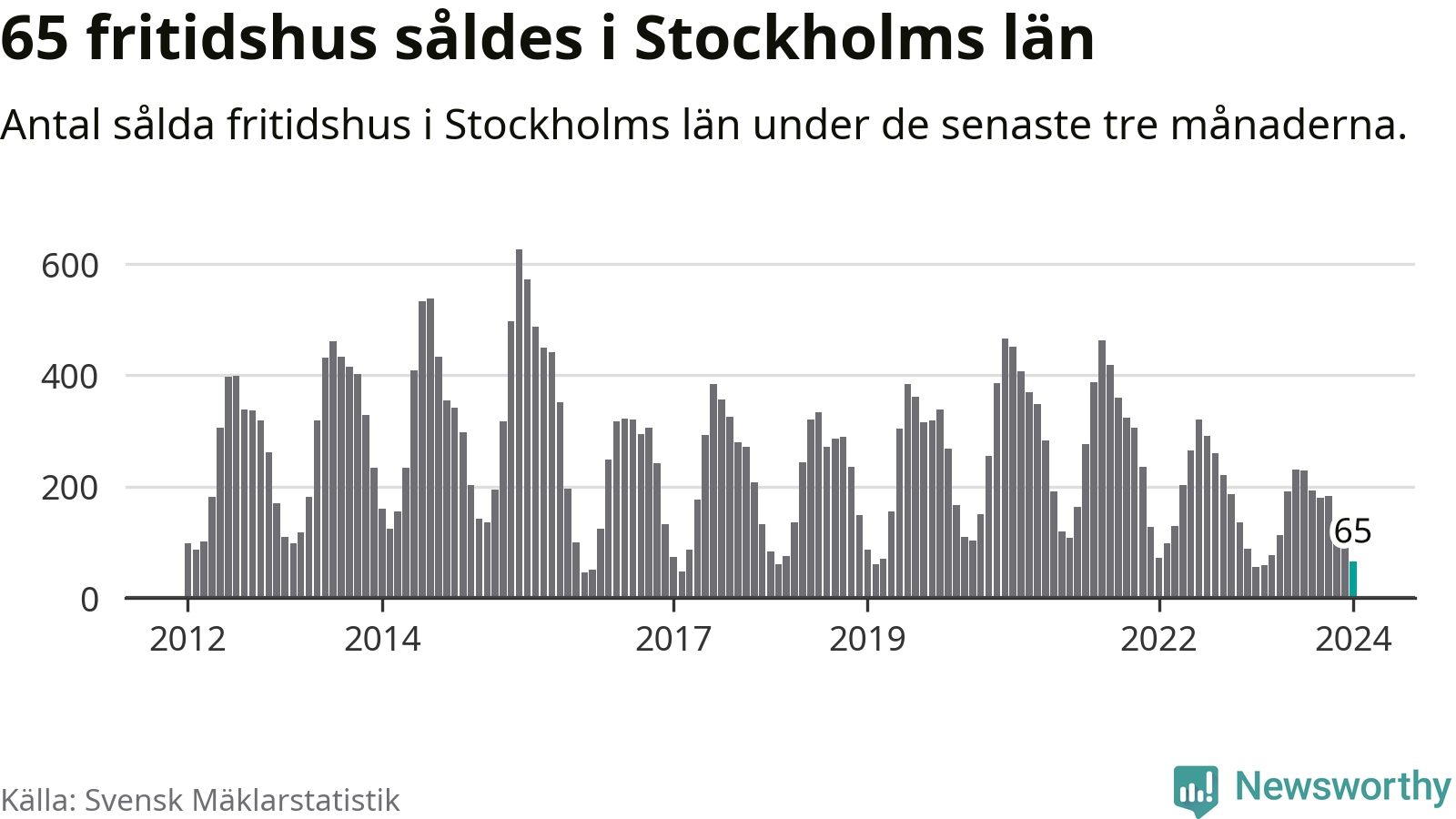 Sammanlagt såldes 65 fritidshus i Stockholms län mellan november 2023 och januari till ett genomsnittligt pris på 3,0 miljoner kronor. I fjol gjordes 56 affärer vid den här tiden på året.
