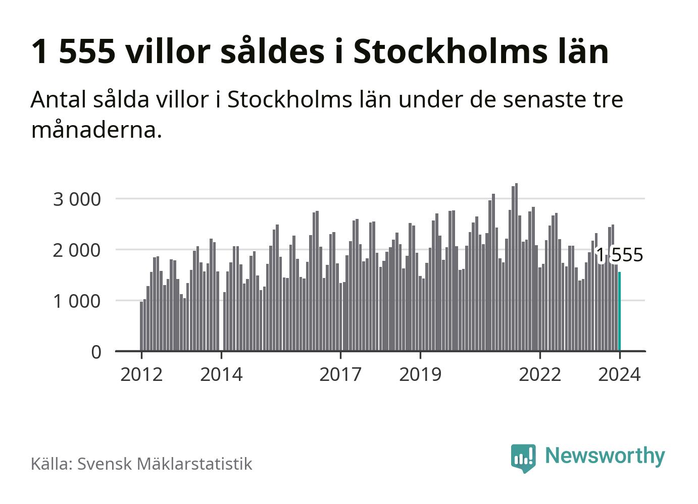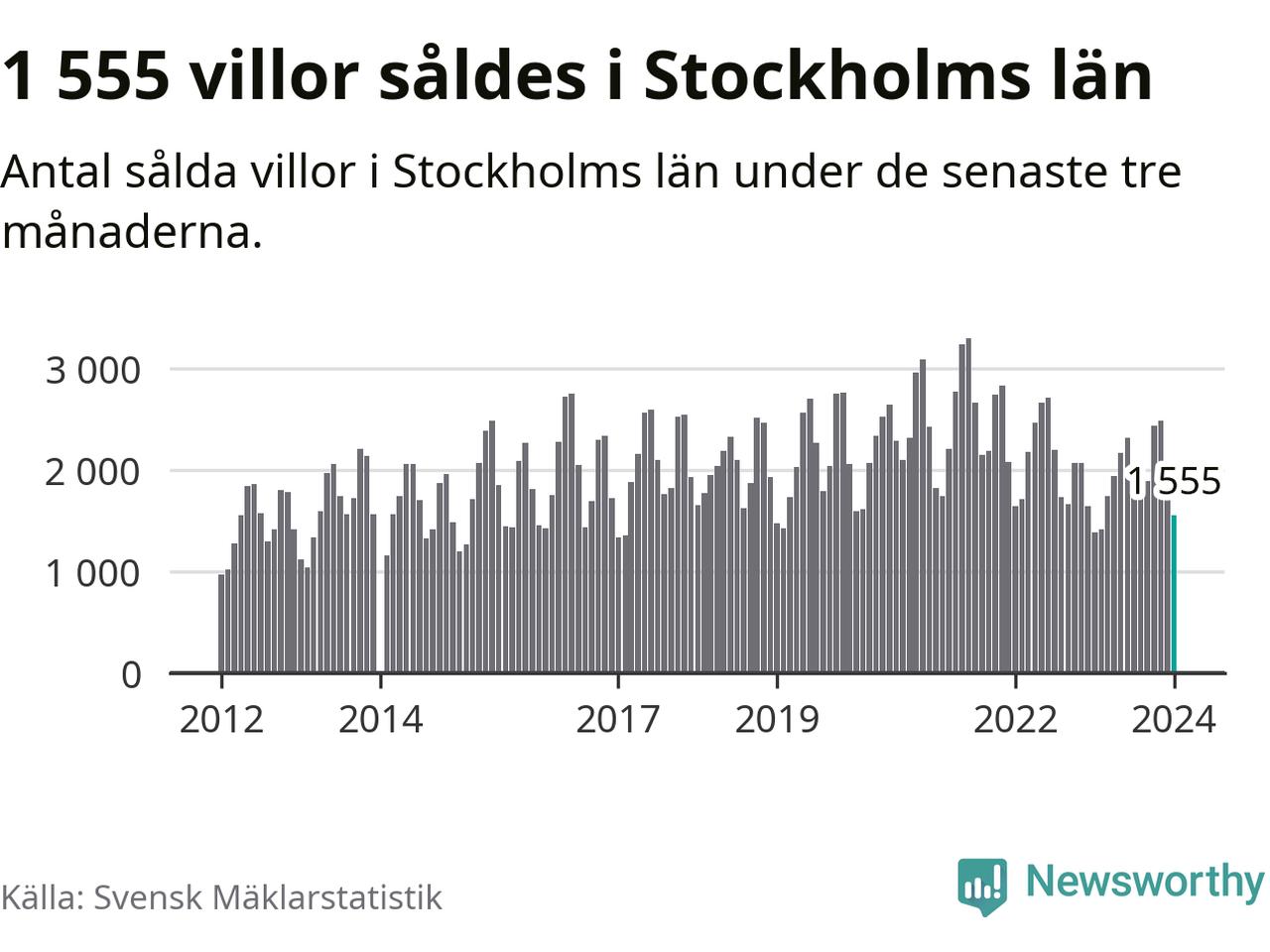 Sammanlagt såldes 1 555 villor i Stockholms län mellan november och januari till ett genomsnittligt pris på 6,5 miljoner kronor. I fjol gjordes 1 384 affärer vid den här tiden på året.