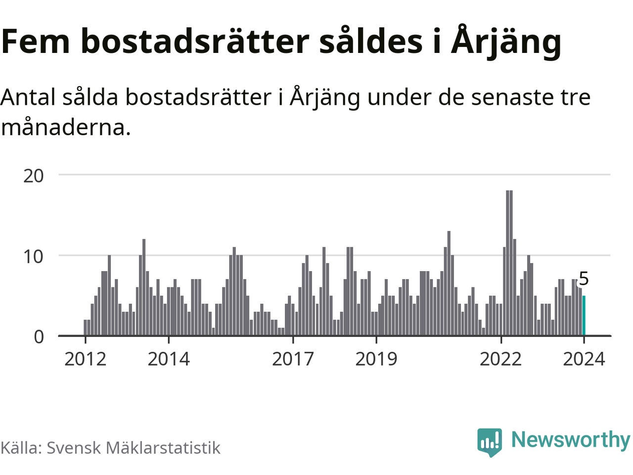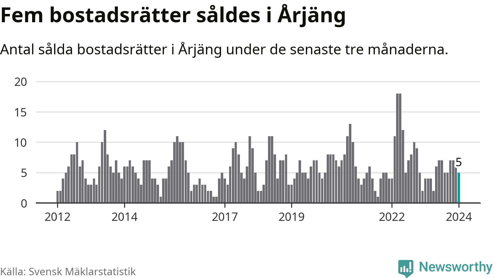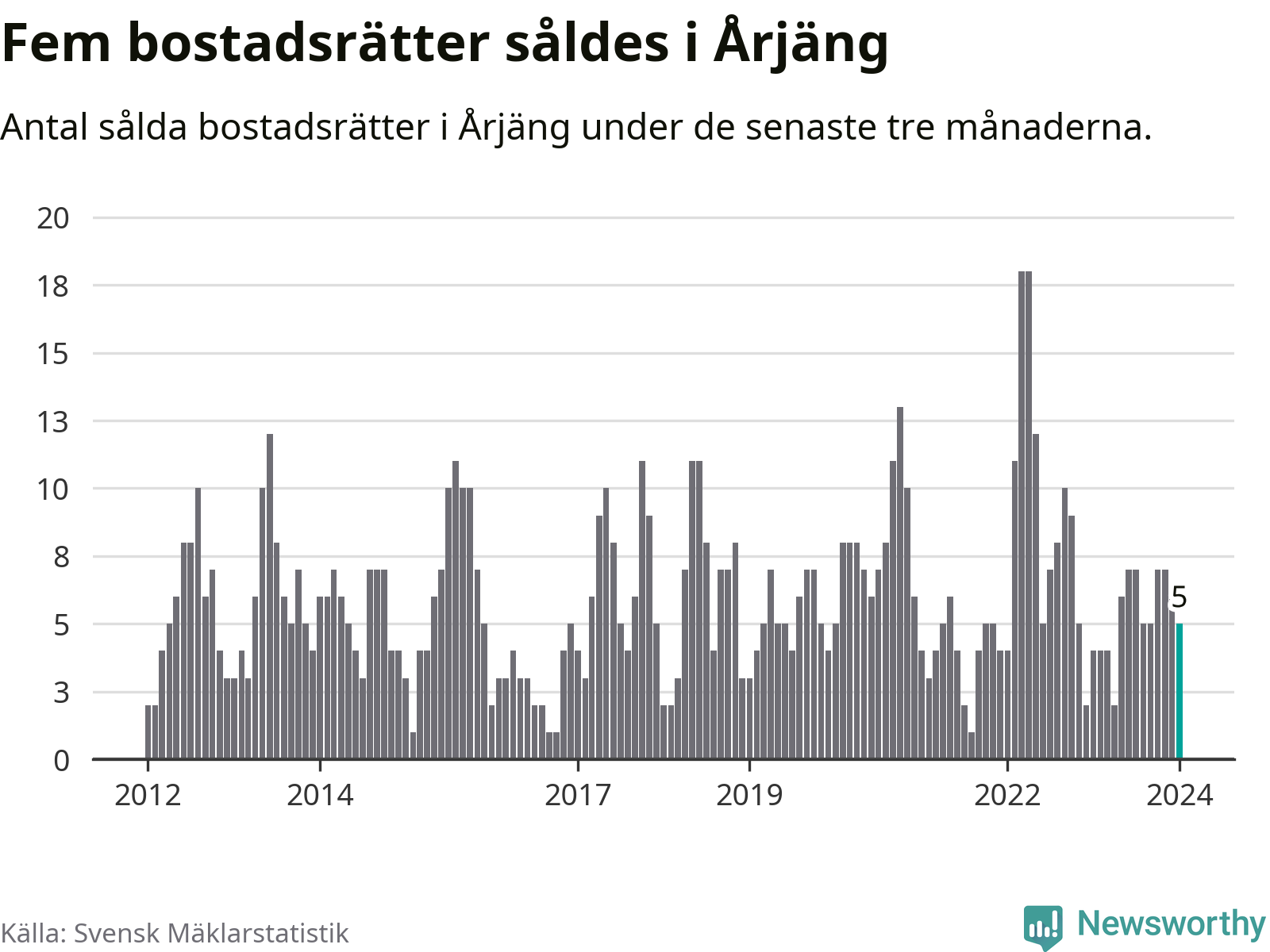 Mellan november och januari gjordes sammanlagt fem affärer med bostadsrätter i Årjängs kommun. Det kan jämföras med fyra vid motsvarande tid i fjol.