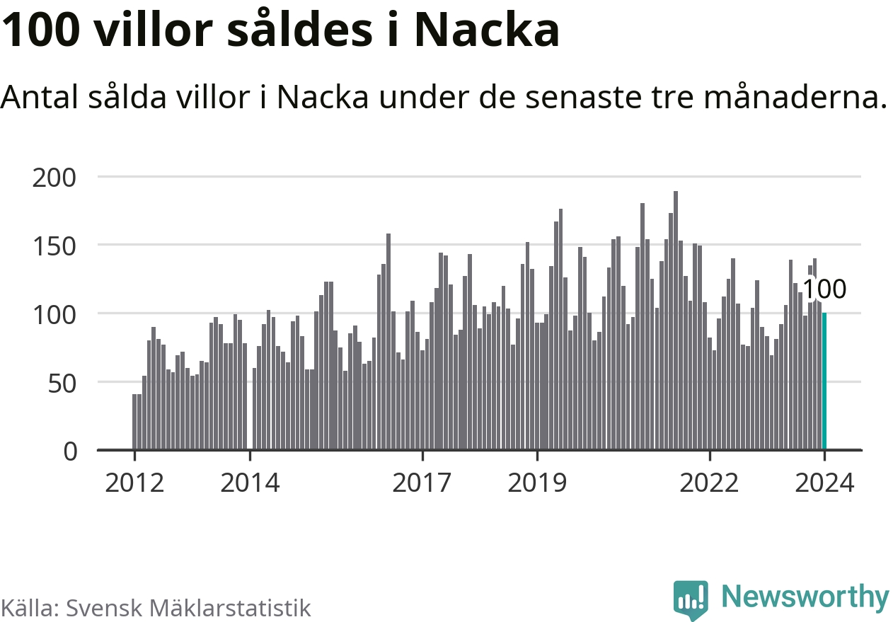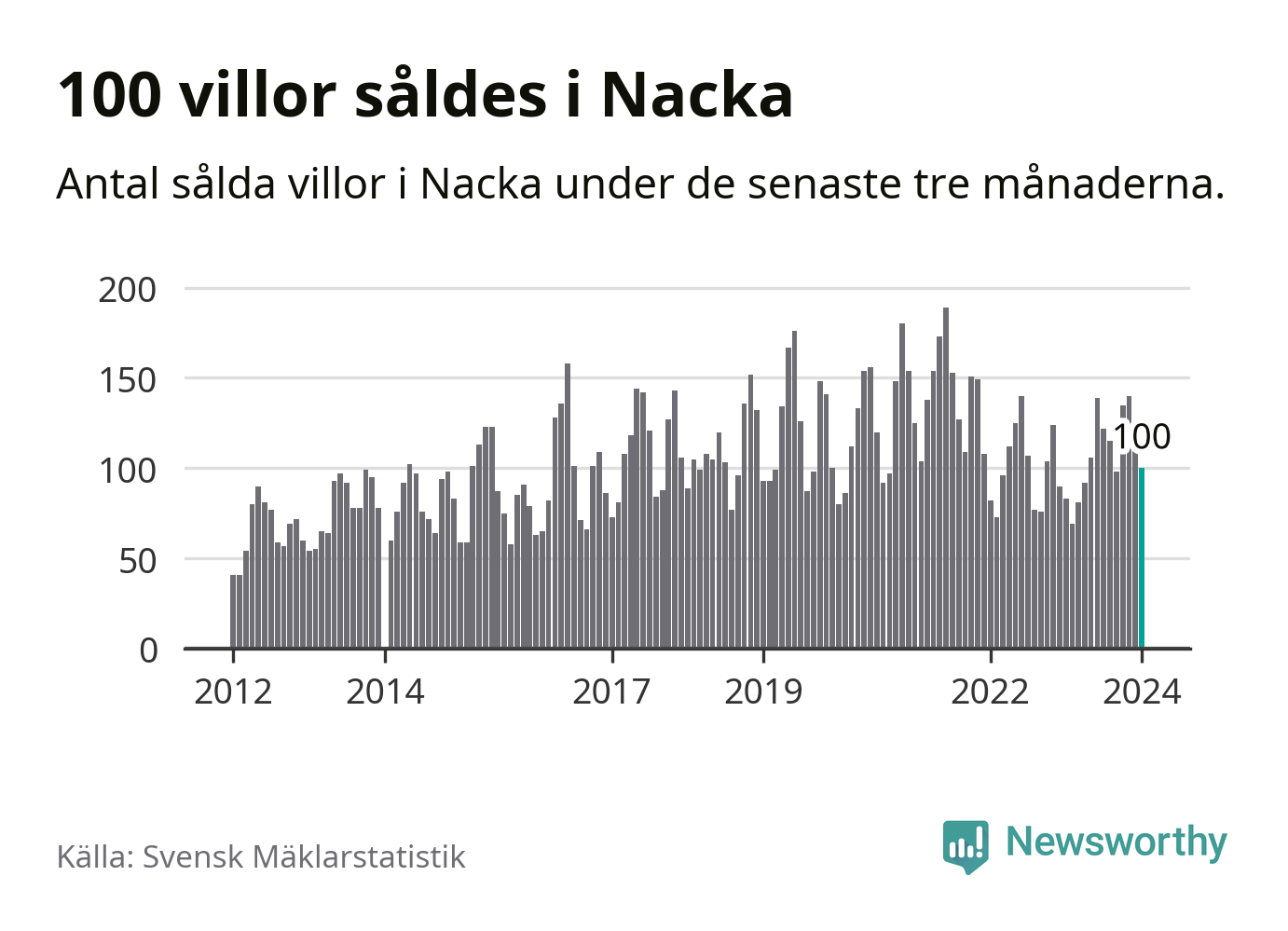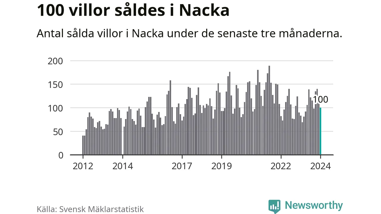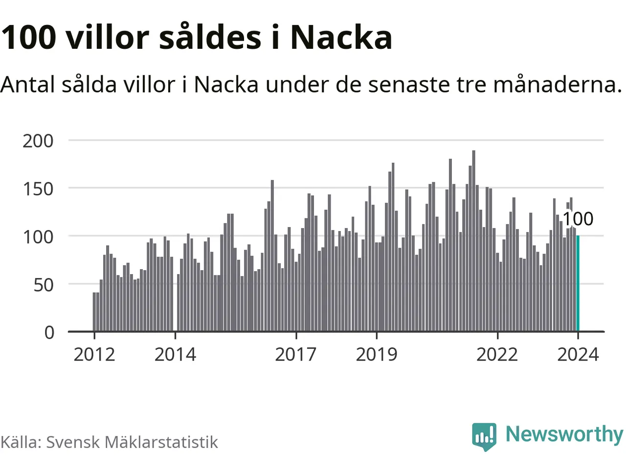 Sammanlagt såldes 100 villor i Nacka kommun mellan november och januari till ett genomsnittligt pris på 8,5 miljoner kronor. I fjol gjordes 83 affärer vid den här tiden på året.