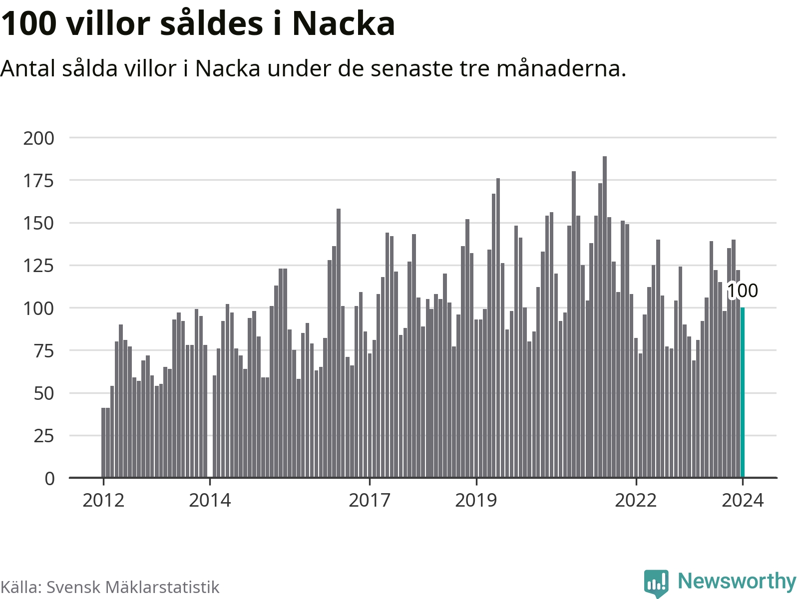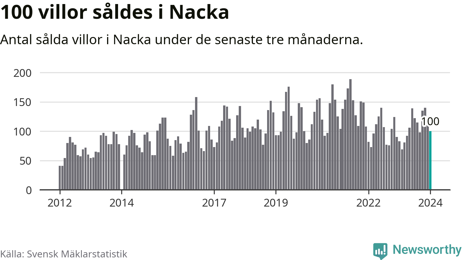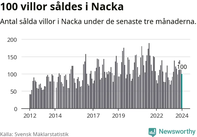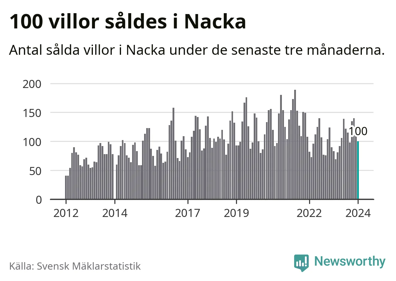 Sammanlagt såldes 100 villor i Nacka kommun mellan november och januari till ett genomsnittligt pris på 8,5 miljoner kronor. I fjol gjordes 83 affärer vid den här tiden på året.