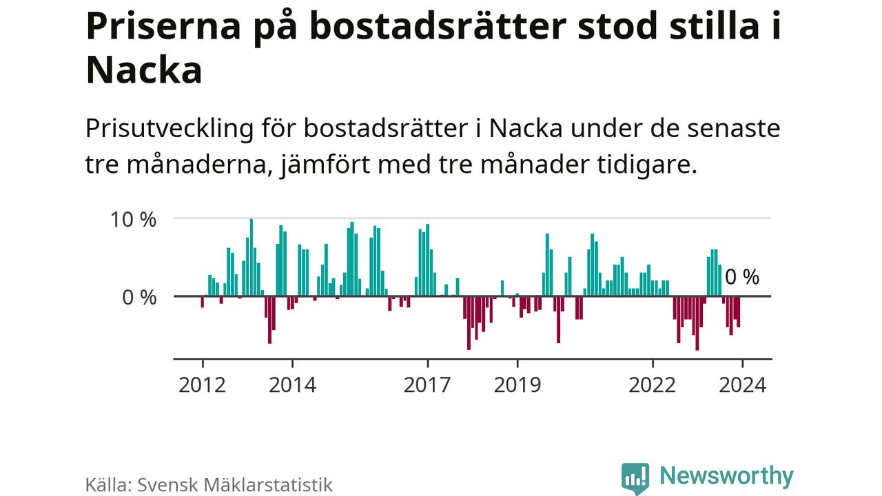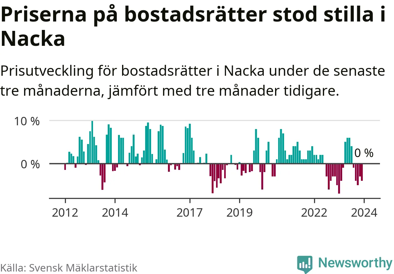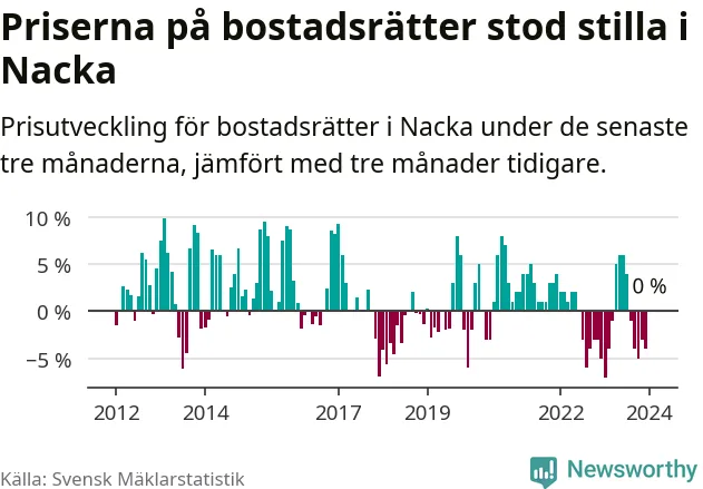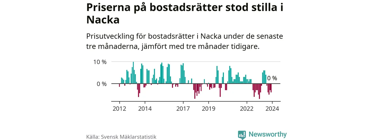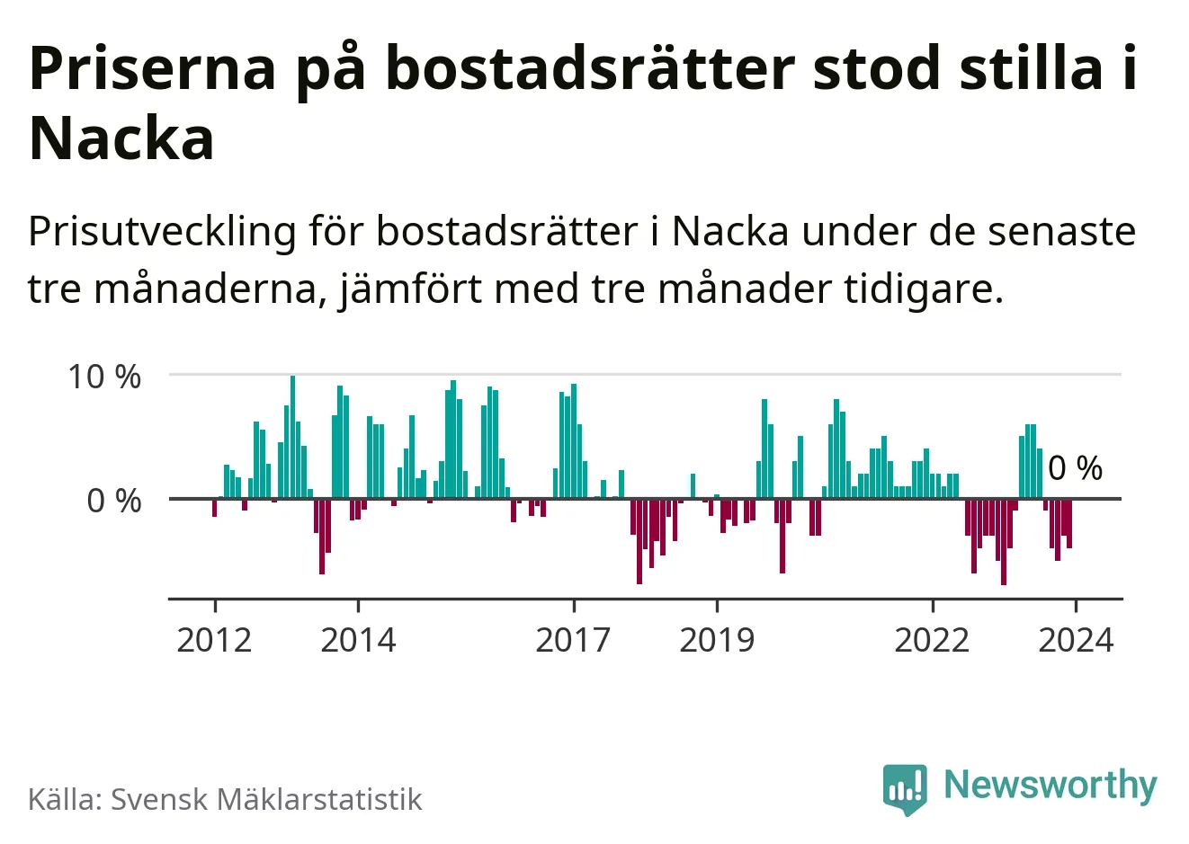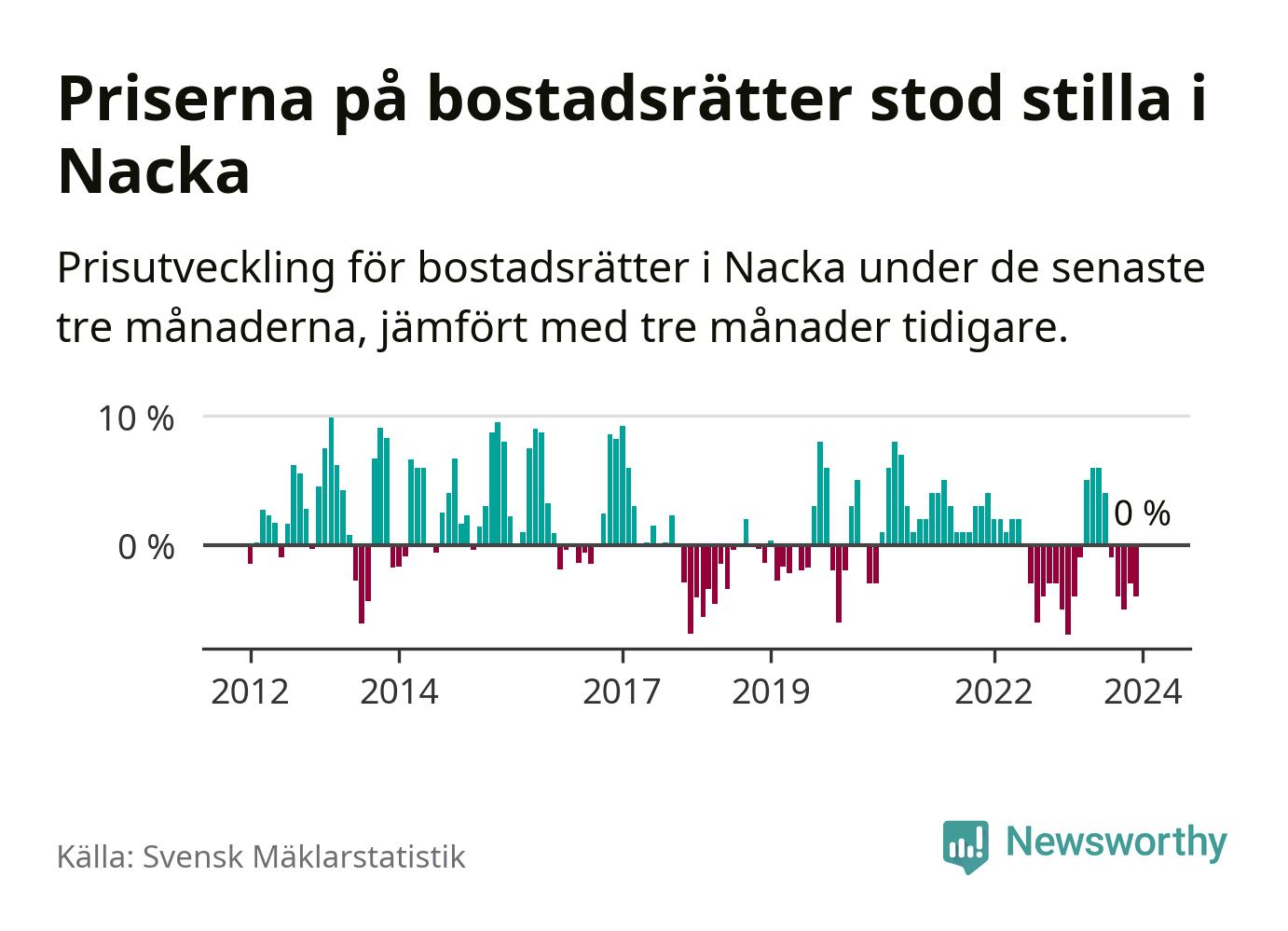 Priserna på bostadsrätter står i stort sett stilla i Nacka kommun. Medelpriset på de på försäljningarna under de senaste tre månaderna låg på samma nivå som för tre månader sedan.