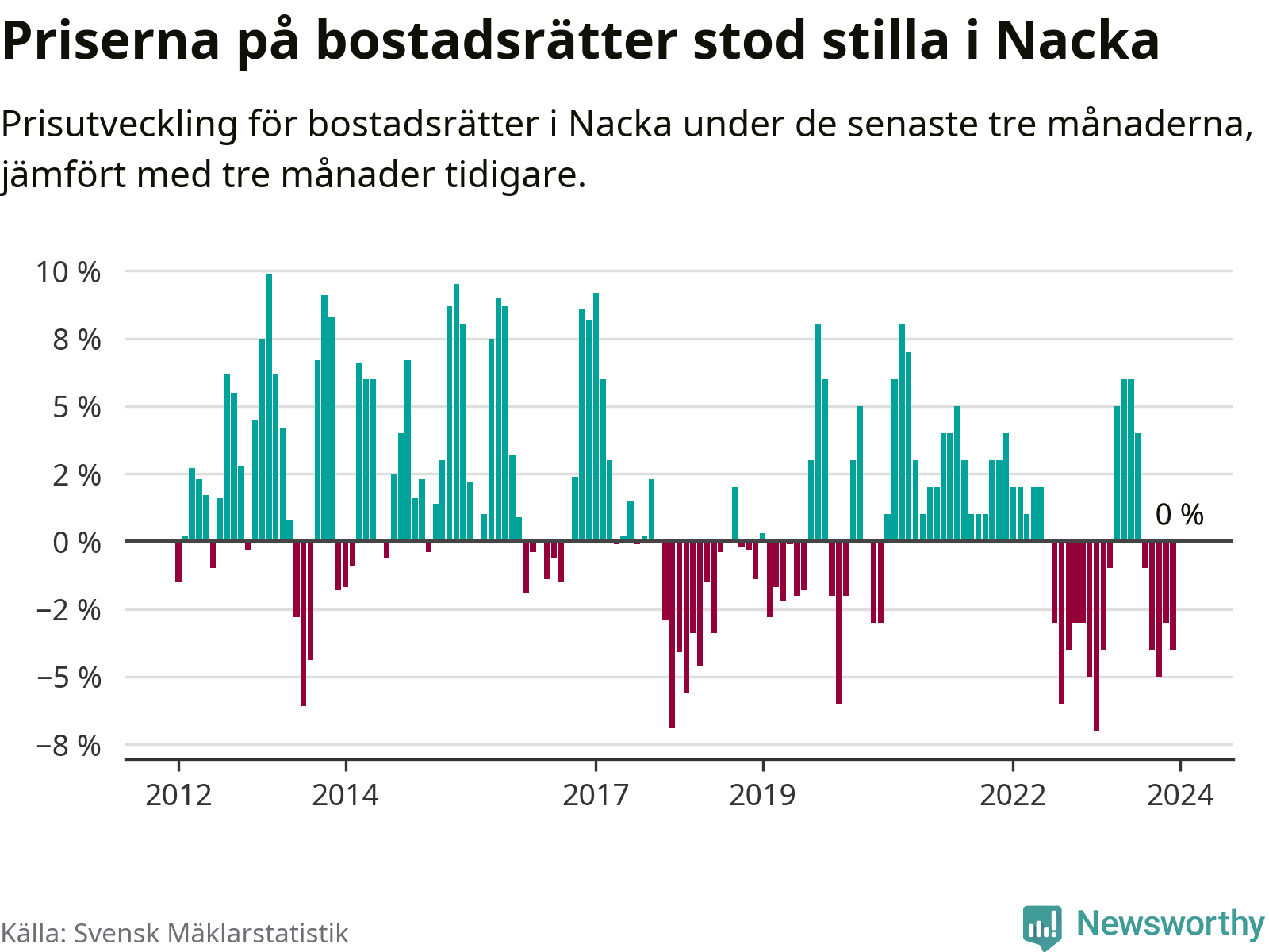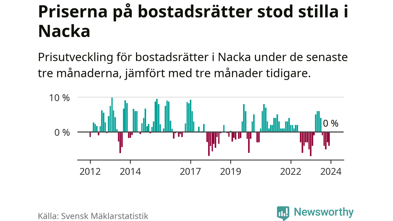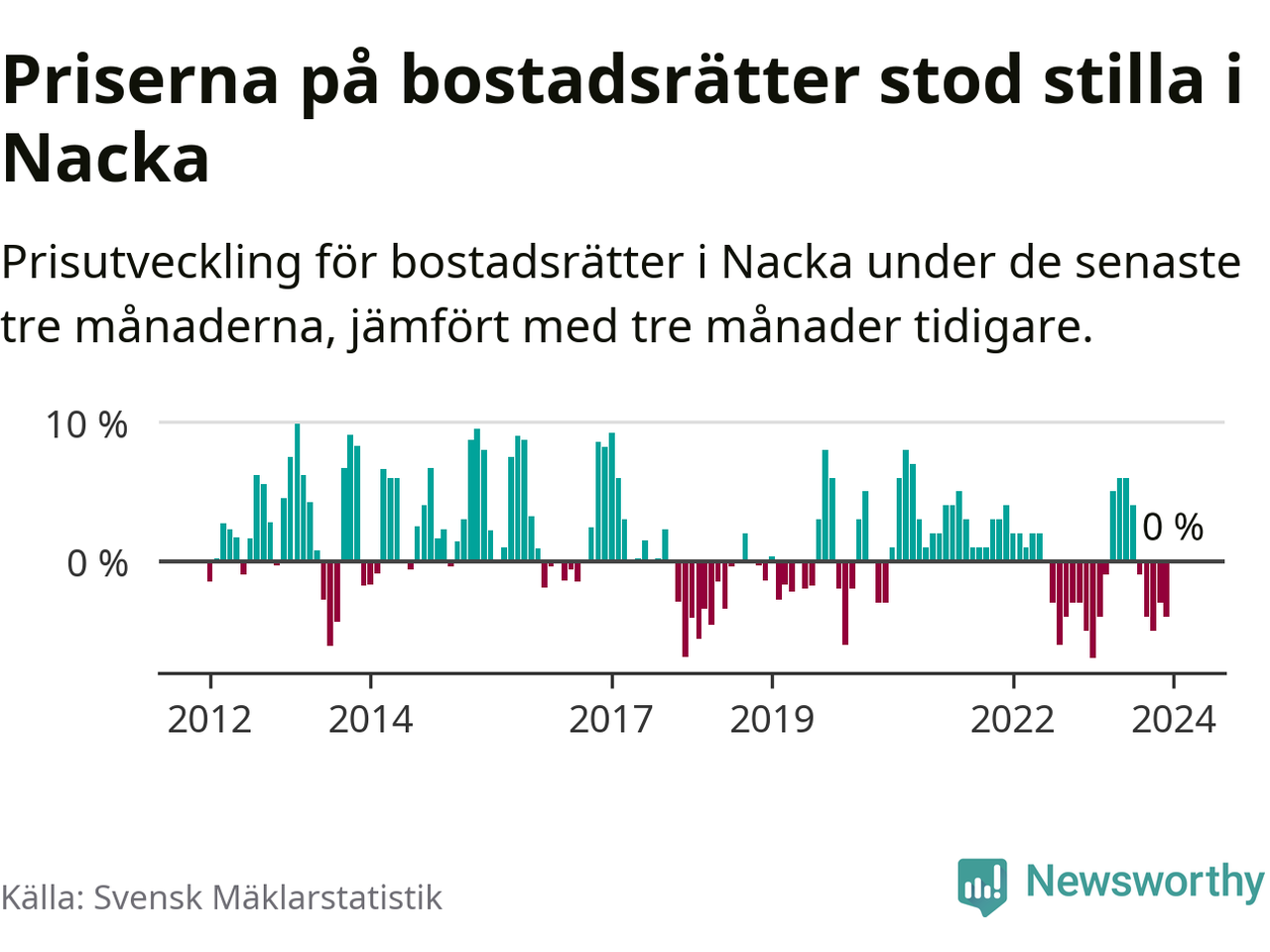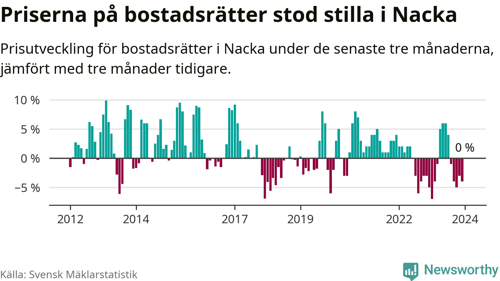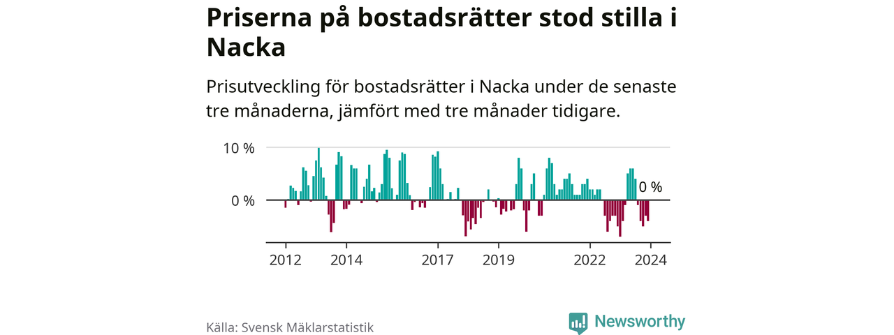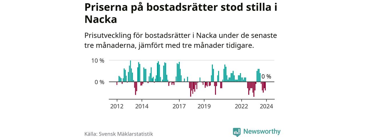 Priserna på bostadsrätter står i stort sett stilla i Nacka kommun. Medelpriset på de på försäljningarna under de senaste tre månaderna låg på samma nivå som för tre månader sedan.