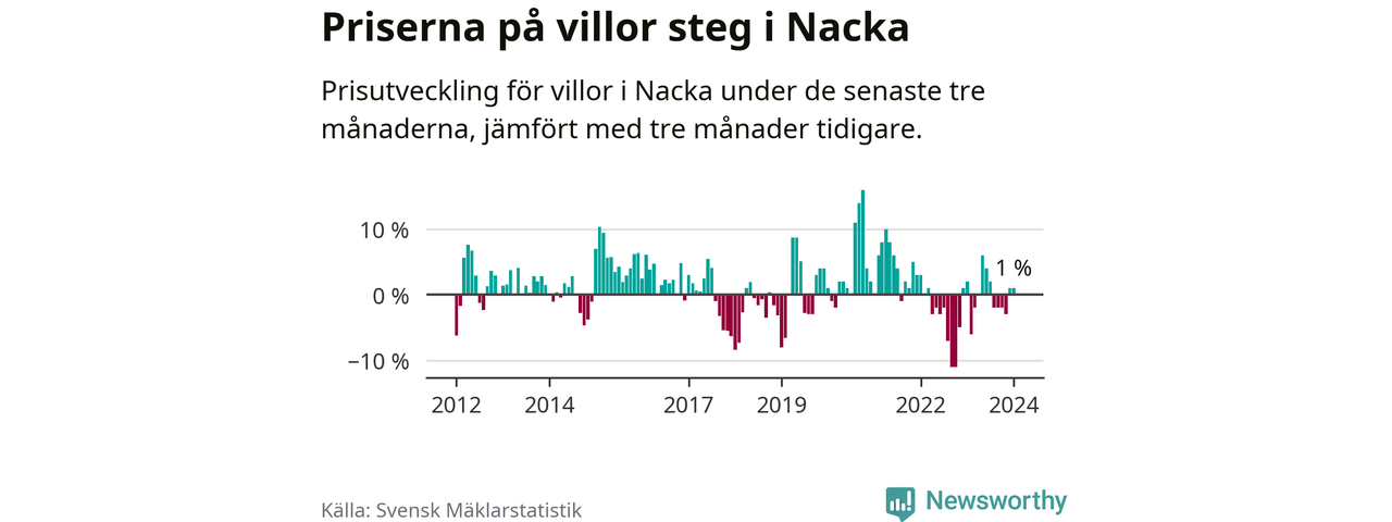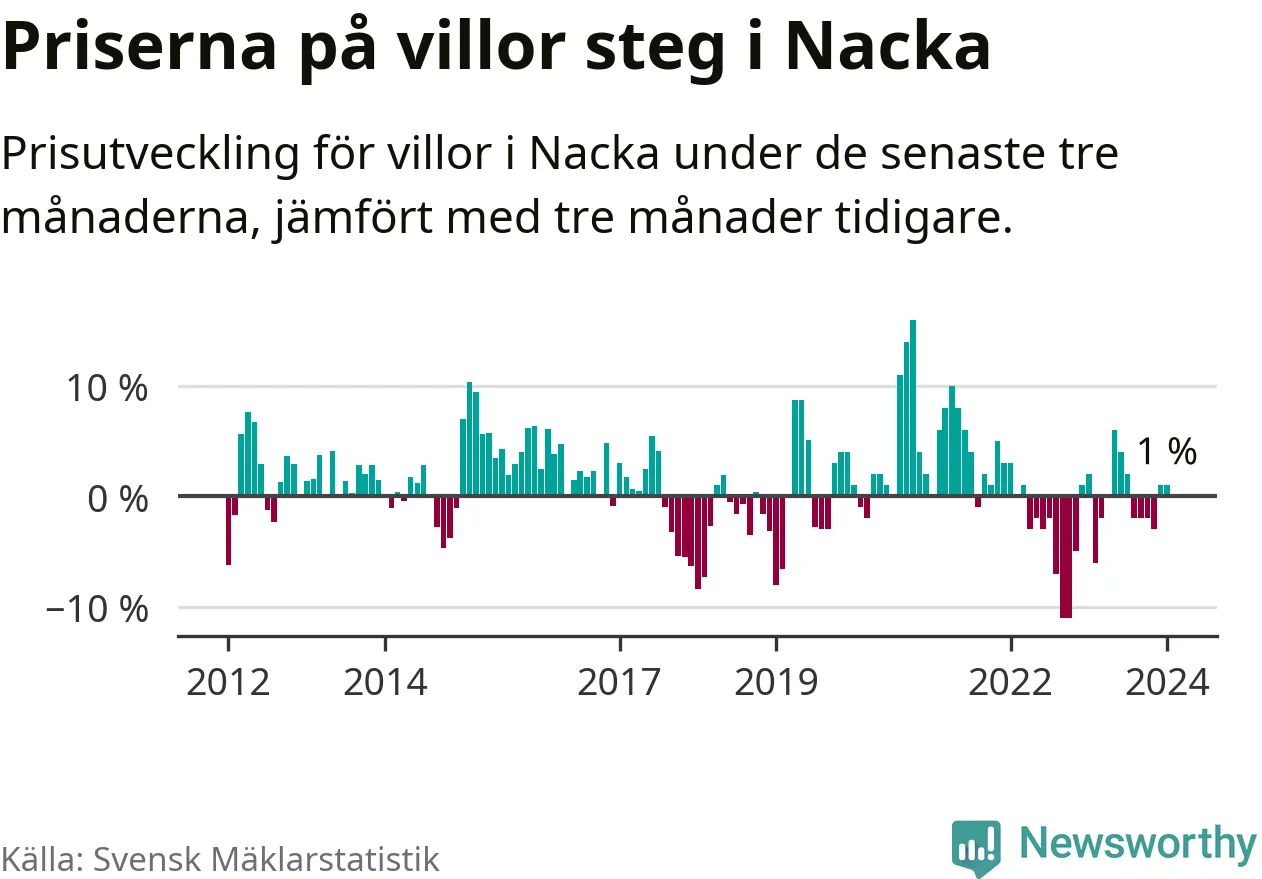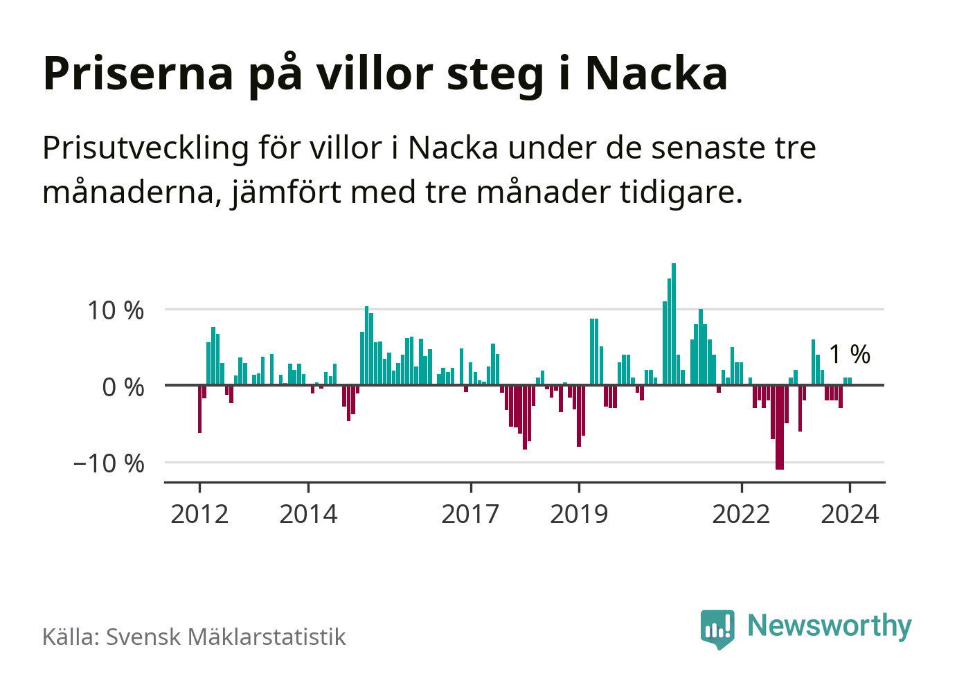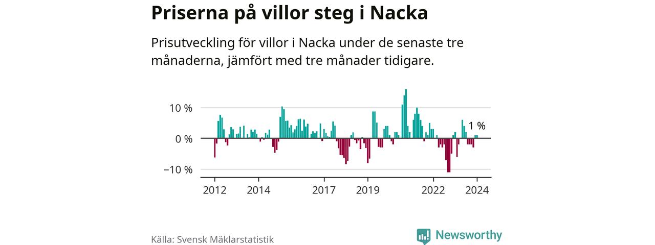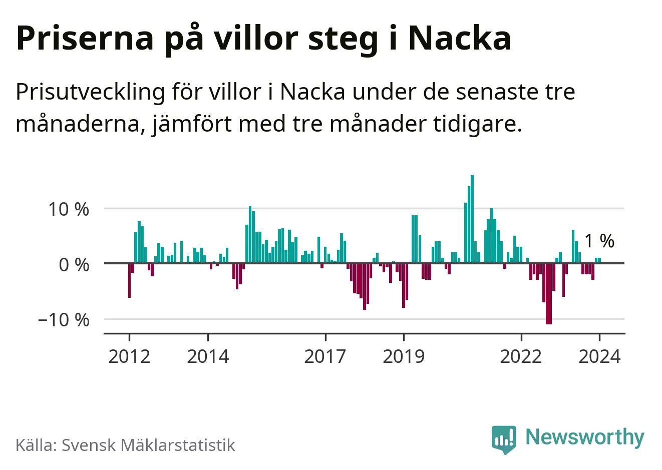 Villapriserna har gått upp i Nacka kommun. Medelpriset på försäljningarna under de senaste tre månaderna visar på en uppgång med 1 procent.