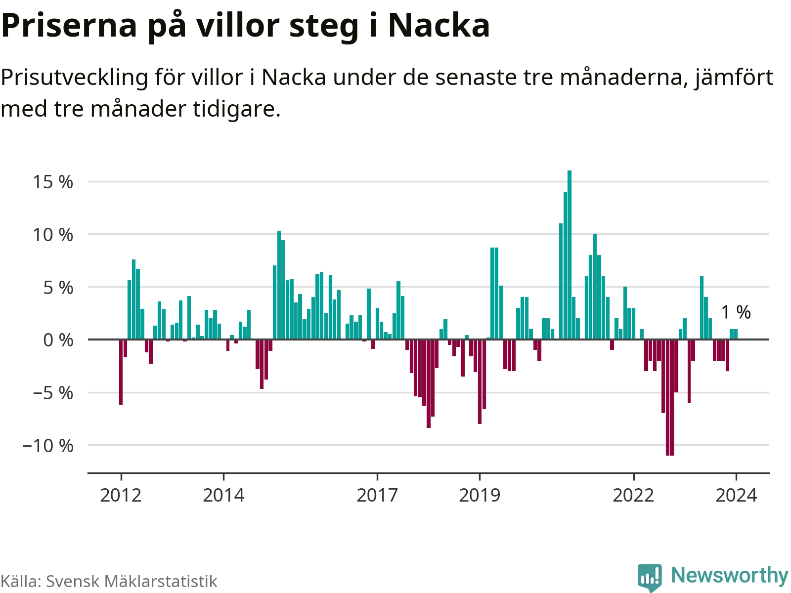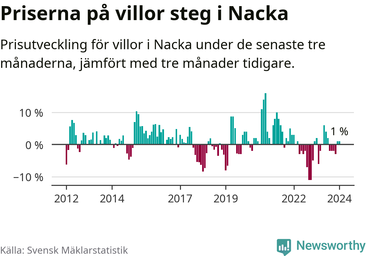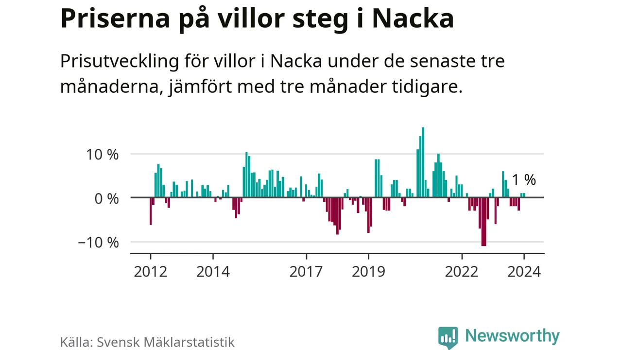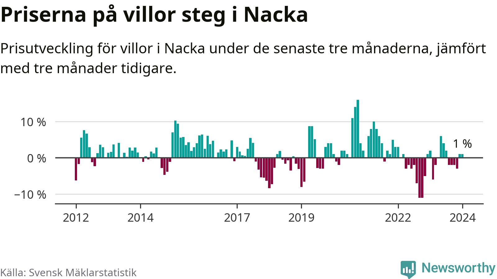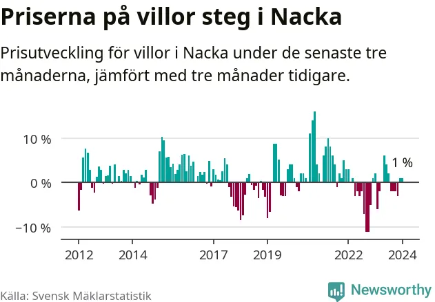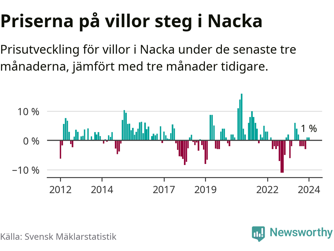 Villapriserna har gått upp i Nacka kommun. Medelpriset på försäljningarna under de senaste tre månaderna visar på en uppgång med 1 procent.