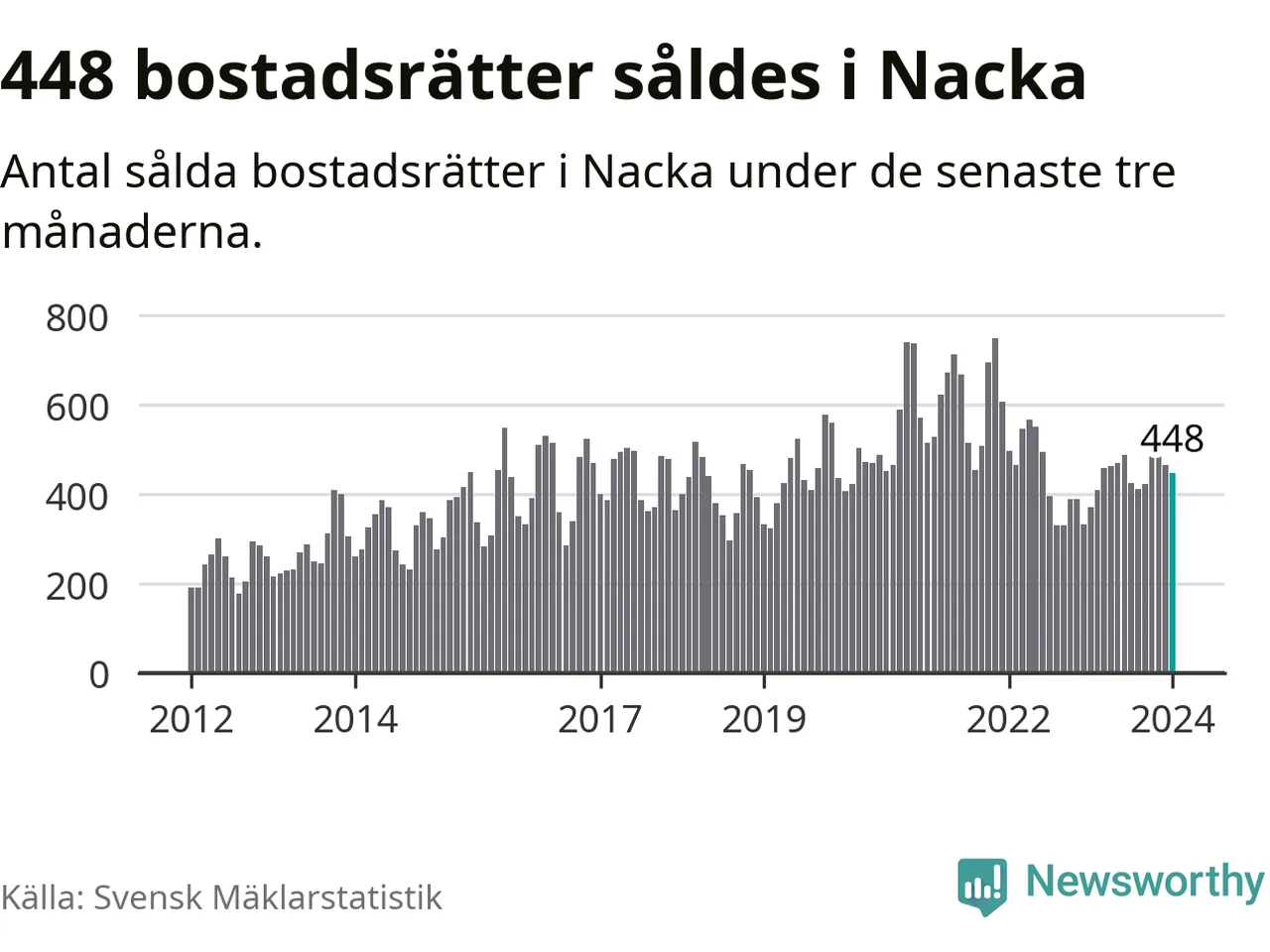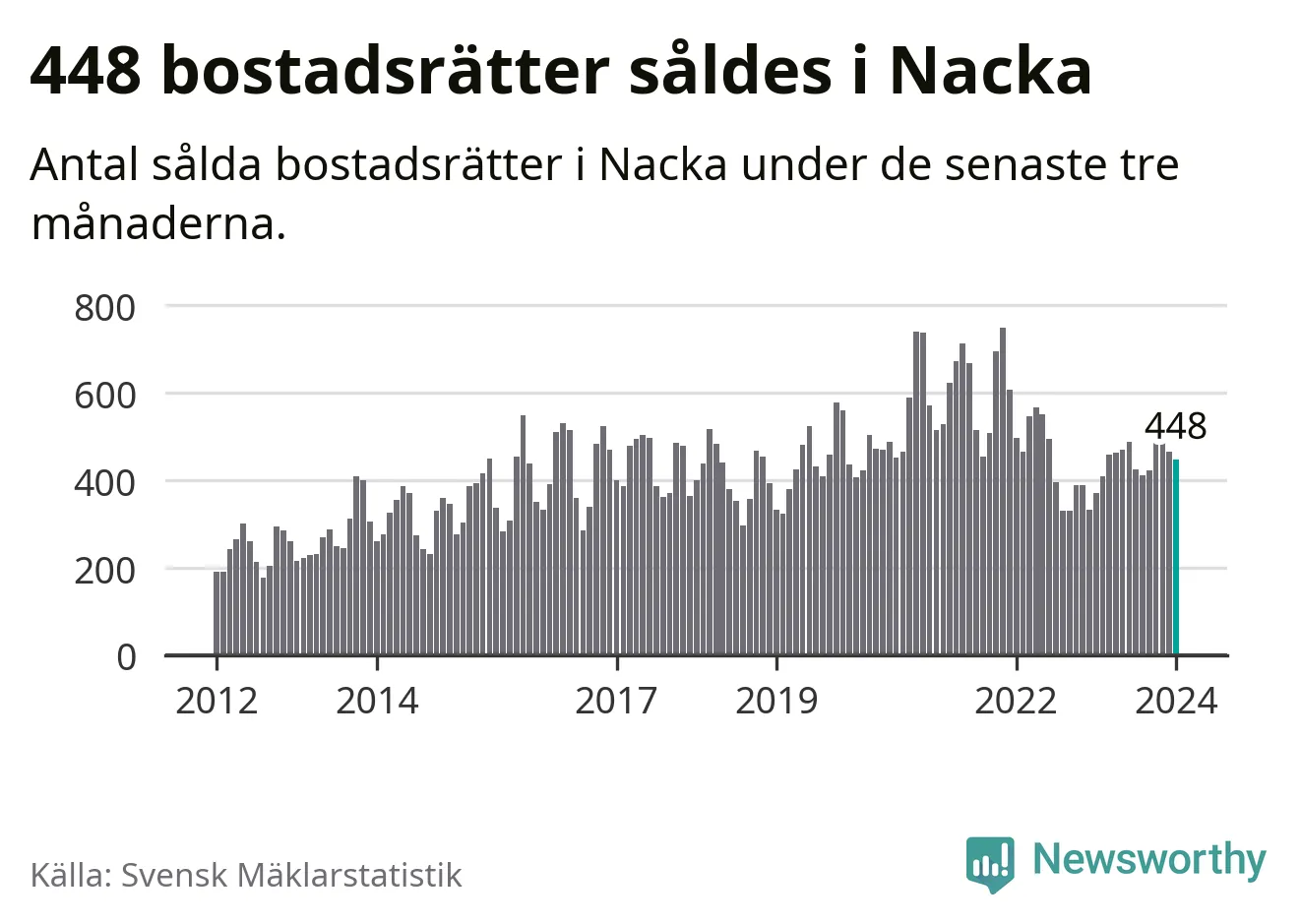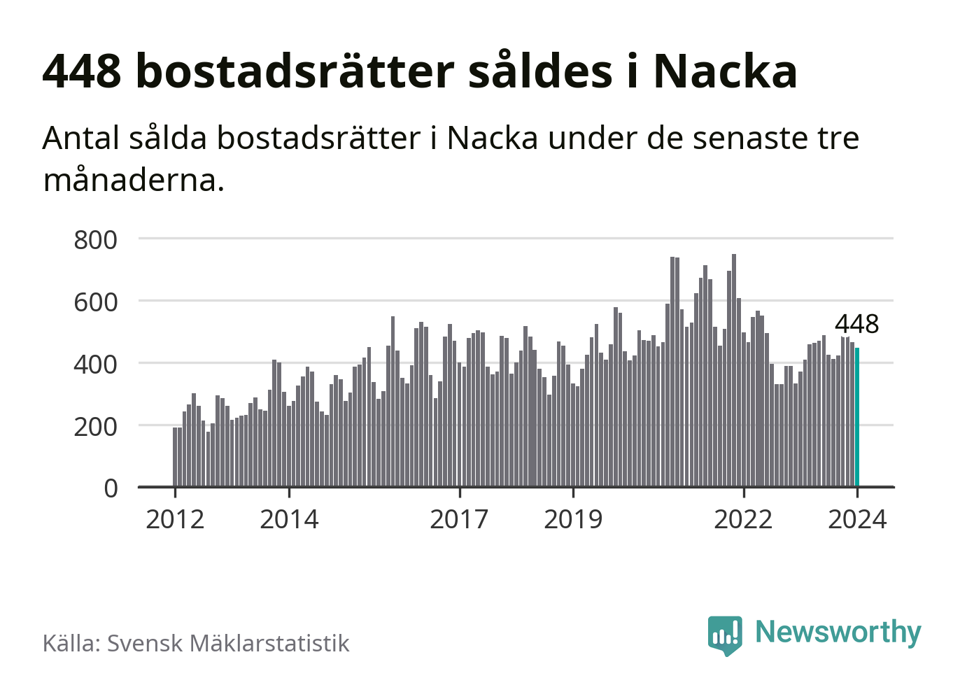 Sammanlagt såldes 448 bostadsrätter i Nacka kommun mellan november och januari till ett genomsnittligt pris på 3,9 miljoner kronor. I fjol gjordes 371 affärer vid den här tiden på året.