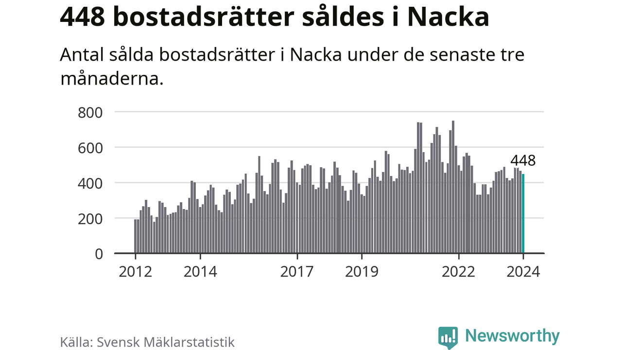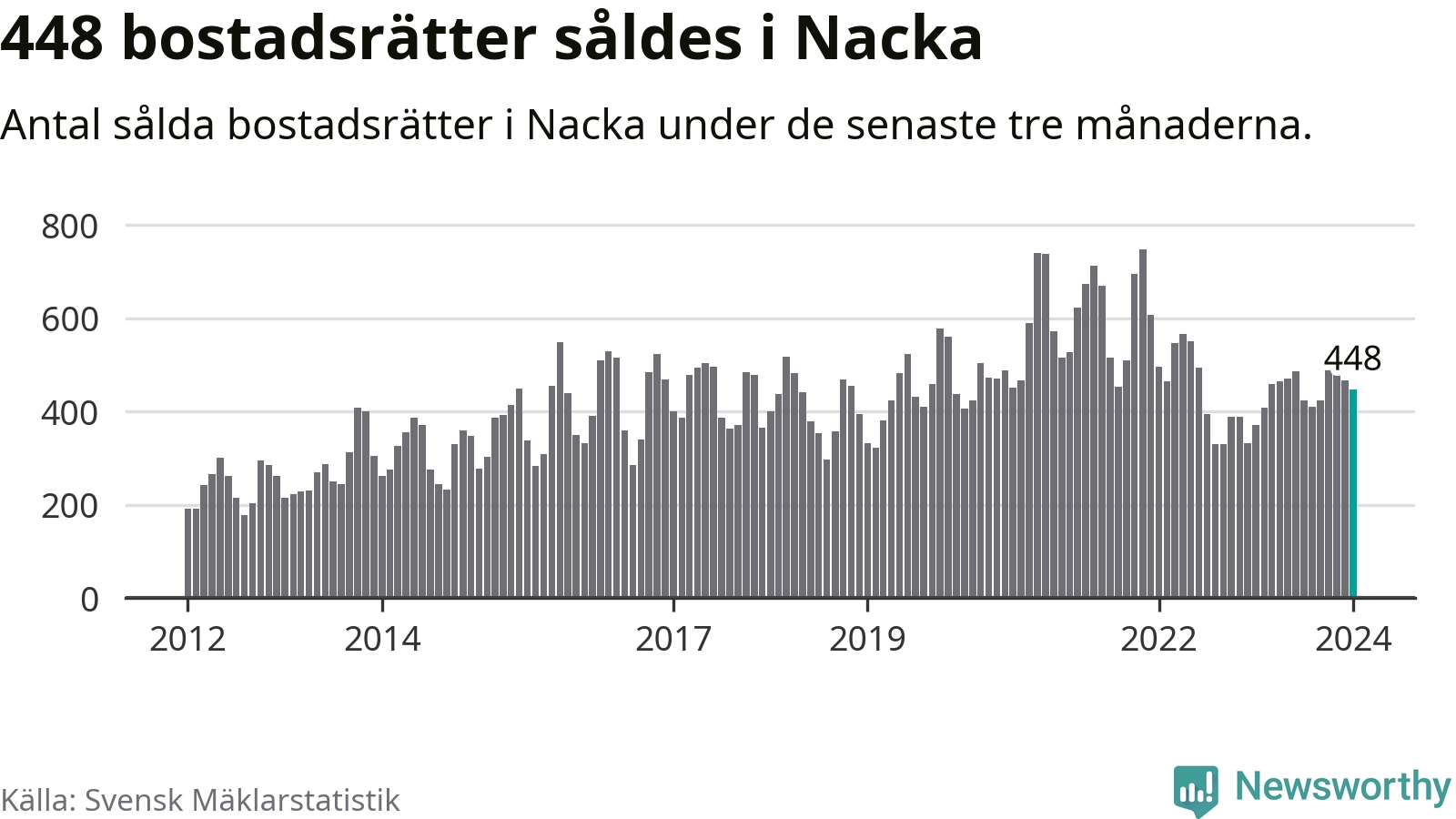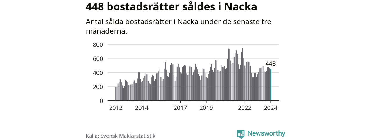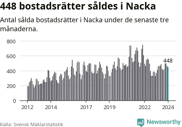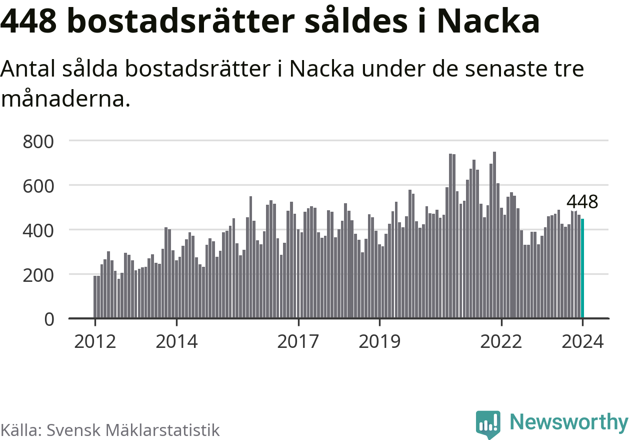 Sammanlagt såldes 448 bostadsrätter i Nacka kommun mellan november och januari till ett genomsnittligt pris på 3,9 miljoner kronor. I fjol gjordes 371 affärer vid den här tiden på året.