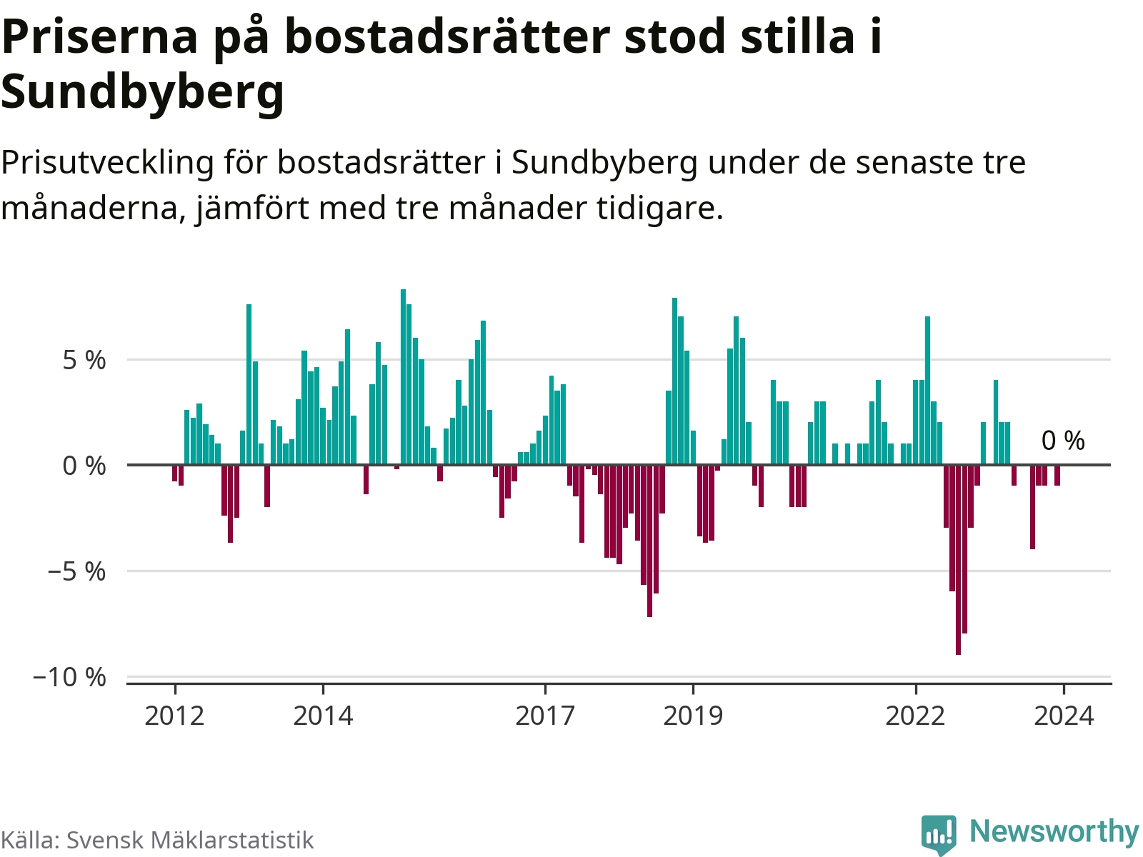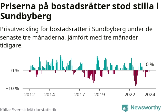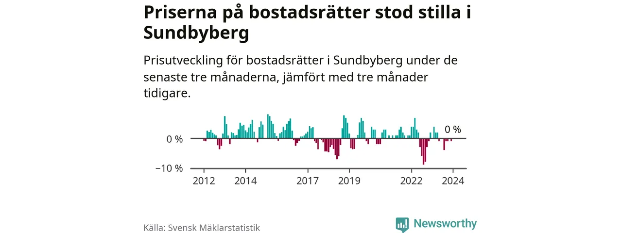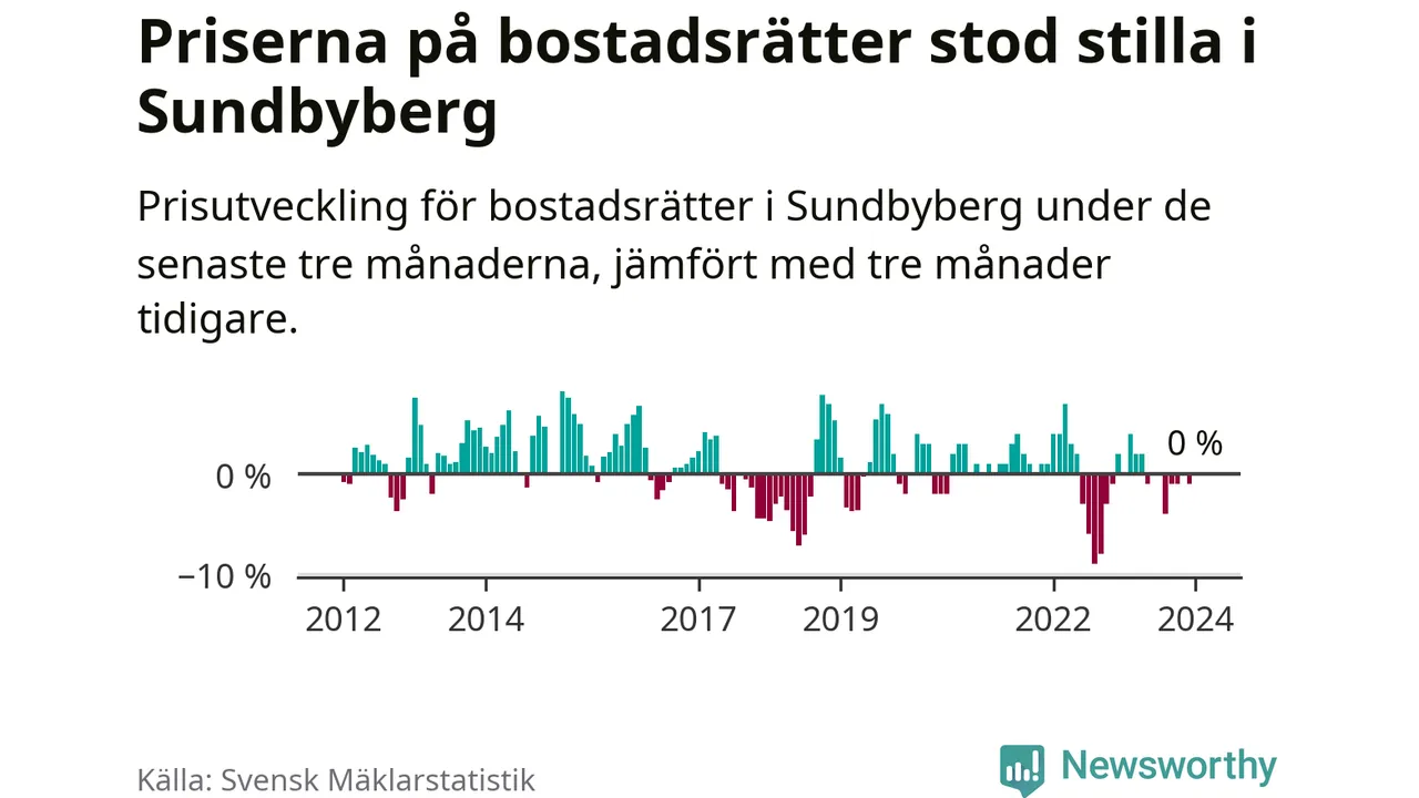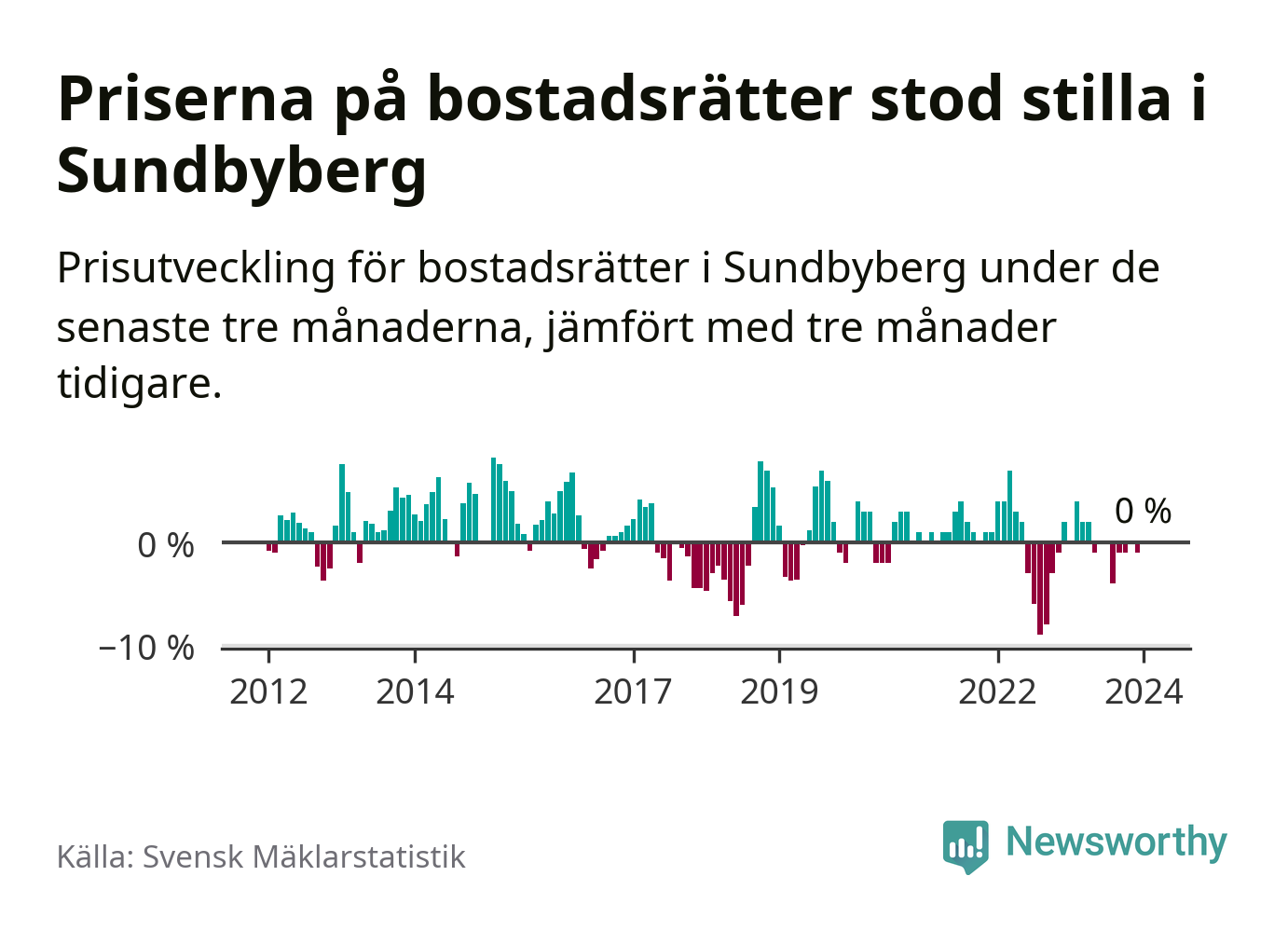 Medelpriset på försäljningarna i Sundbybergs kommun låg på i stort sett samma nivå som för tre månader sedan. I hela Stockholms län däremot sjunker priserna på bostadsrätter. I hela länet noterades en prisnedgång på 2 procent.