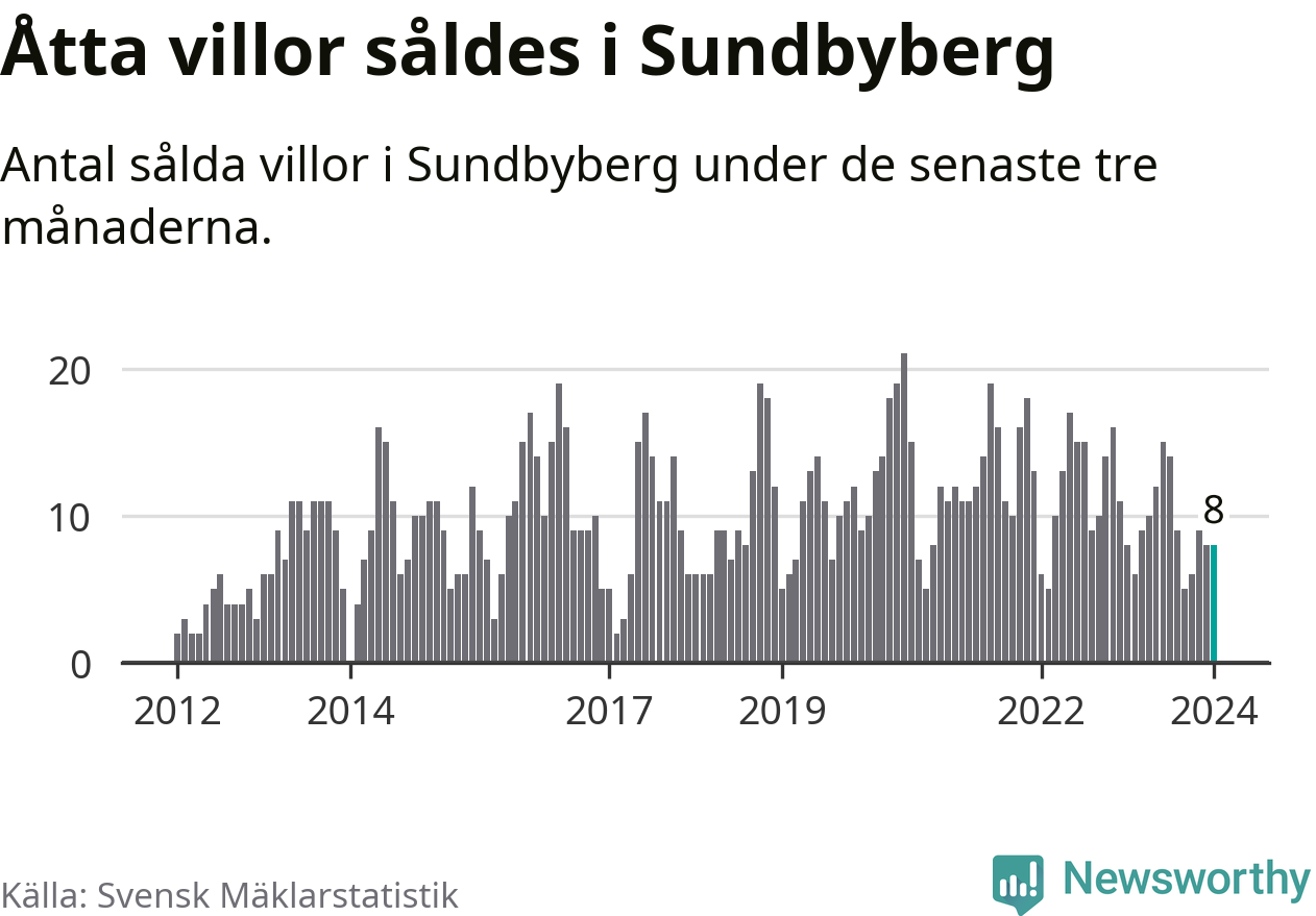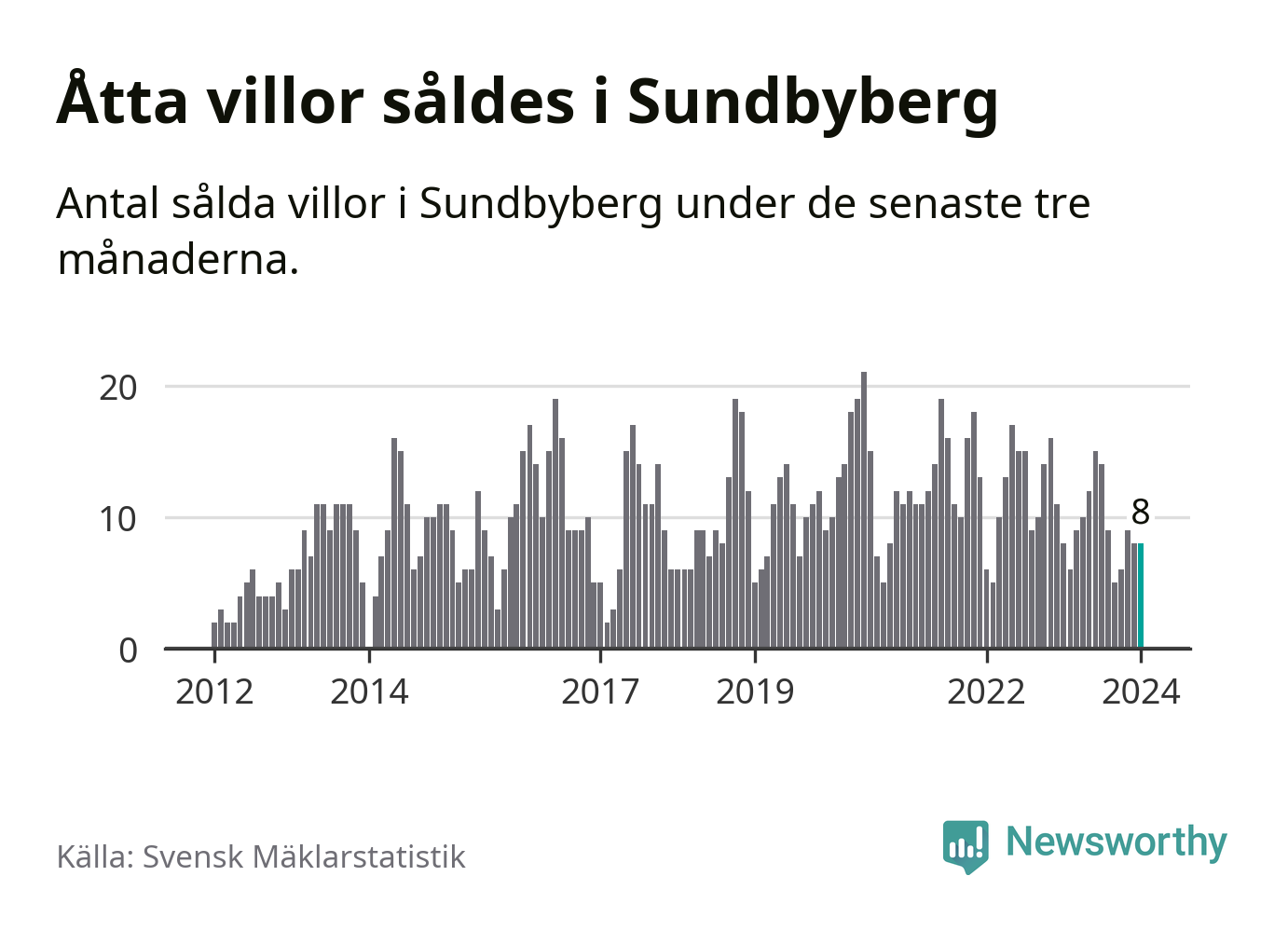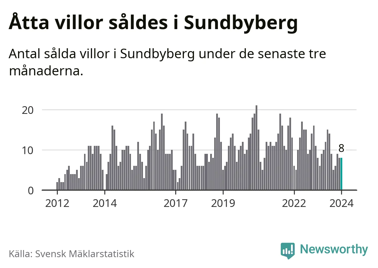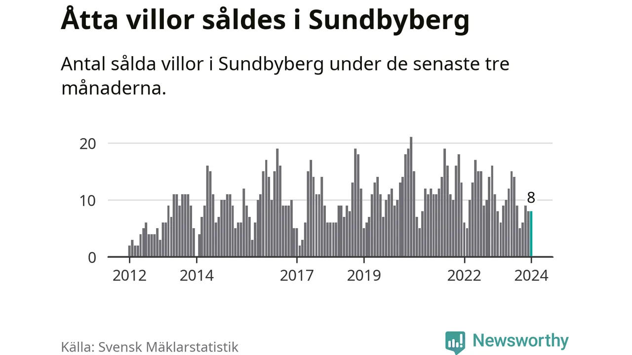 Mellan november och januari gjordes sammanlagt åtta affärer med villor i Sundbybergs kommun. Det är lika många affärer som vid motsvarande tid i fjol.