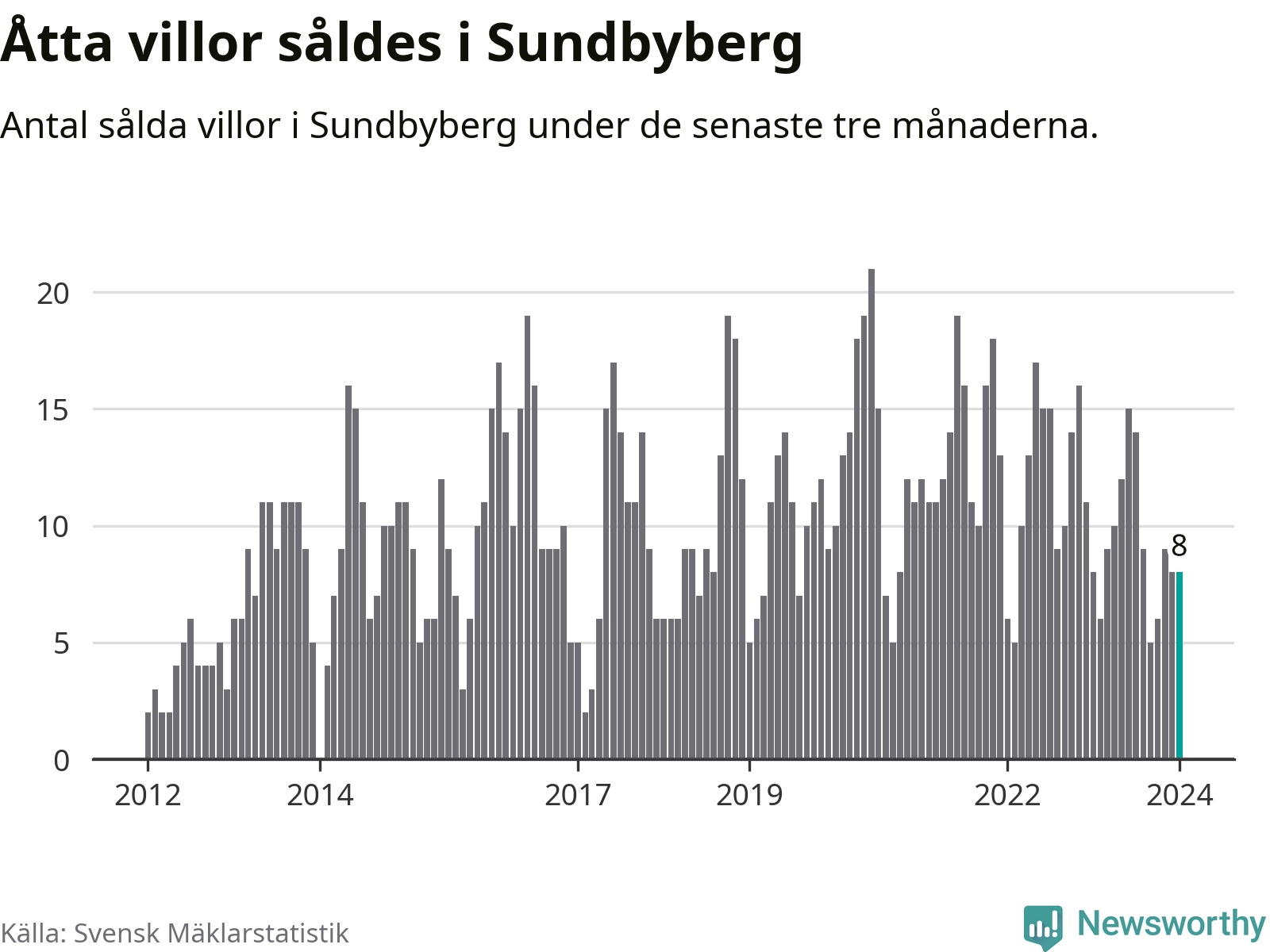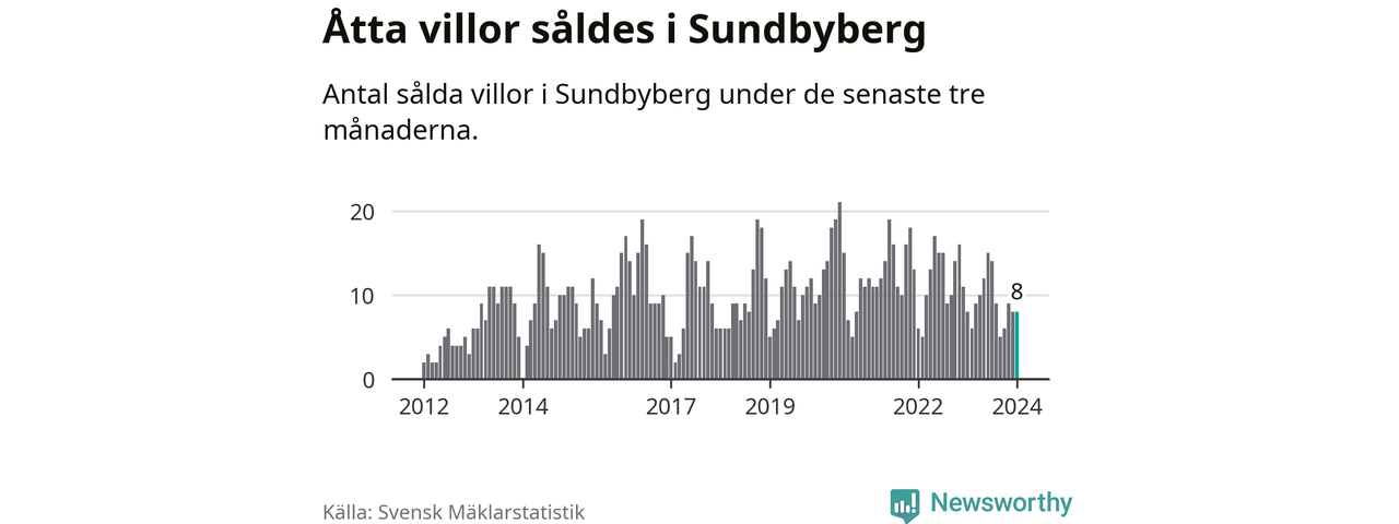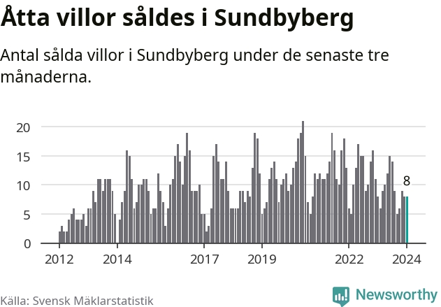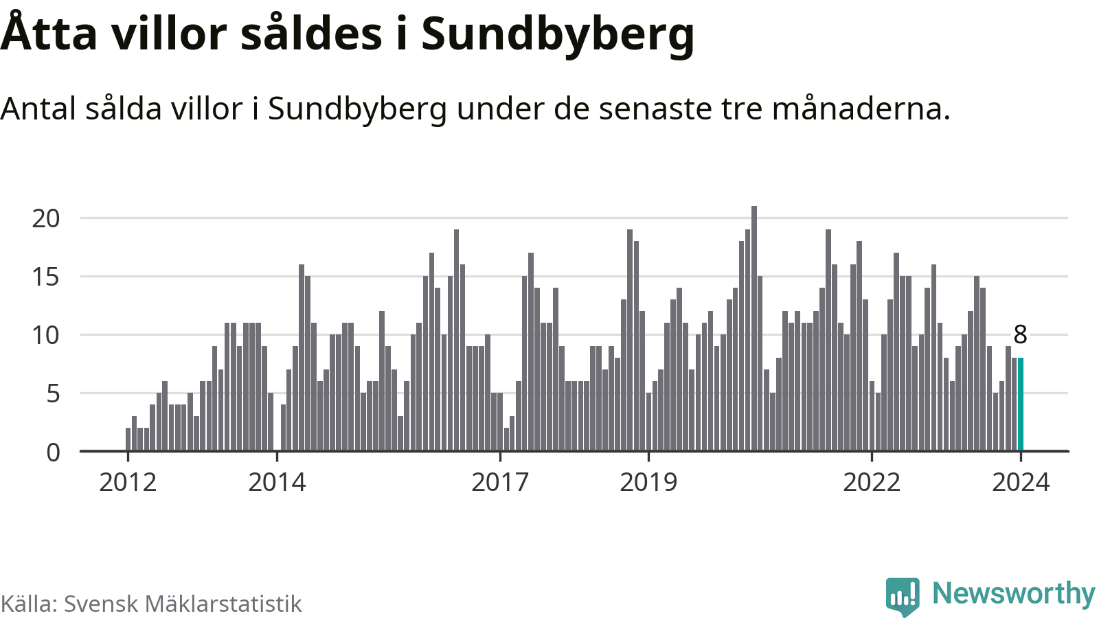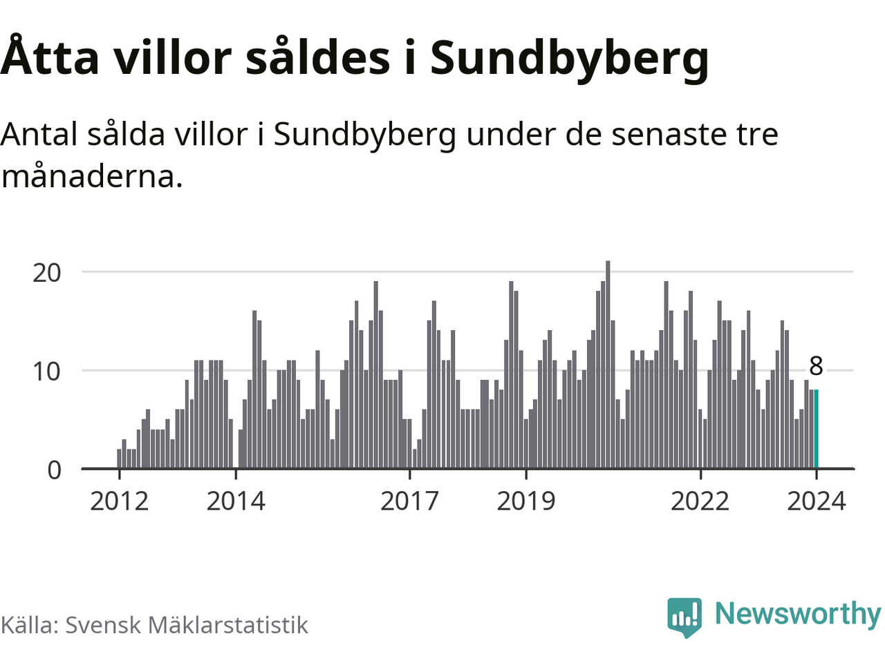 Mellan november och januari gjordes sammanlagt åtta affärer med villor i Sundbybergs kommun. Det är lika många affärer som vid motsvarande tid i fjol.
