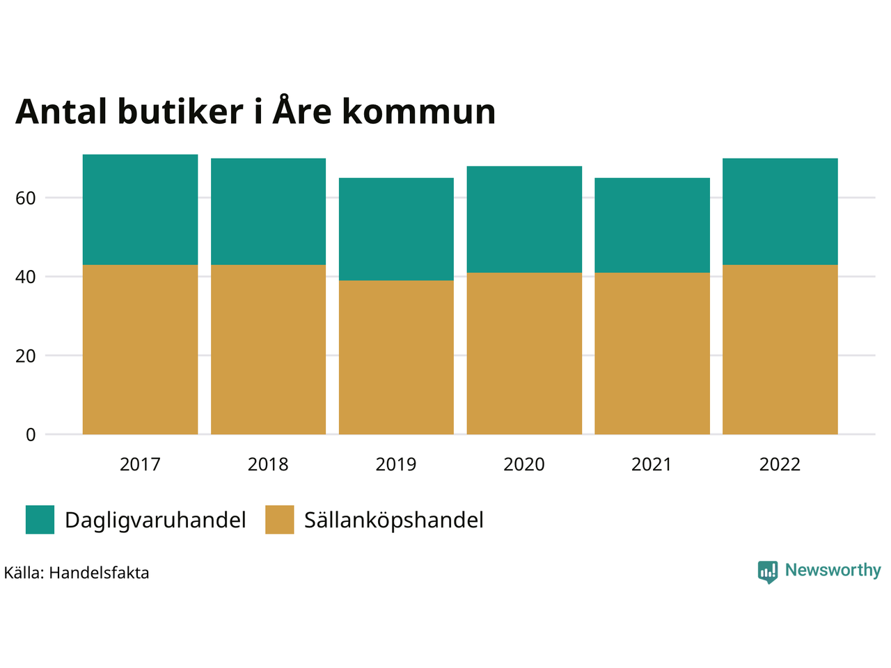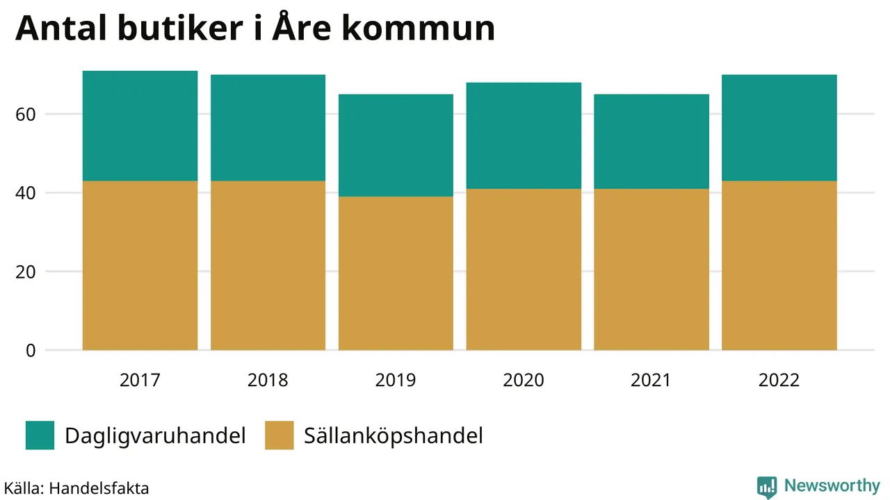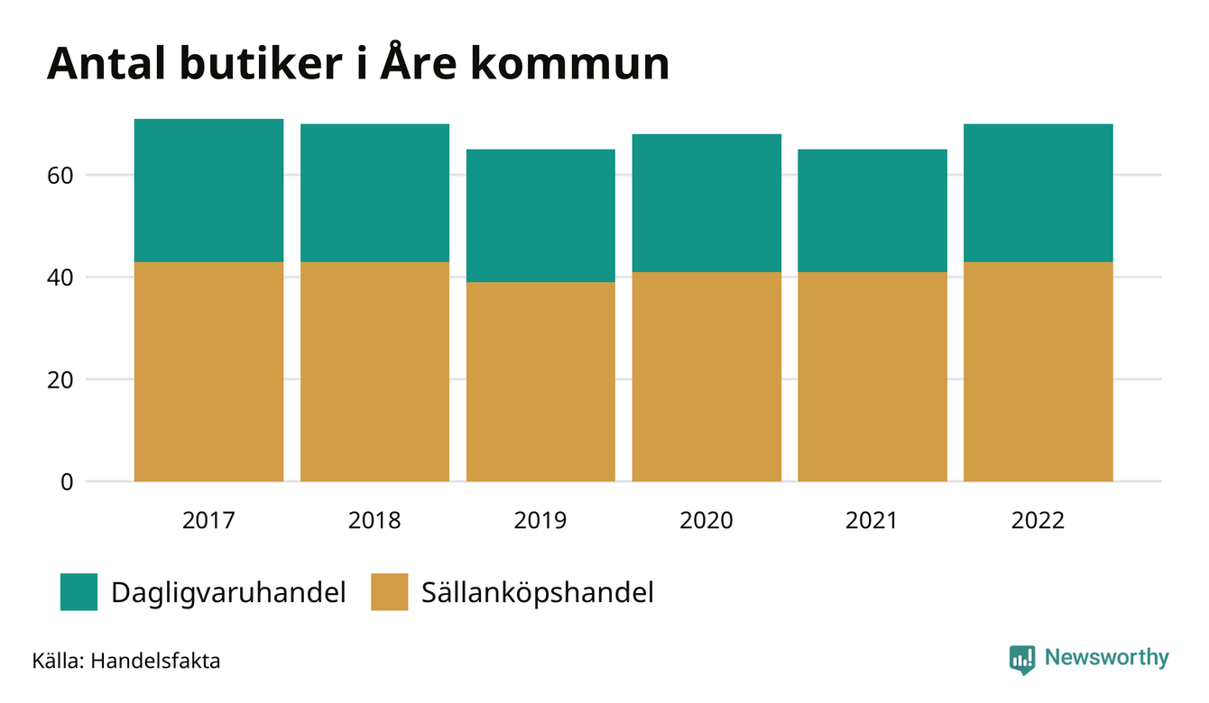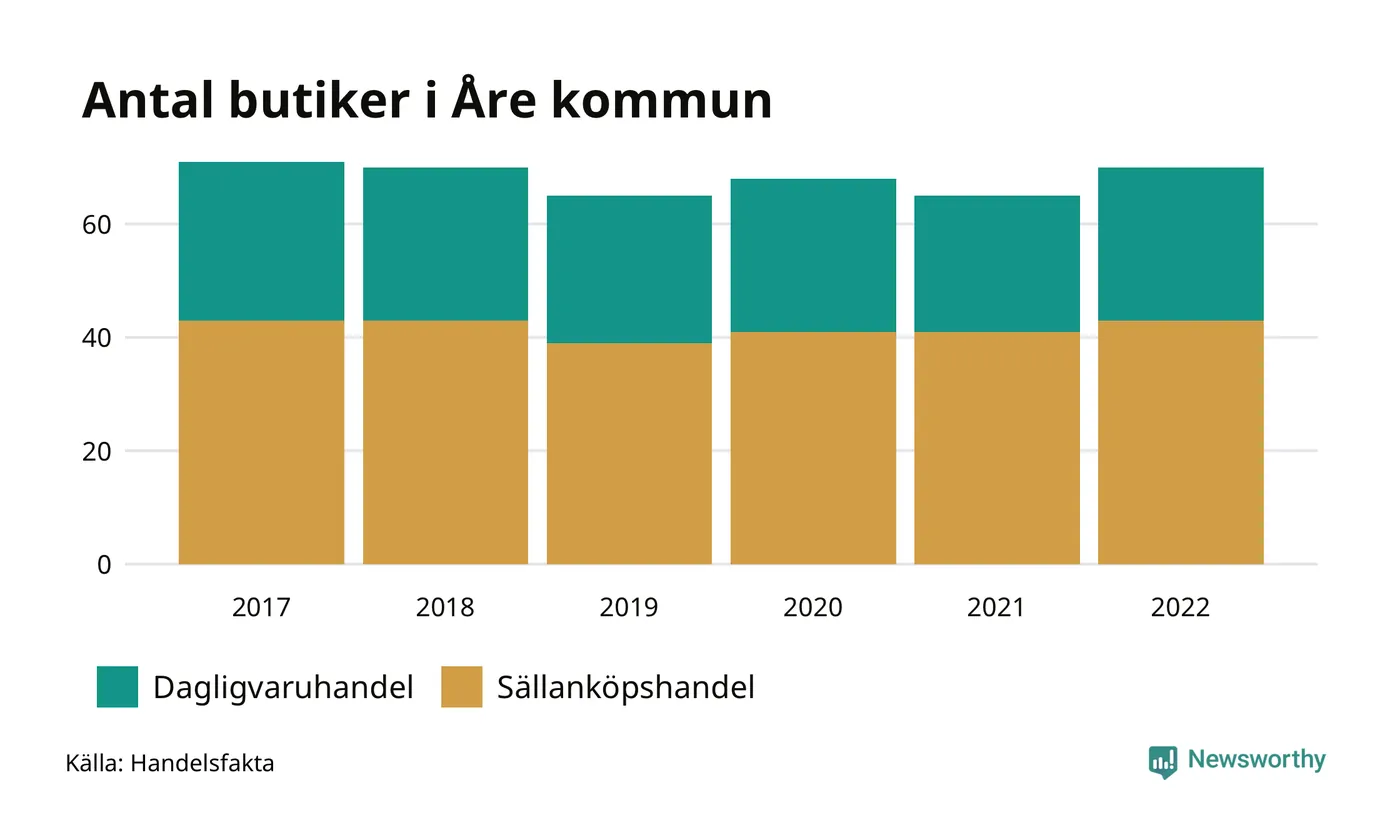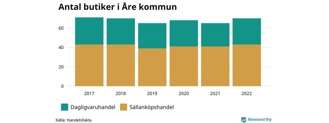 I Åre kommun har förändringarna varit relativt små. Den 30 november 2022 fanns 70 butiker i kommunen, vilket är fem fler än året innan men en färre än 2017.