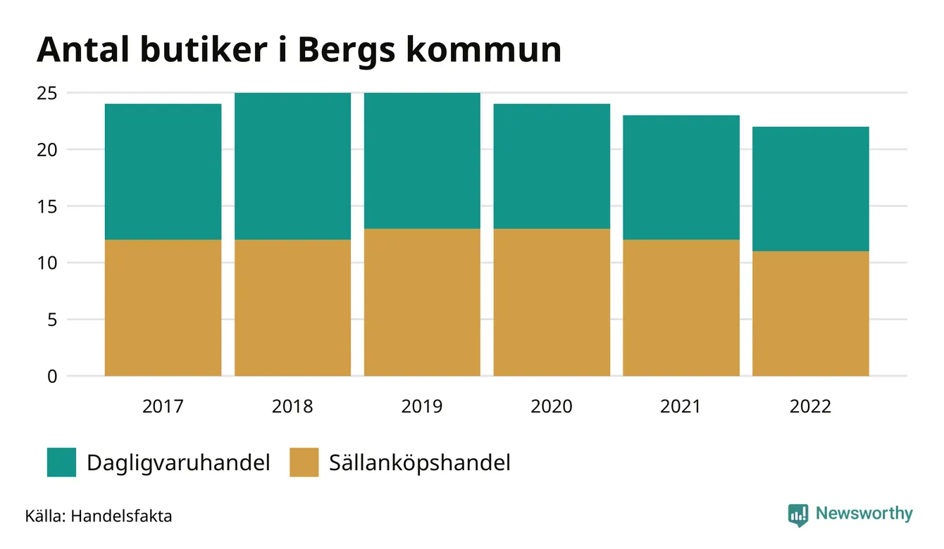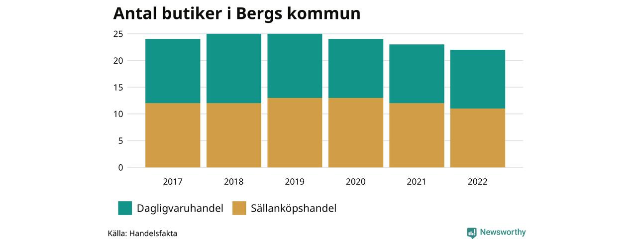 I Berg rör det sig om små tal. Den 30 november 2022 fanns 22 butiker i kommunen, vilket är en färre än året innan och två färre än 2017.