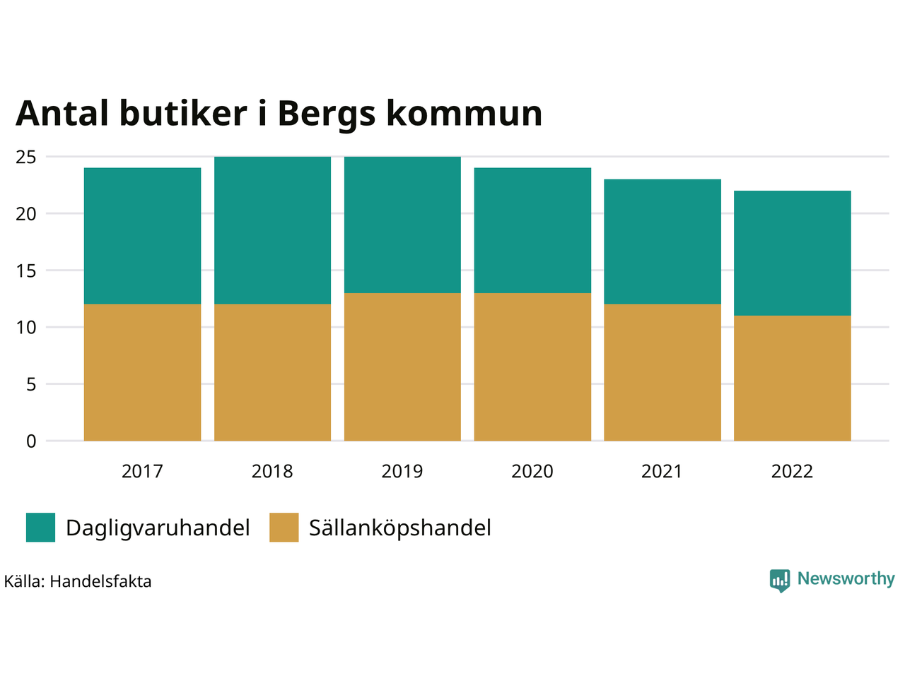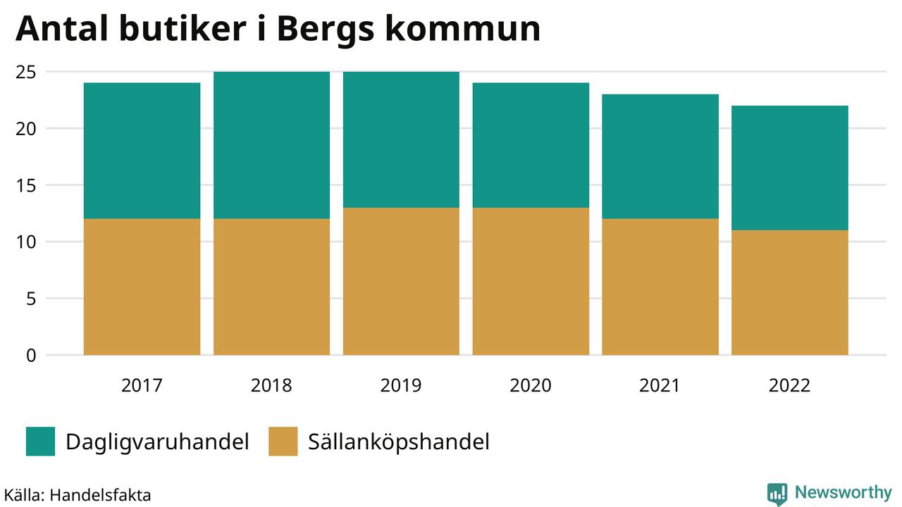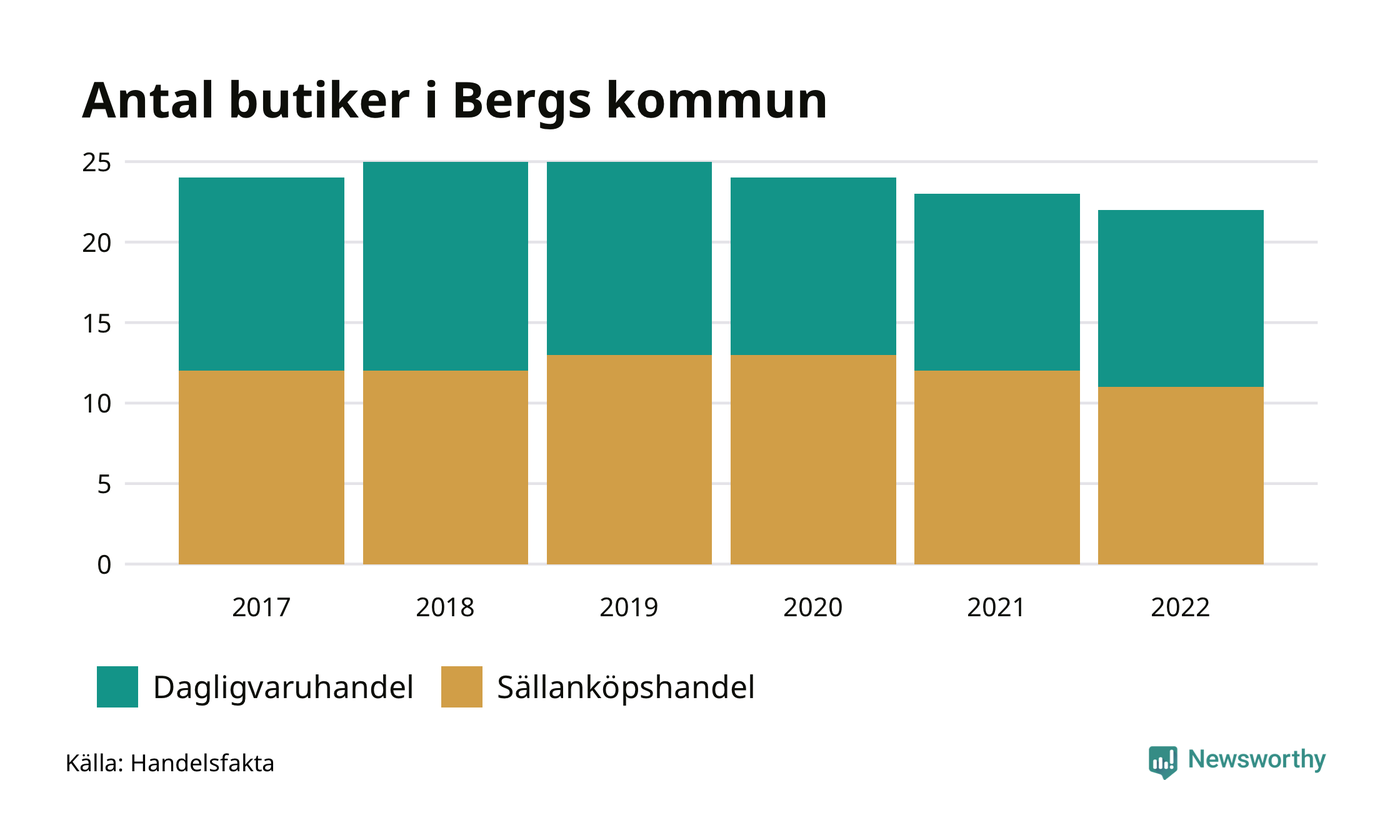Butikerna blir allt färre i landet, sedan 2017 har antalet minskat med 7 procent. I Bergs kommun fanns 22 butiker 2022 – jämfört med 24 stycken fem år tidigare.