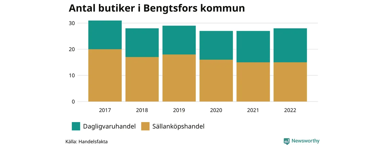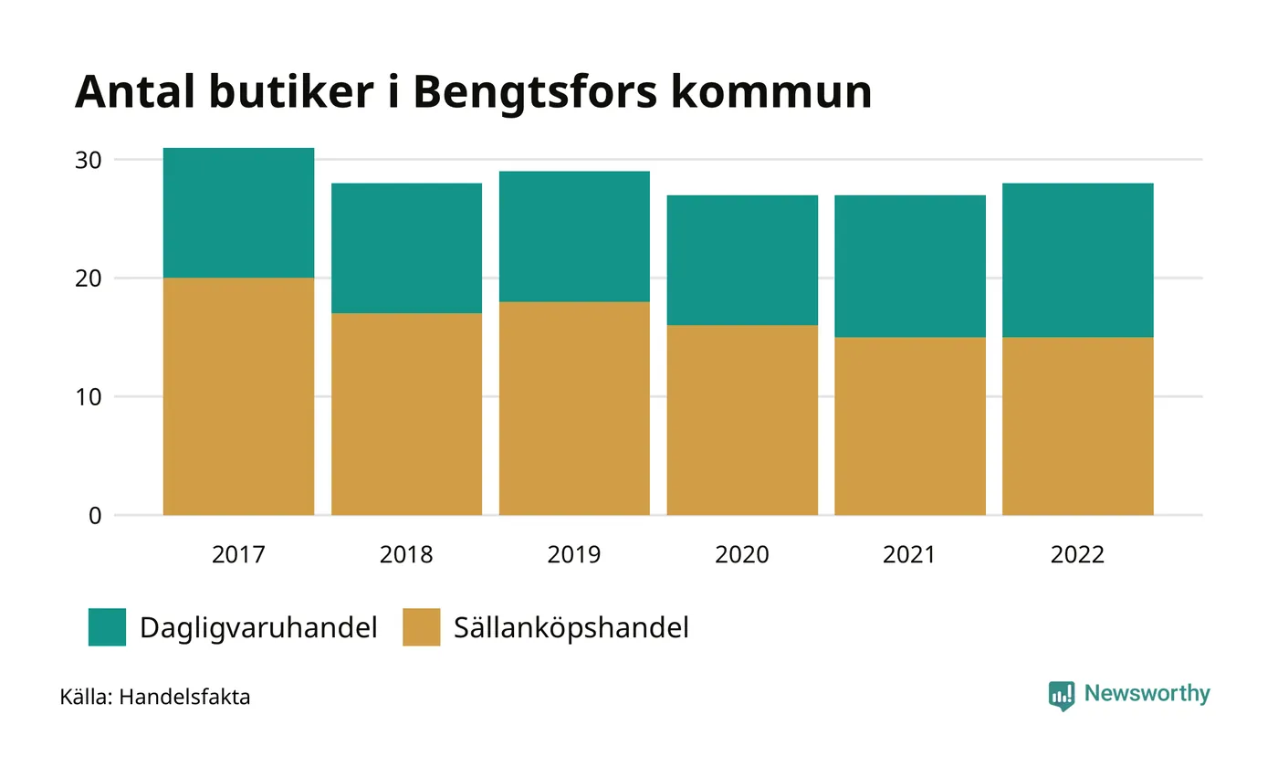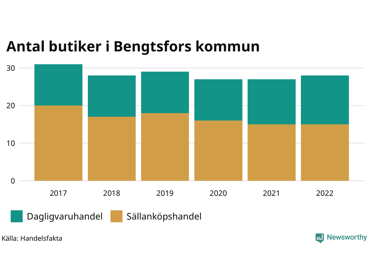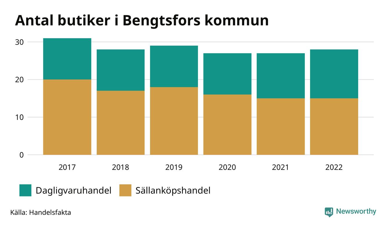 I Bengtsfors rör det sig om små tal. Den 30 november 2022 fanns 28 butiker i kommunen, vilket är en fler än året innan men tre färre än 2017.