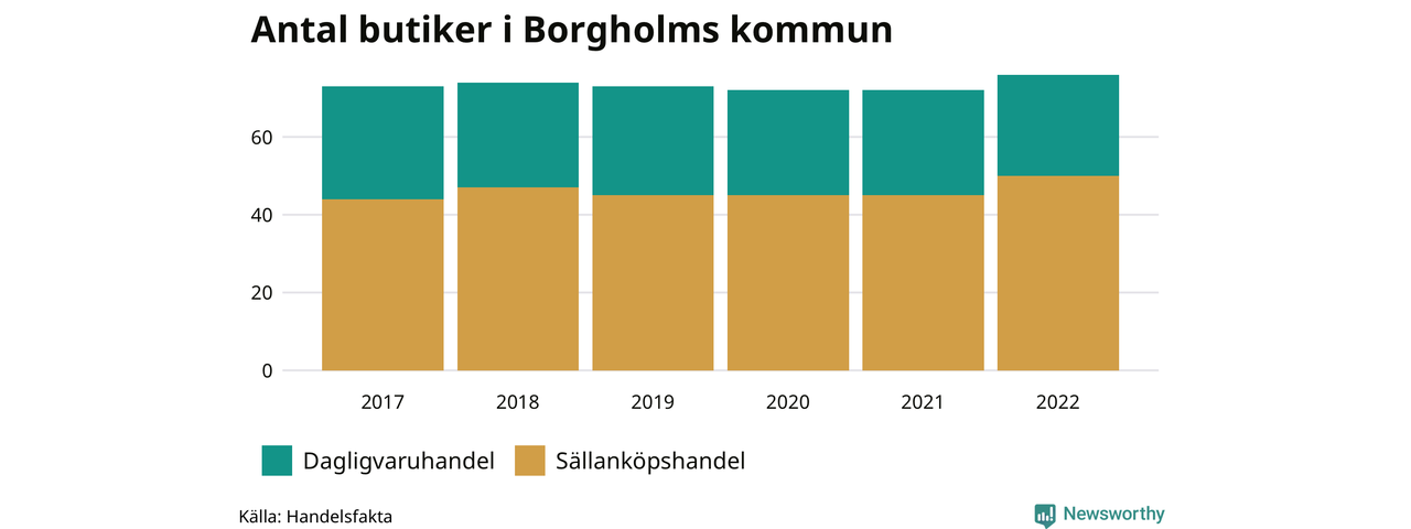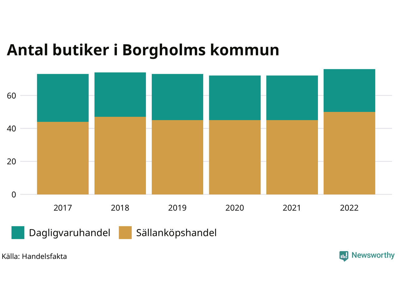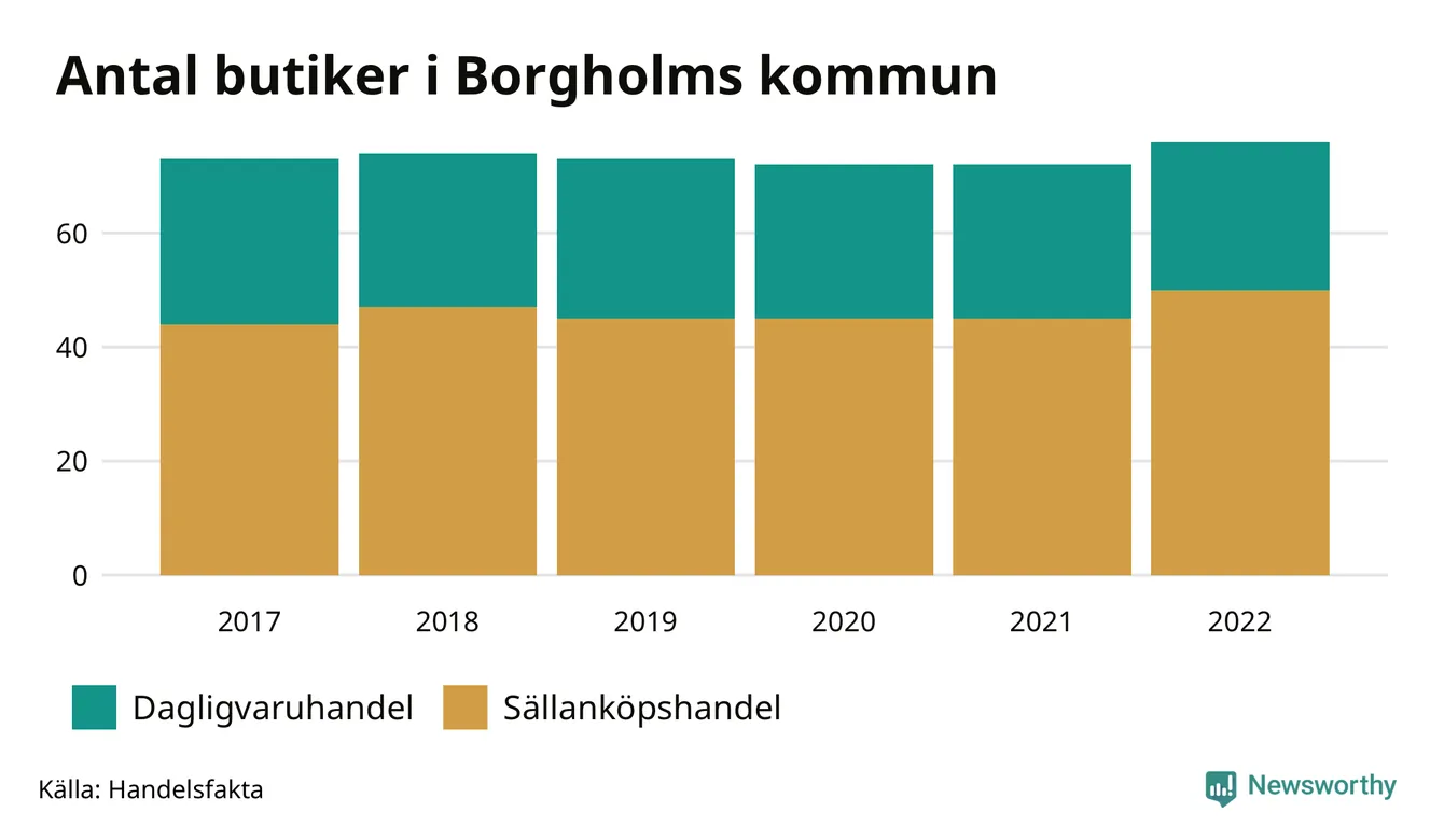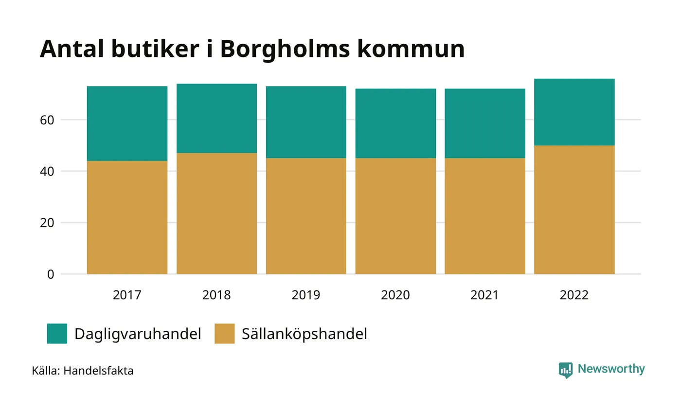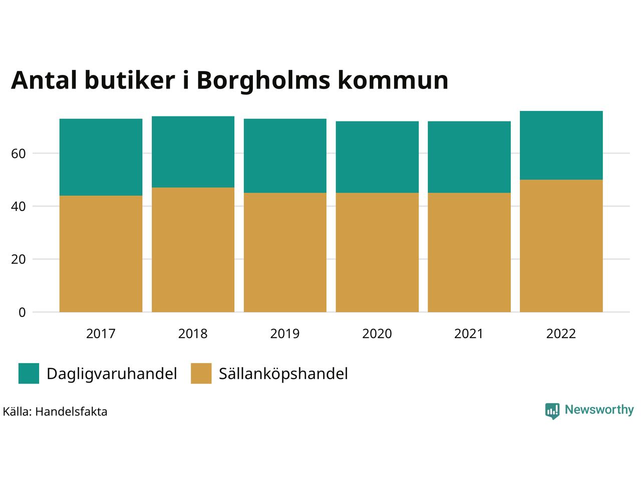 I Borgholms kommun har antalet butiker däremot ökat. Den 30 november 2022 fanns 76 butiker i kommunen, vilket är fyra fler än året innan och tre fler än 2017.