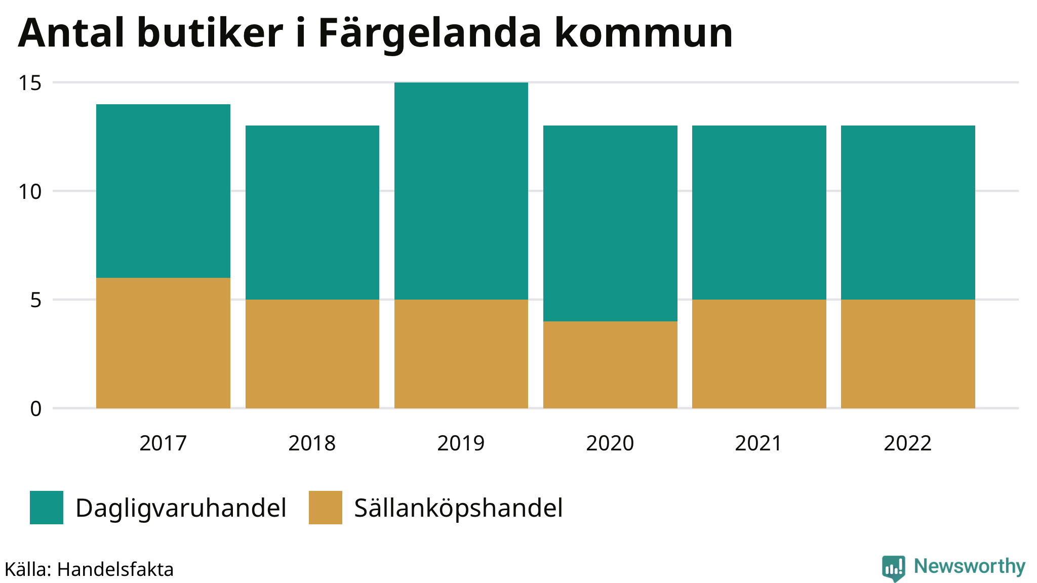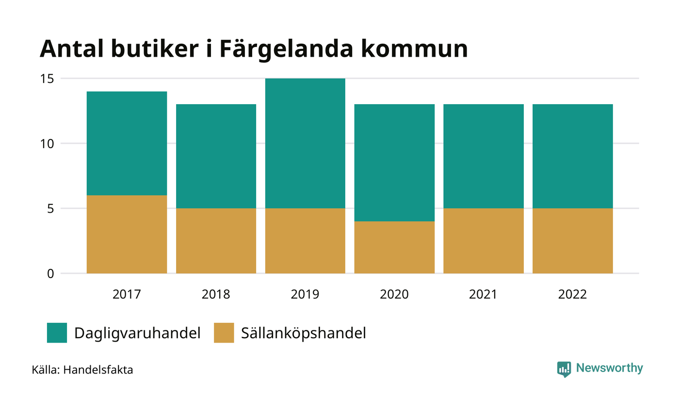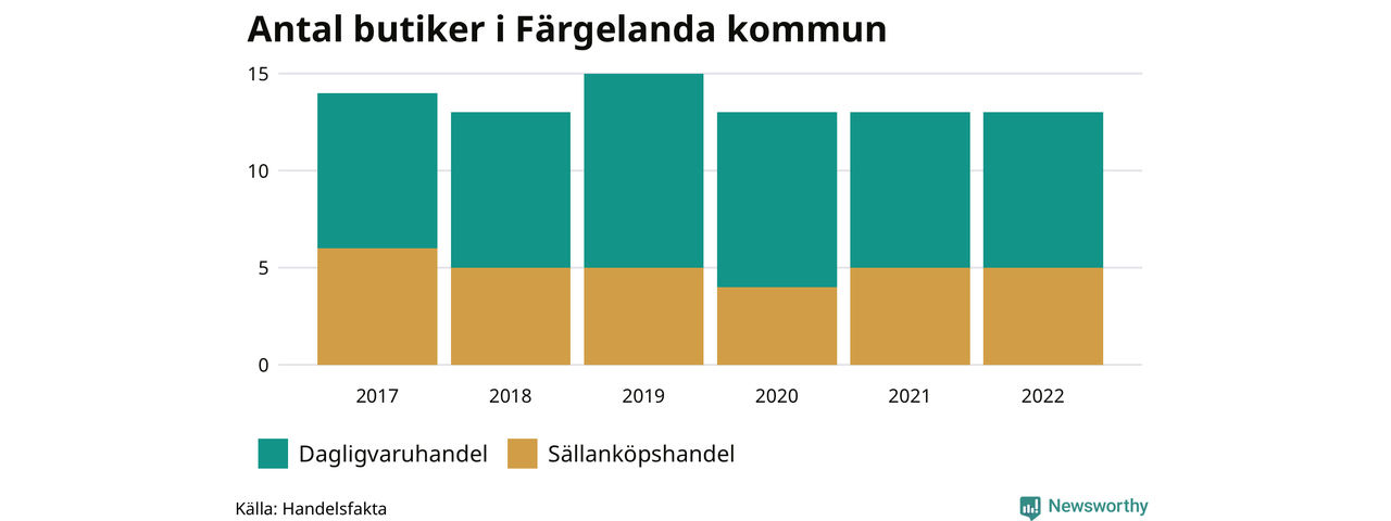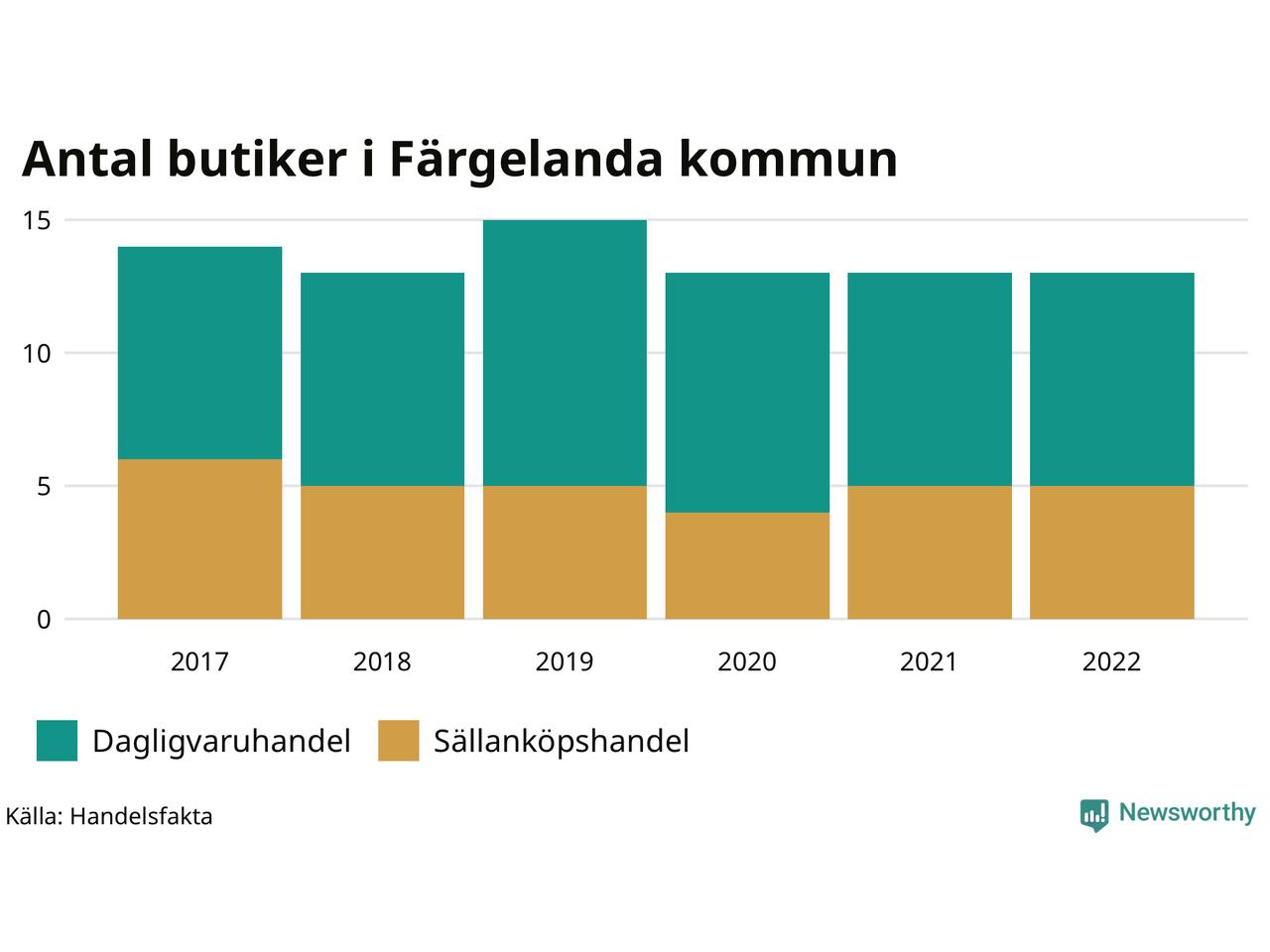 I Färgelanda rör det sig om små tal. Den 30 november 2022 fanns 13 butiker i kommunen, vilket är lika många som året innan men en färre än 2017.