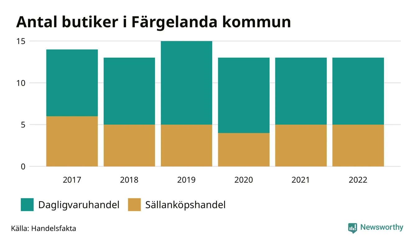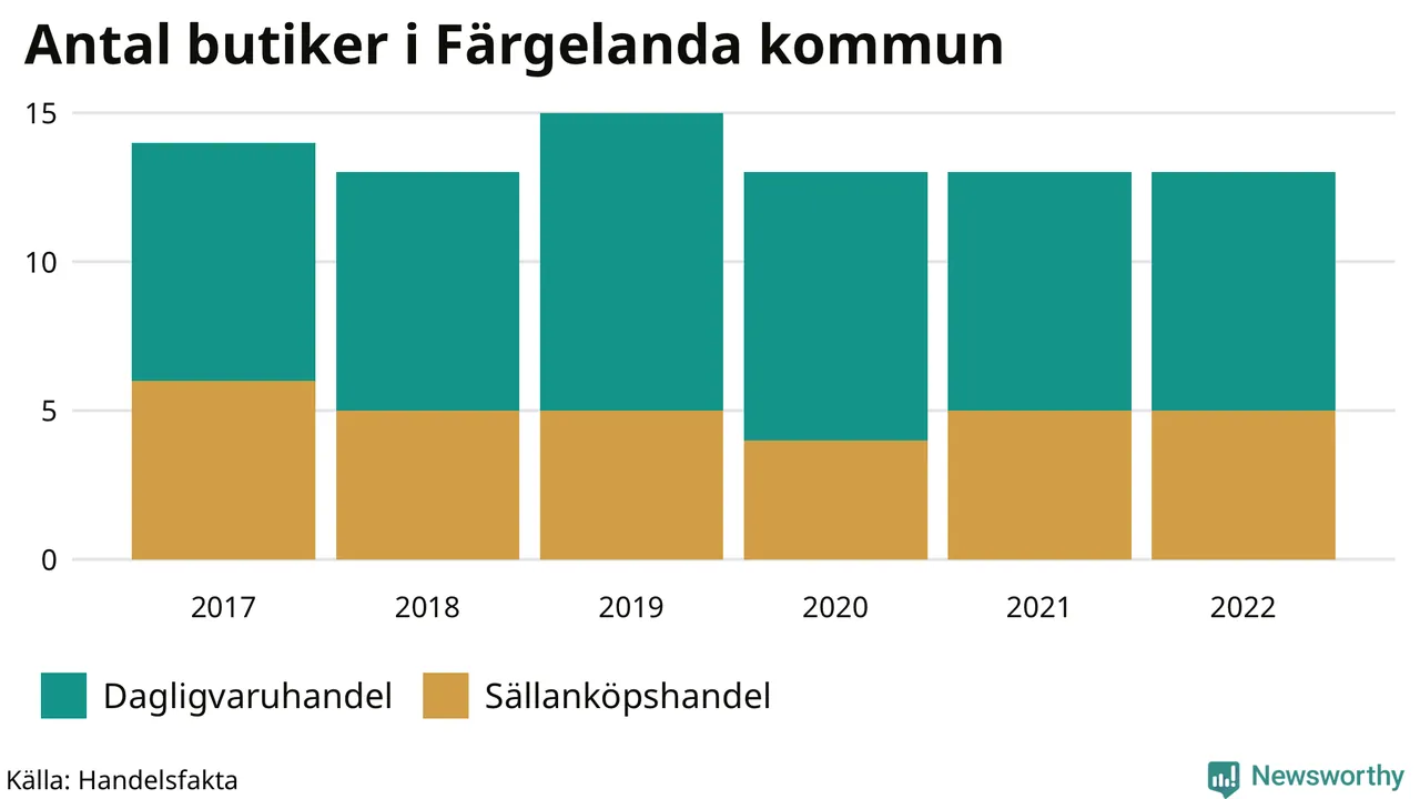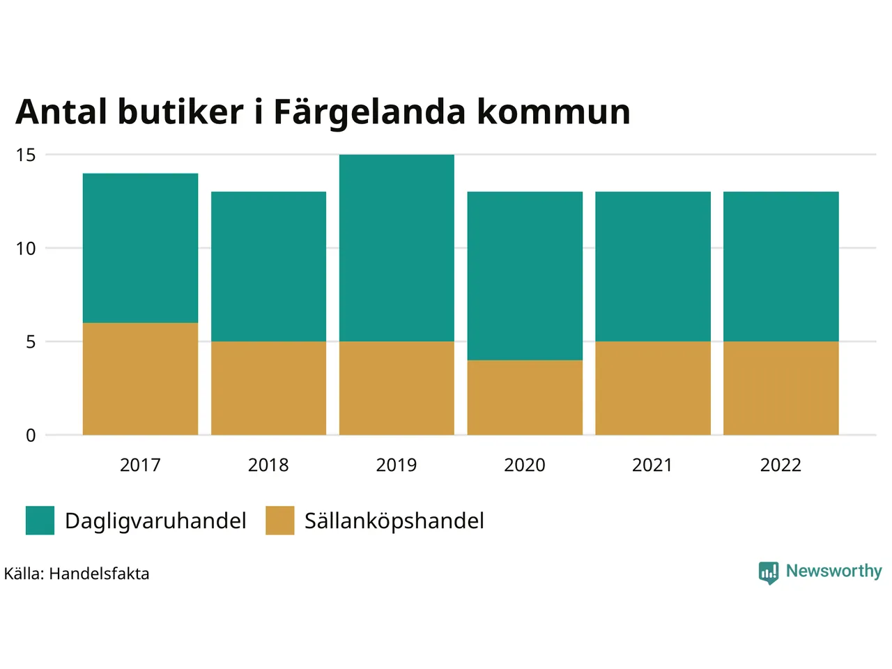 Butikerna blir allt färre i landet, sedan 2017 har antalet minskat med 7 procent. I Färgelanda kommun fanns 13 butiker 2022 – jämfört med 14 stycken fem år tidigare.