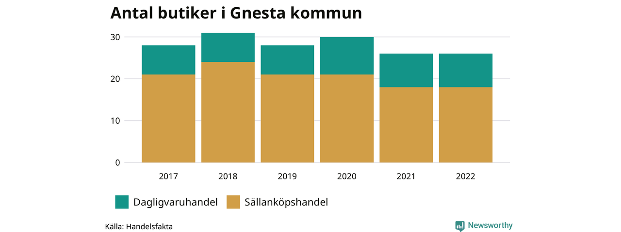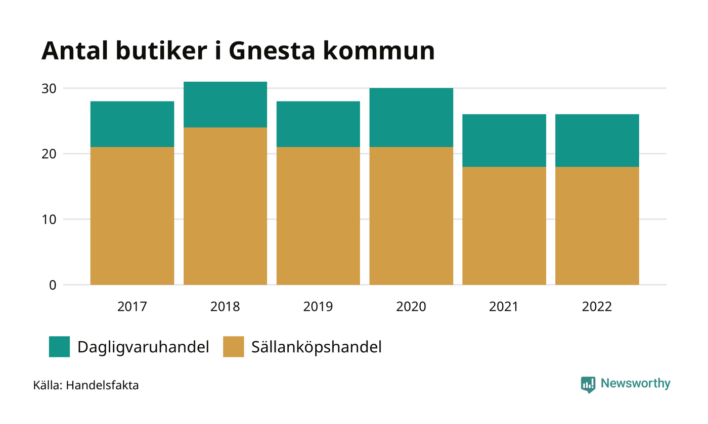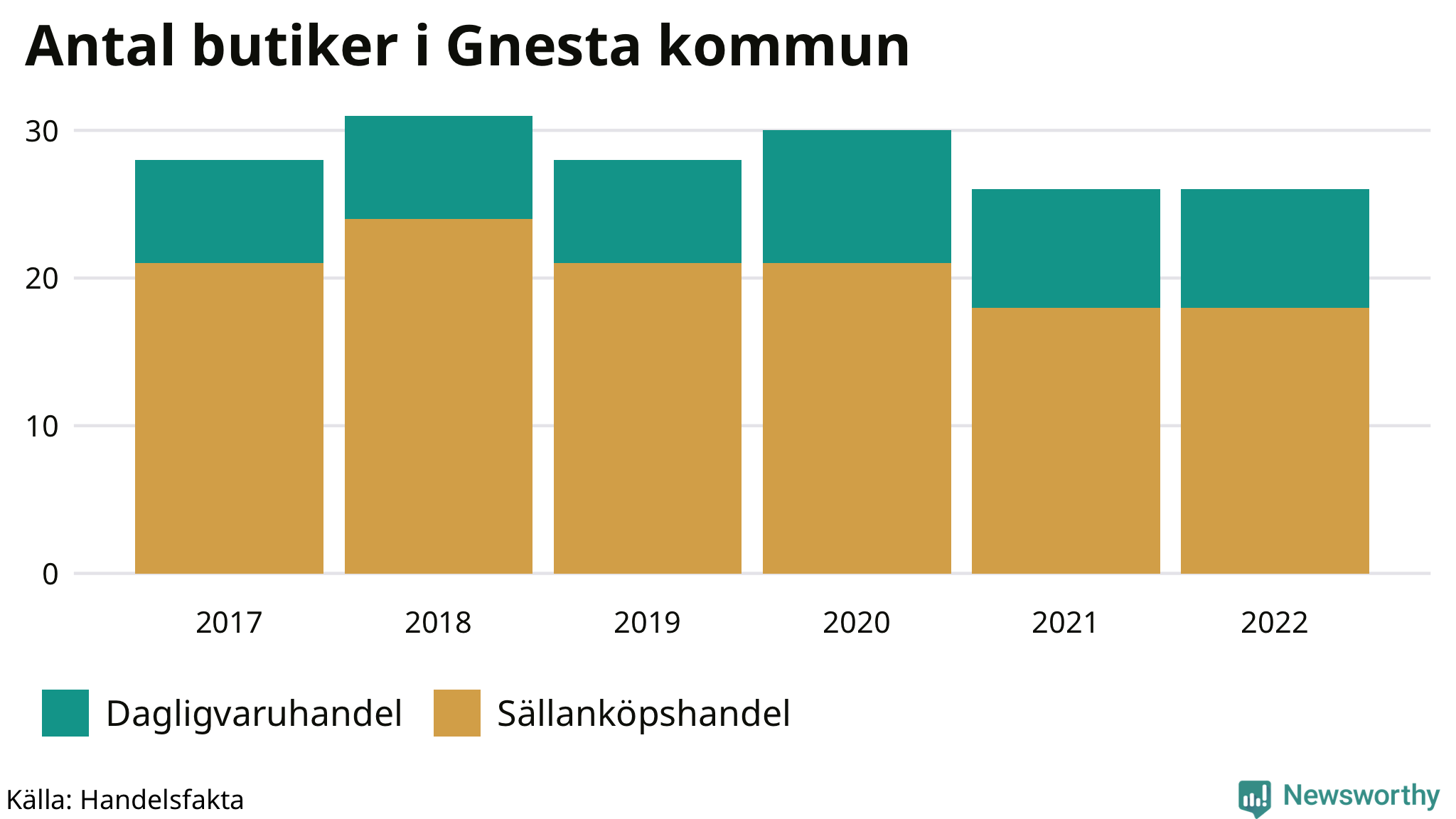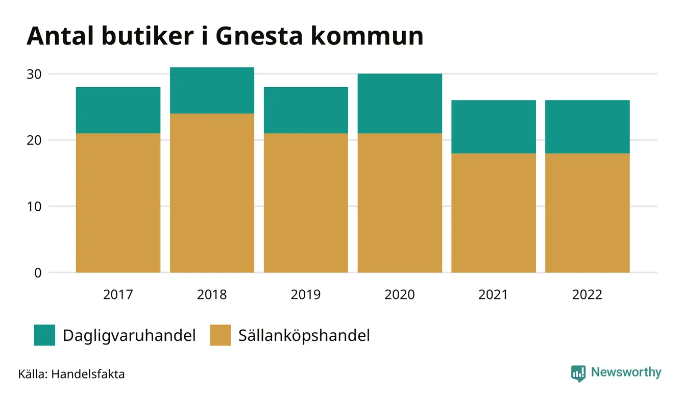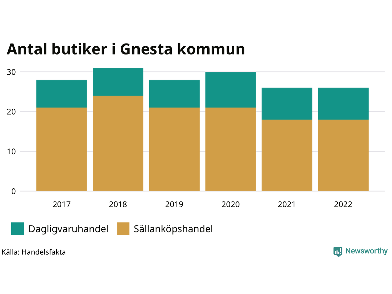 I Gnesta rör det sig om små tal. Den 30 november 2022 fanns 26 butiker i kommunen, vilket är lika många som året innan men två färre än 2017.