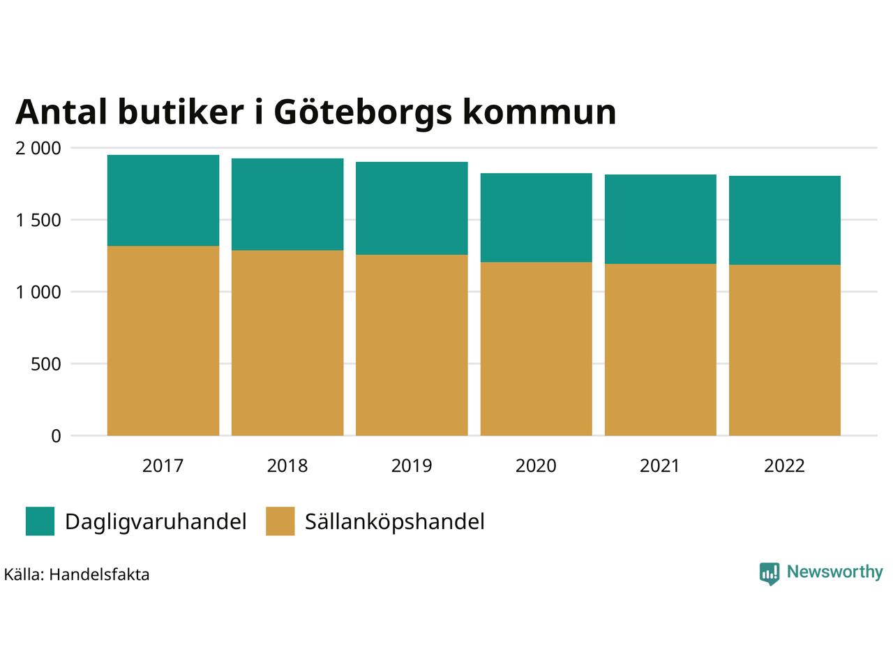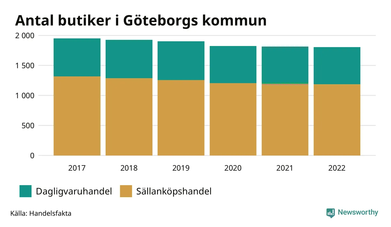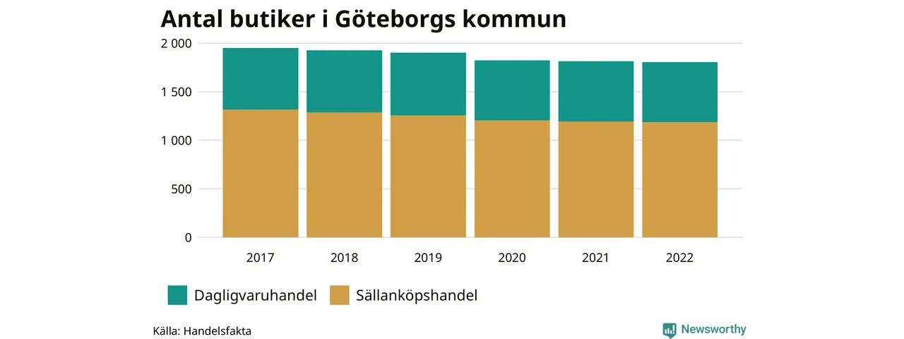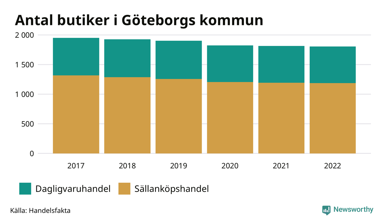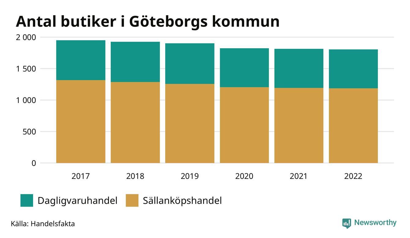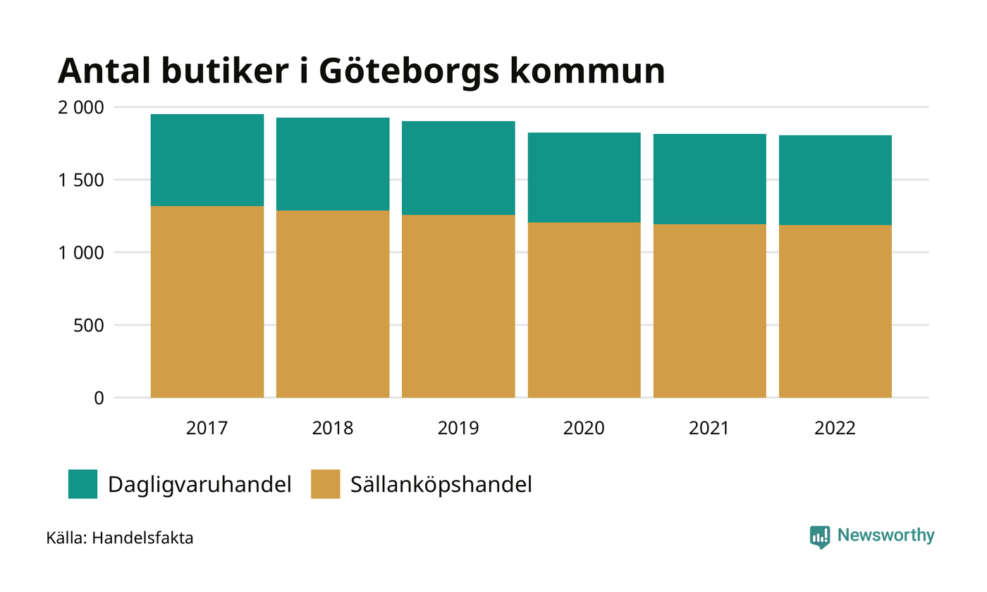 Samma utveckling ses i Göteborgs kommun. Den 30 november 2022 fanns 1 806 butiker i kommunen, vilket är sju färre än året innan och 146 färre än 2017.