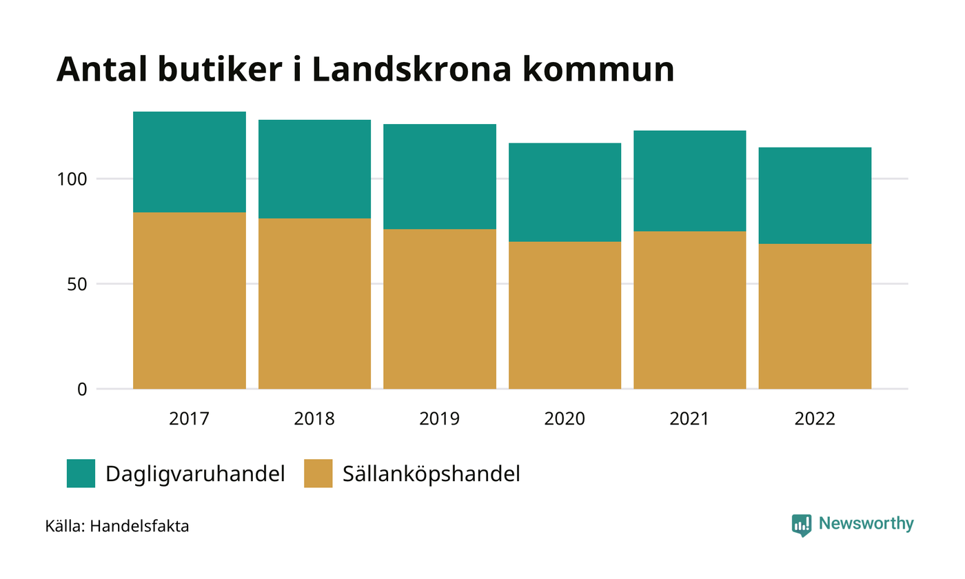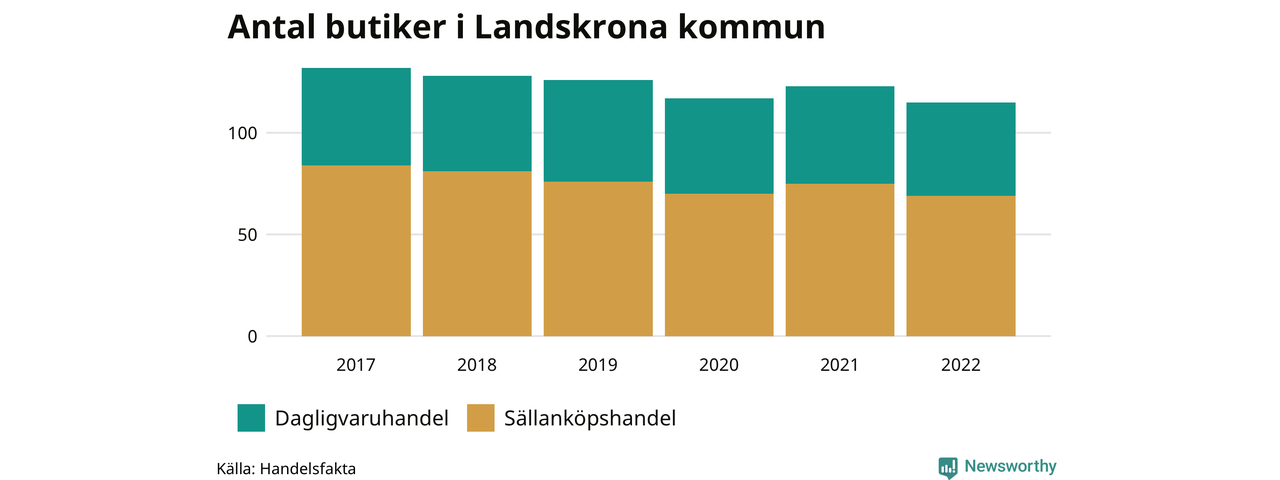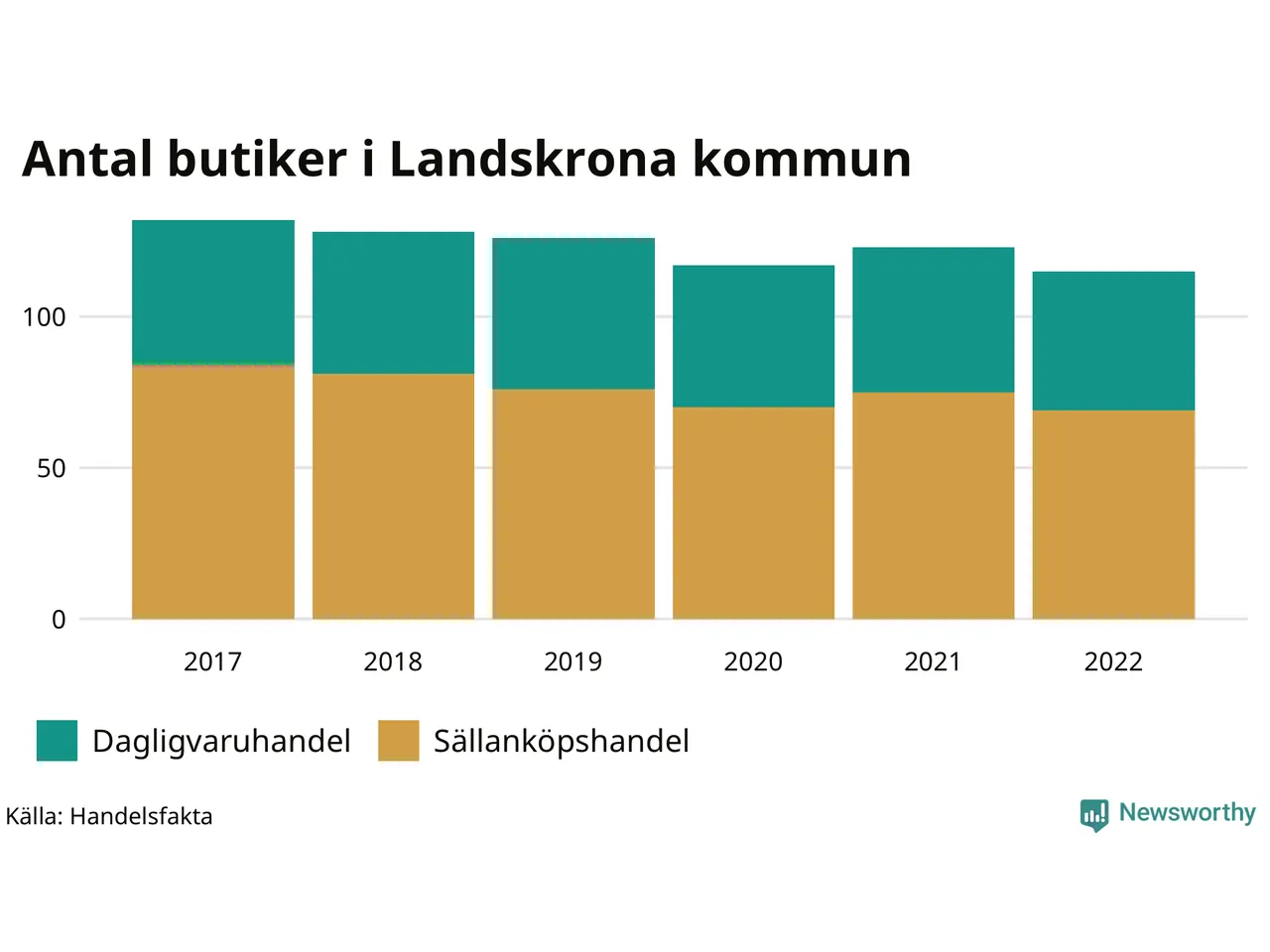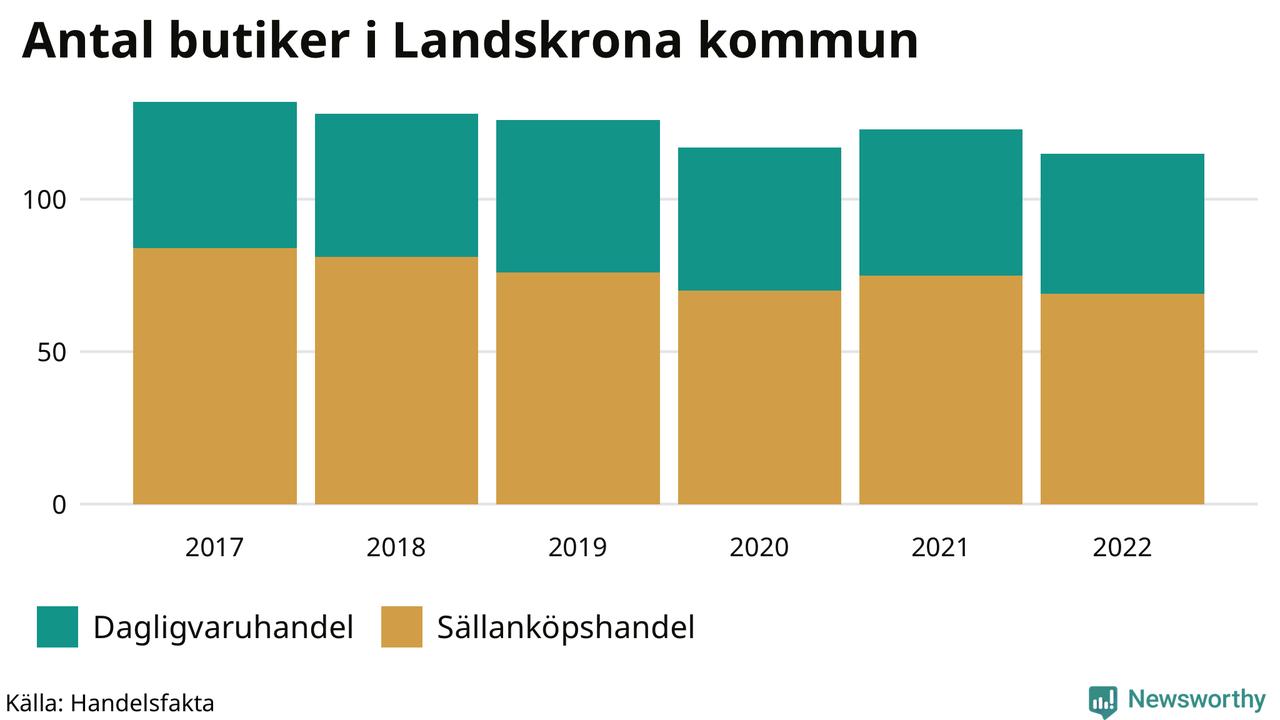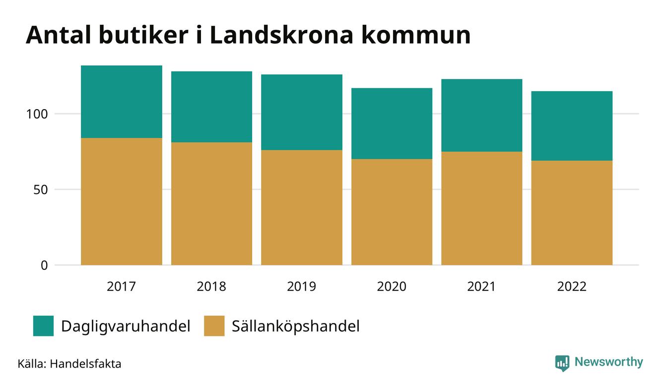 I Landskrona kommun har utvecklingen gått ännu fortare. Här har var åttonde butik försvunnit. Den 30 november 2022 fanns 115 butiker i kommunen, vilket är åtta färre än året innan och 17 färre än 2017.