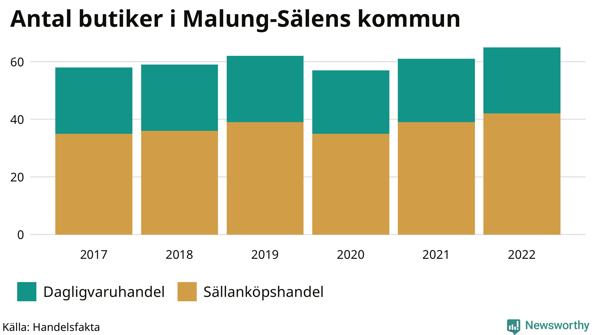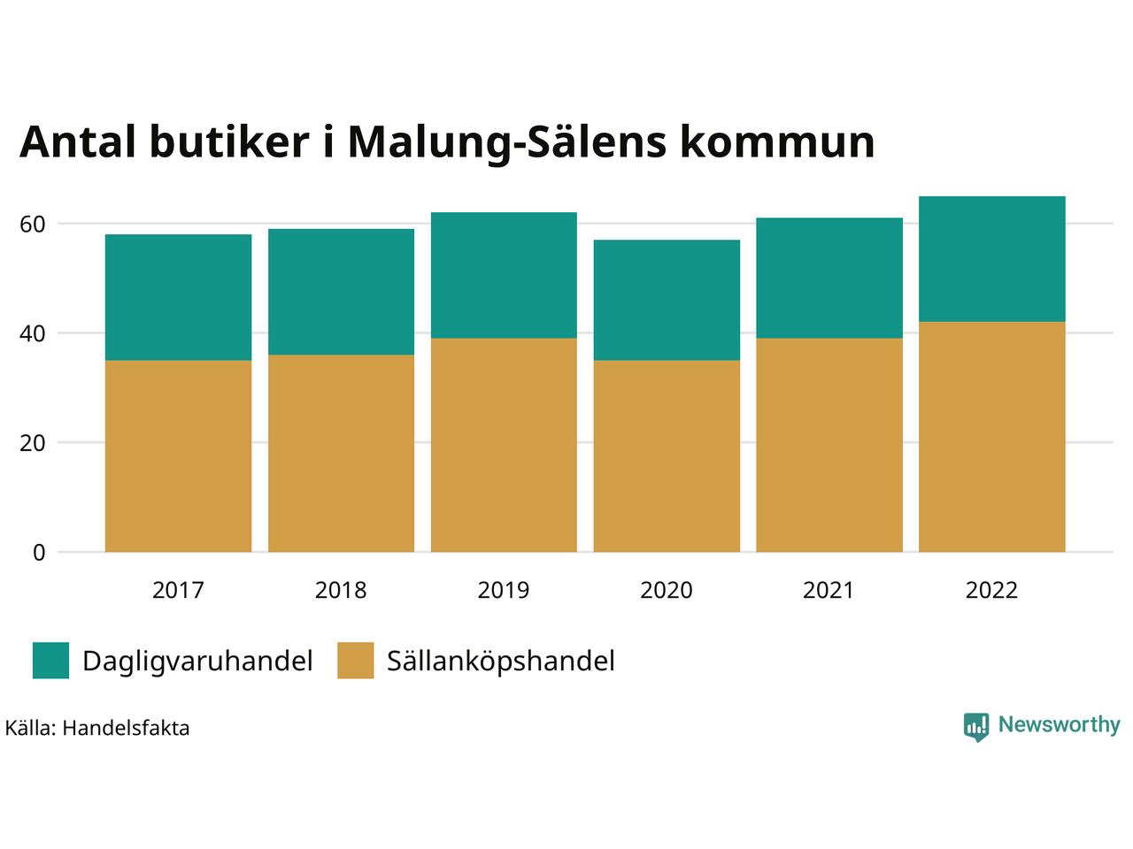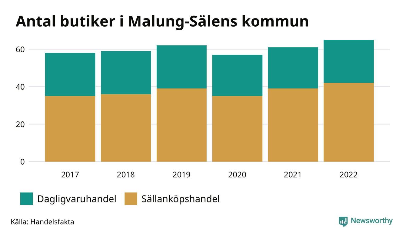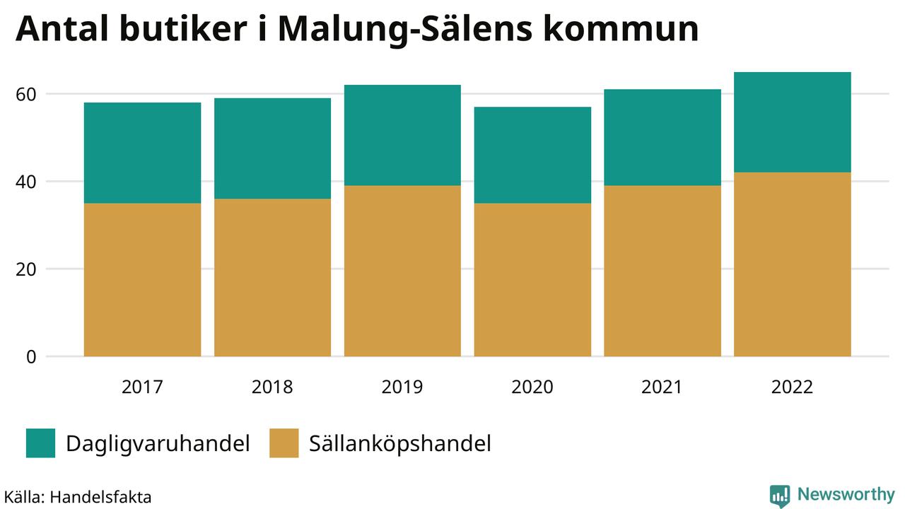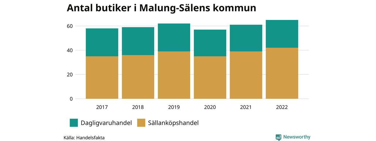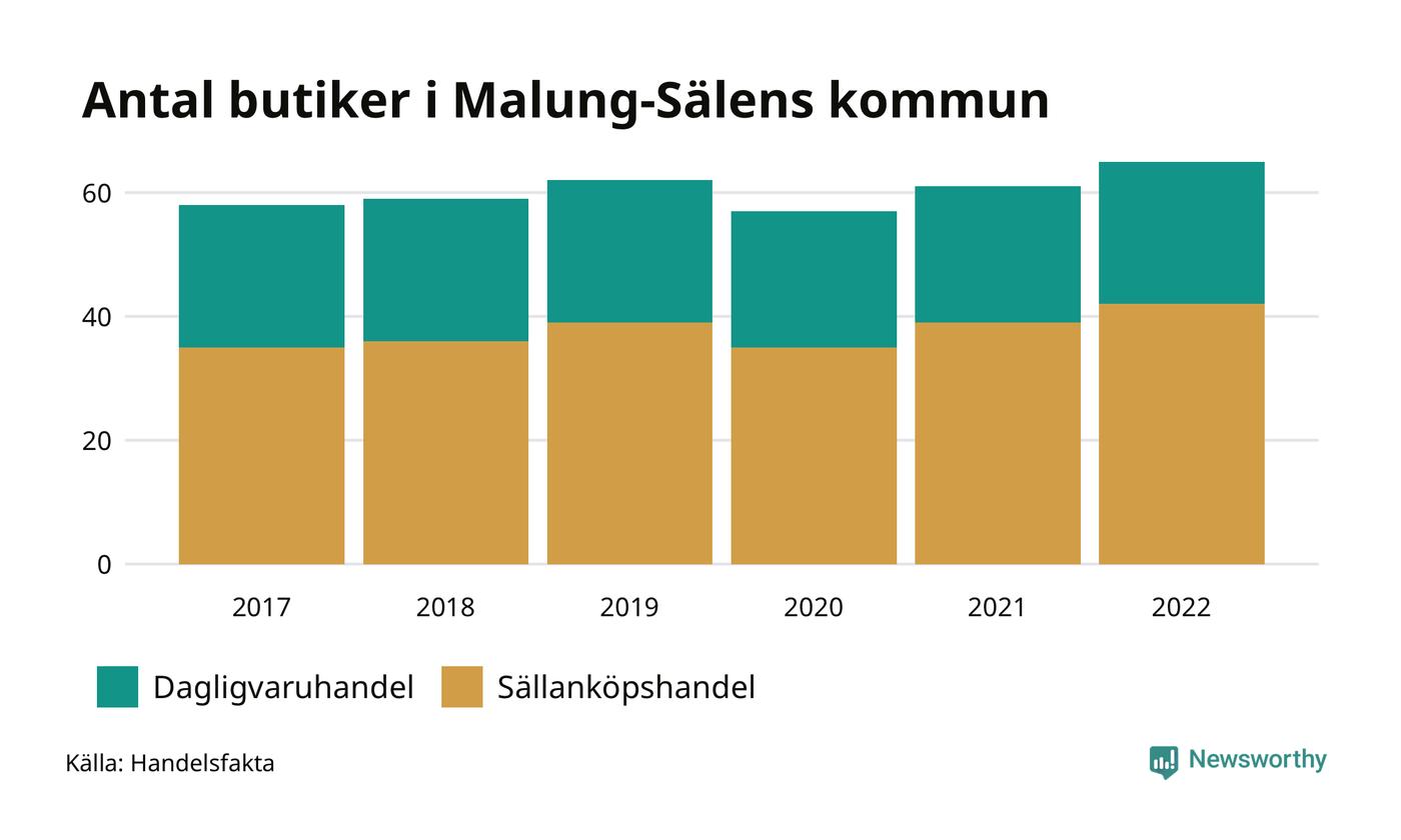 I Malung-Sälens kommun har antalet butiker däremot ökat. Den 30 november 2022 fanns 65 butiker i kommunen, vilket är fyra fler än året innan och sju fler än 2017.
