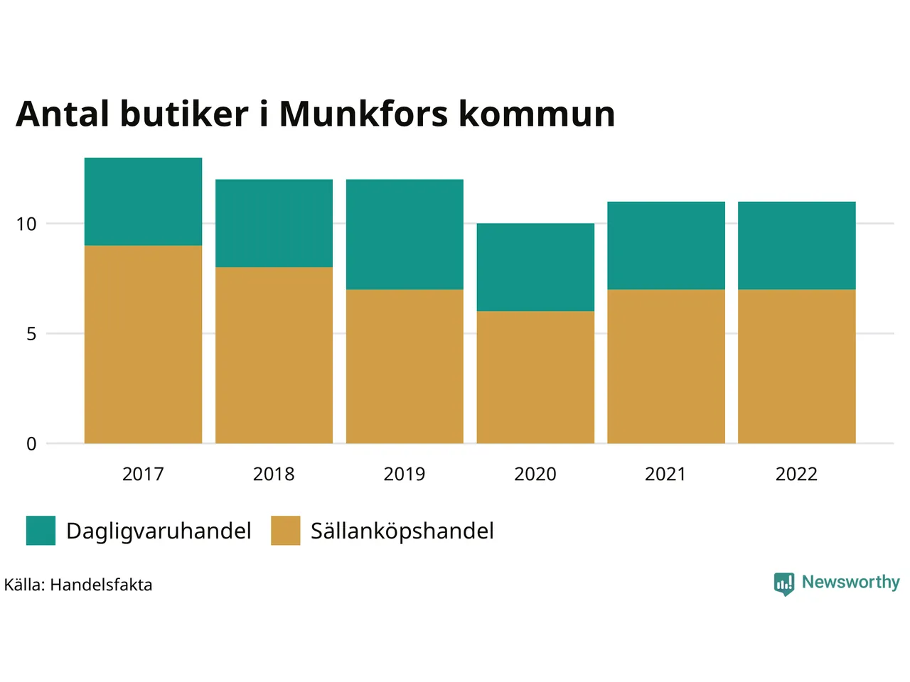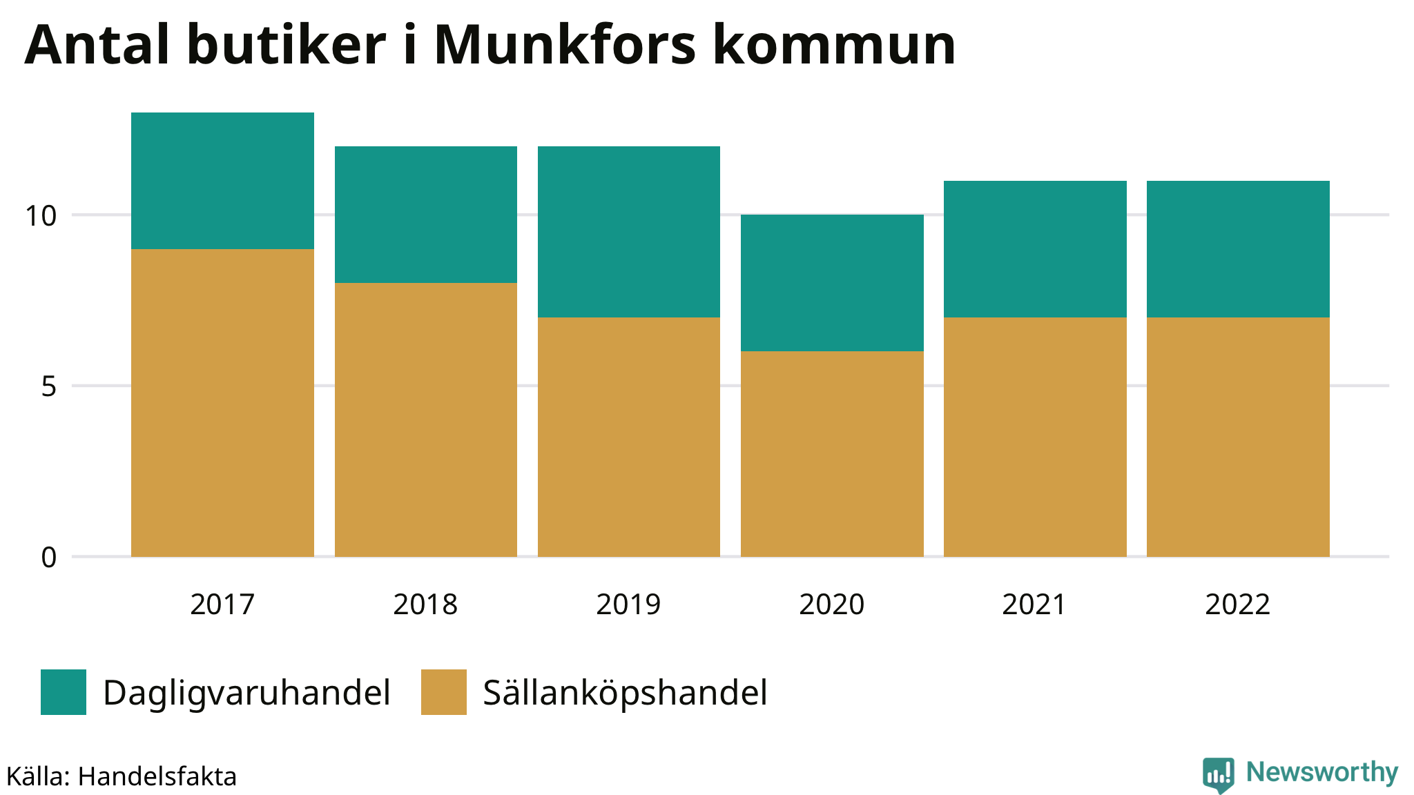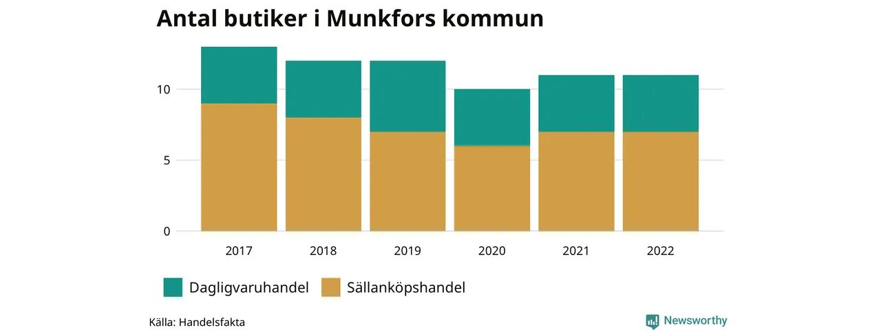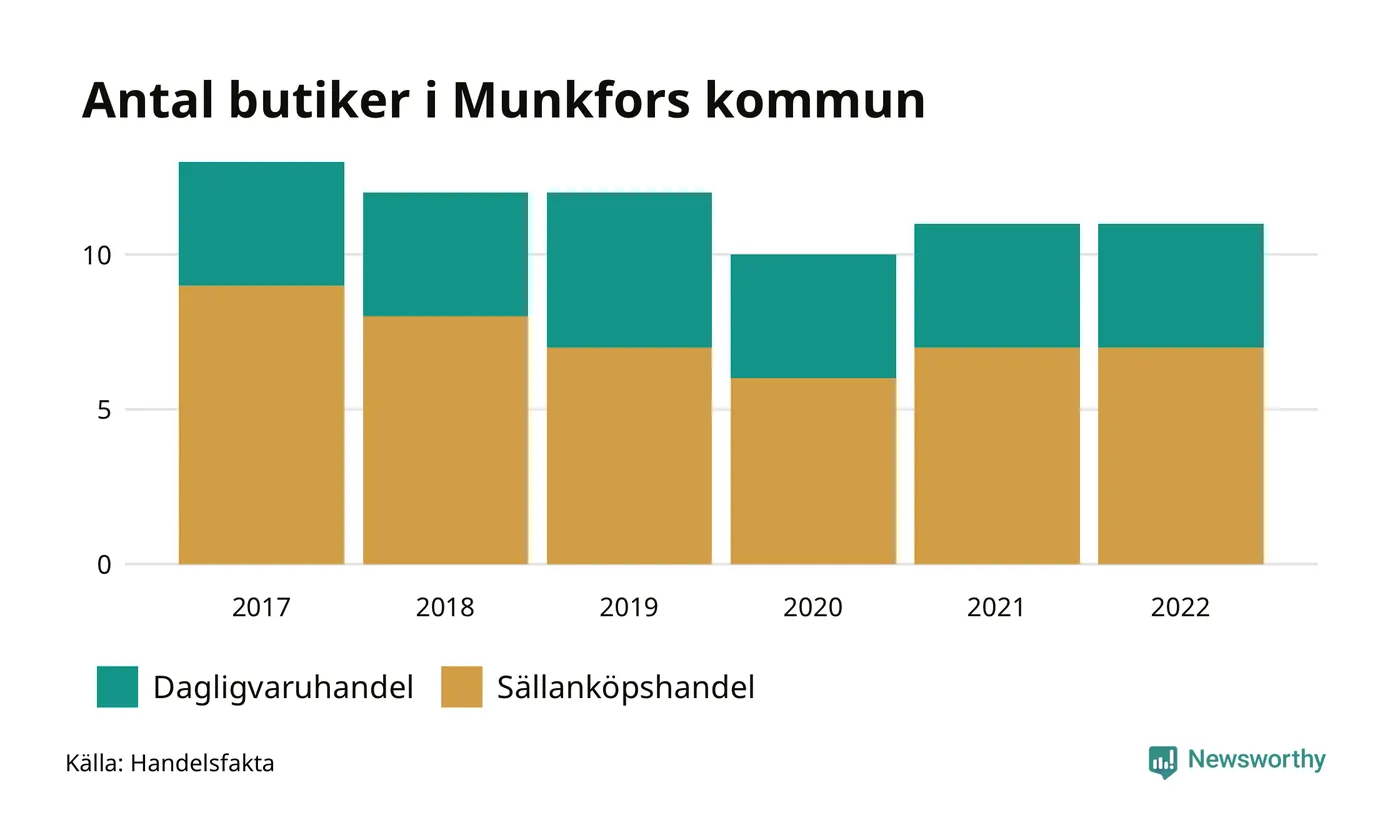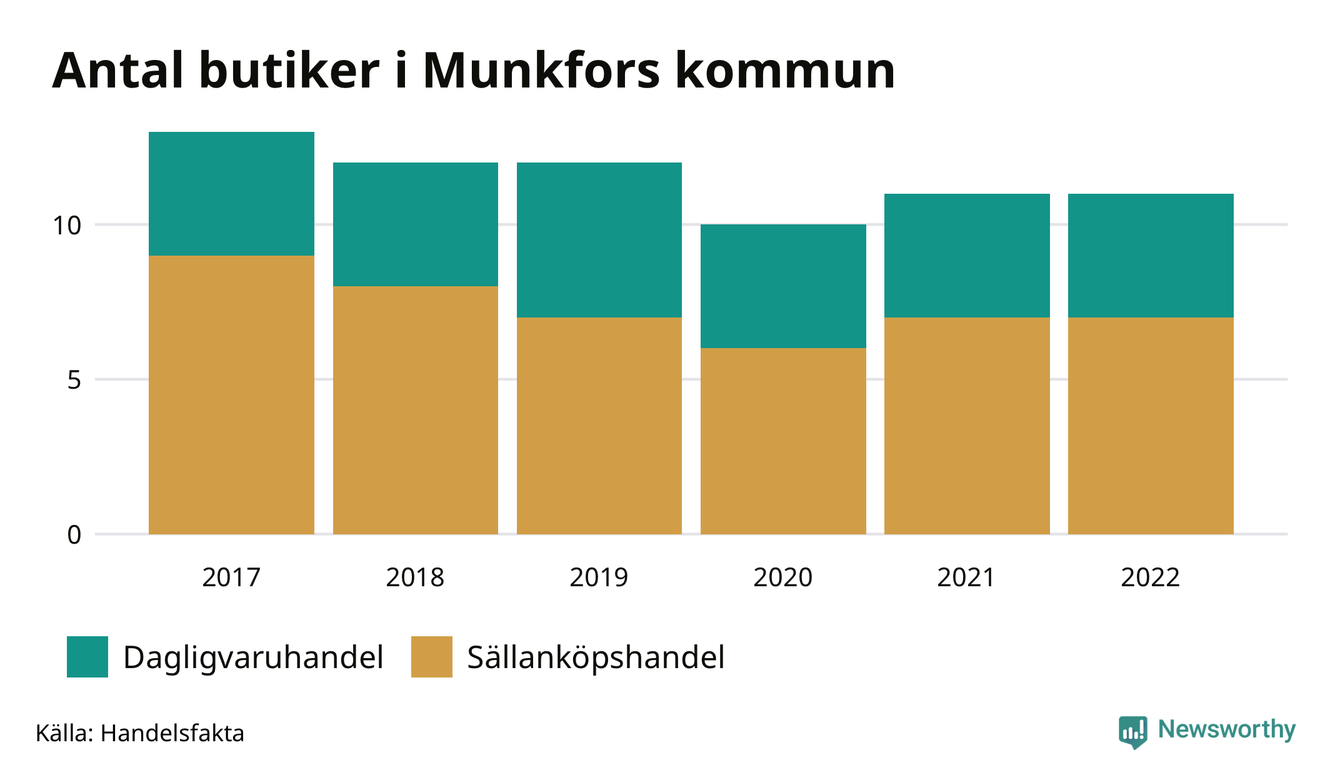 I Munkfors rör det sig om små tal. Den 30 november 2022 fanns elva butiker i kommunen, vilket är lika många som året innan men två färre än 2017.