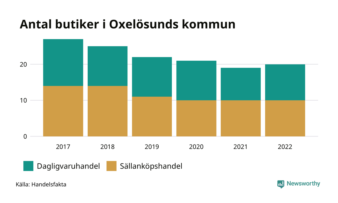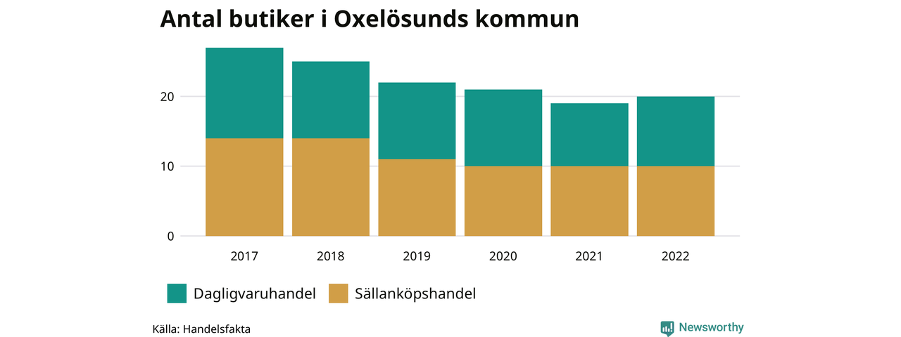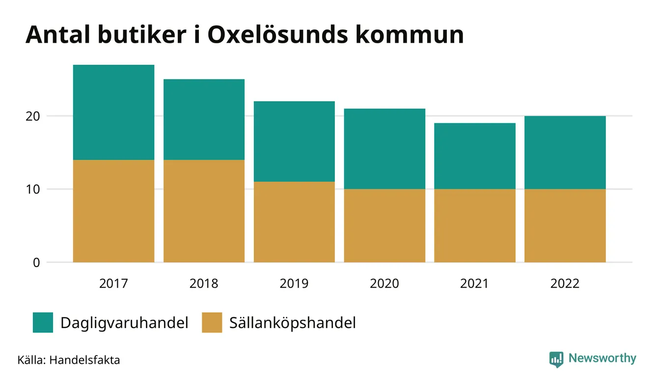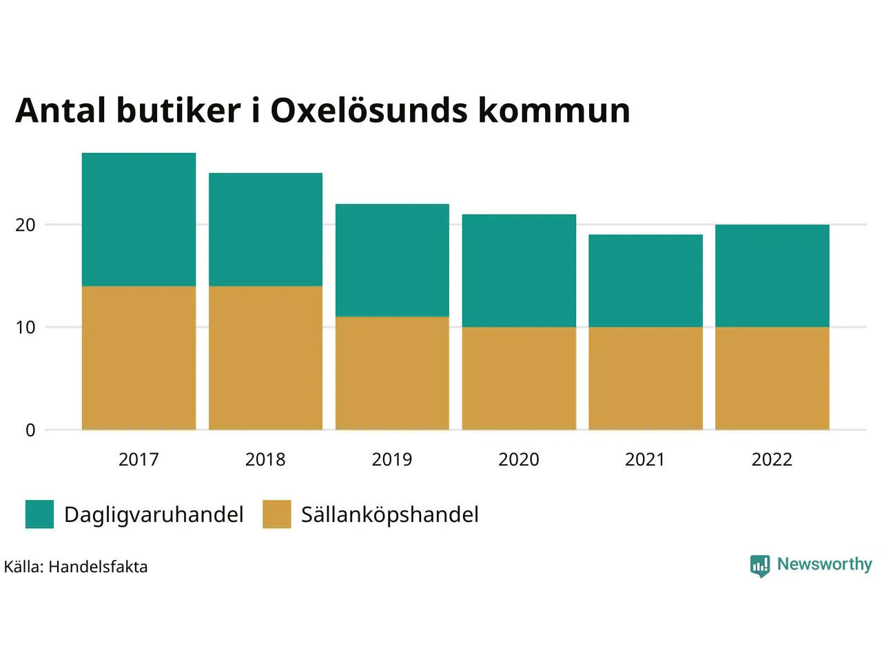 Butikerna blir allt färre i landet, sedan 2017 har antalet minskat med 7 procent. I Oxelösunds kommun fanns 20 butiker 2022 – jämfört med 27 stycken fem år tidigare.