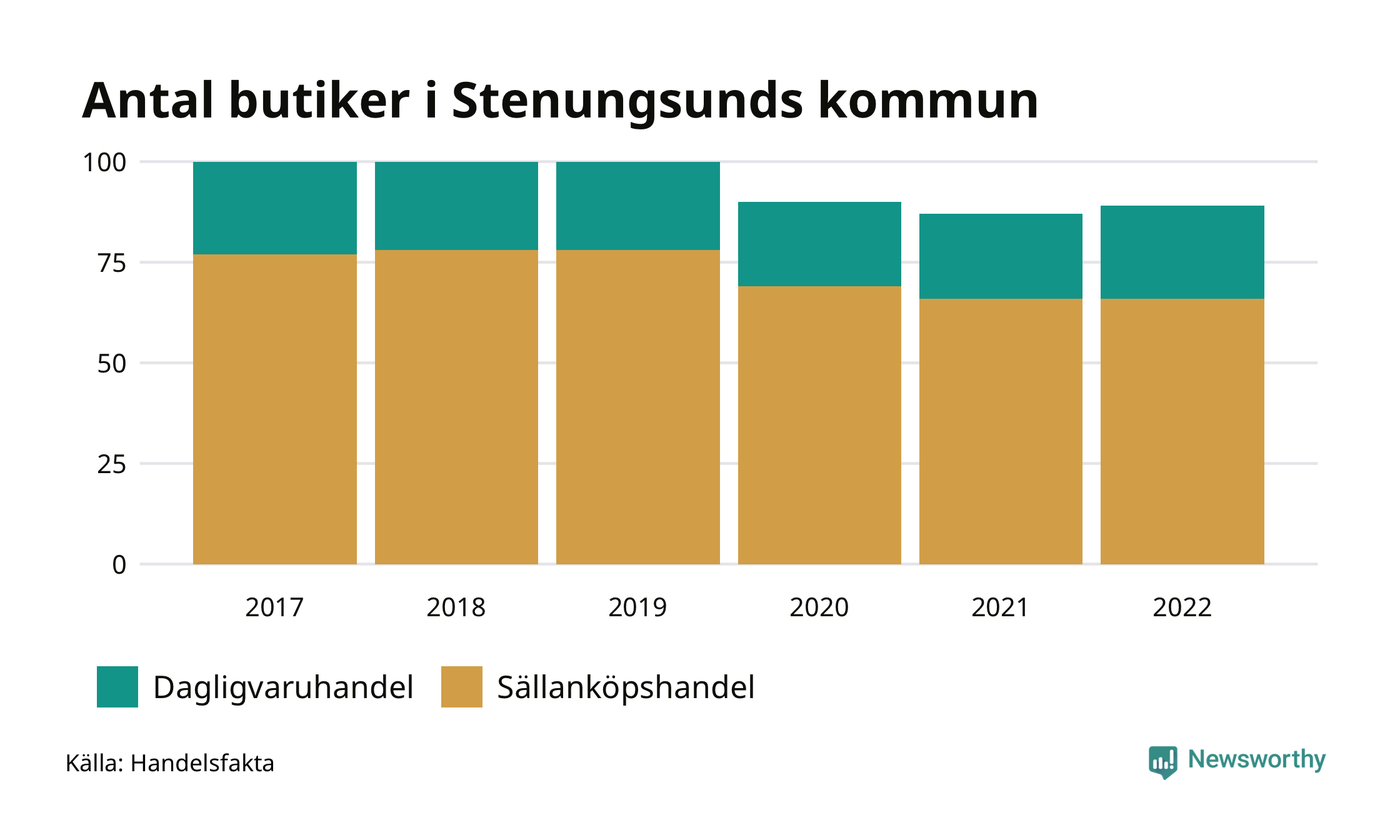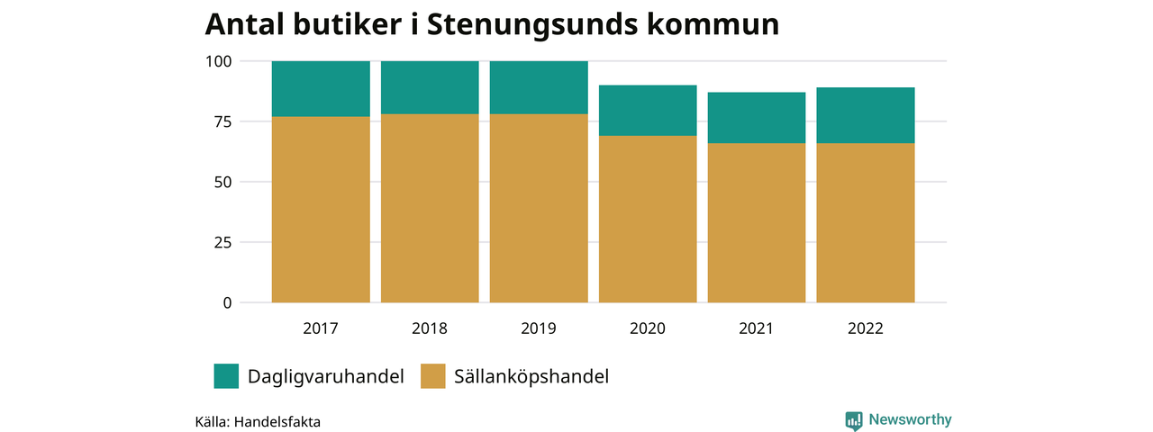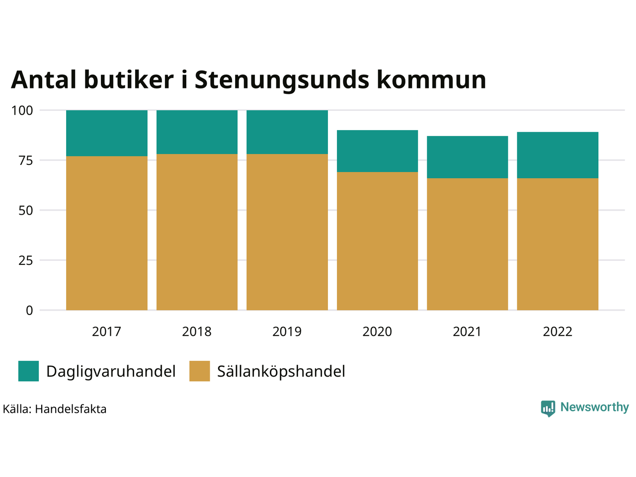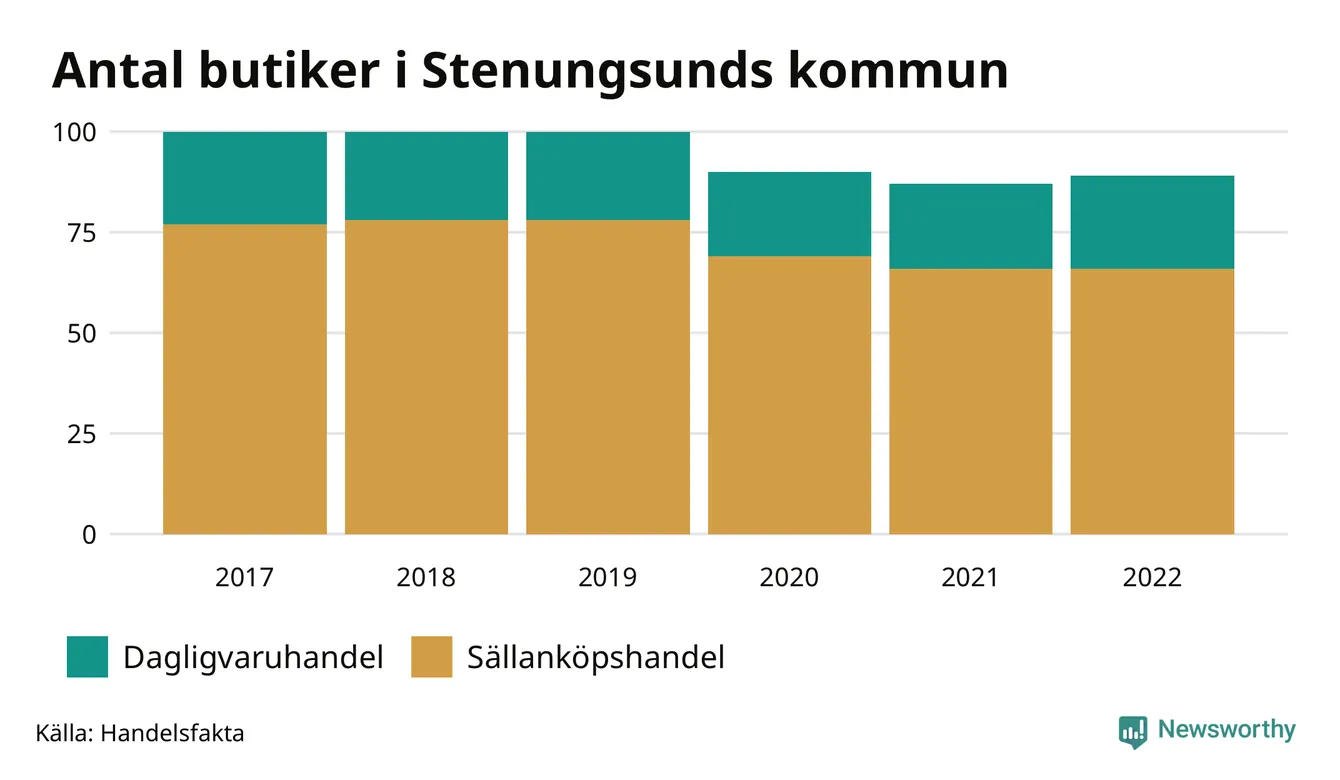 I Stenungsunds kommun har utvecklingen gått ännu fortare. Här har var åttonde butik försvunnit. Den 30 november 2022 fanns 89 butiker i kommunen, vilket är två fler än året innan men elva färre än 2017.
