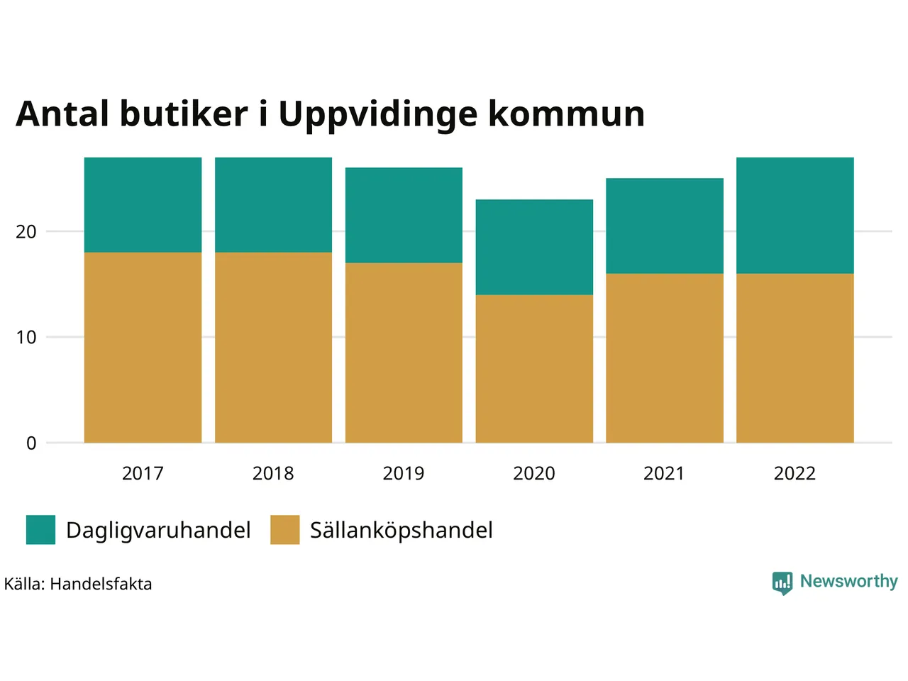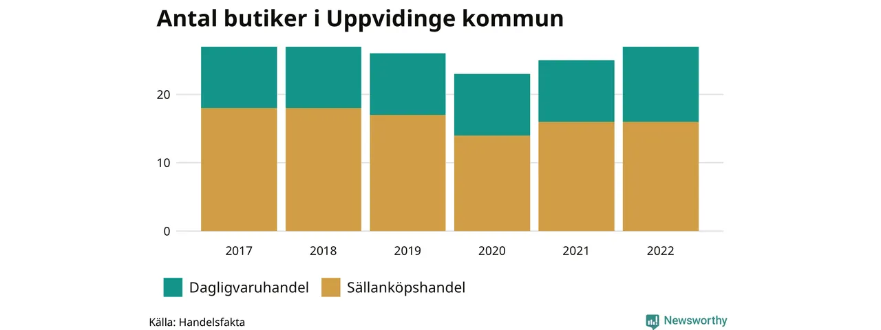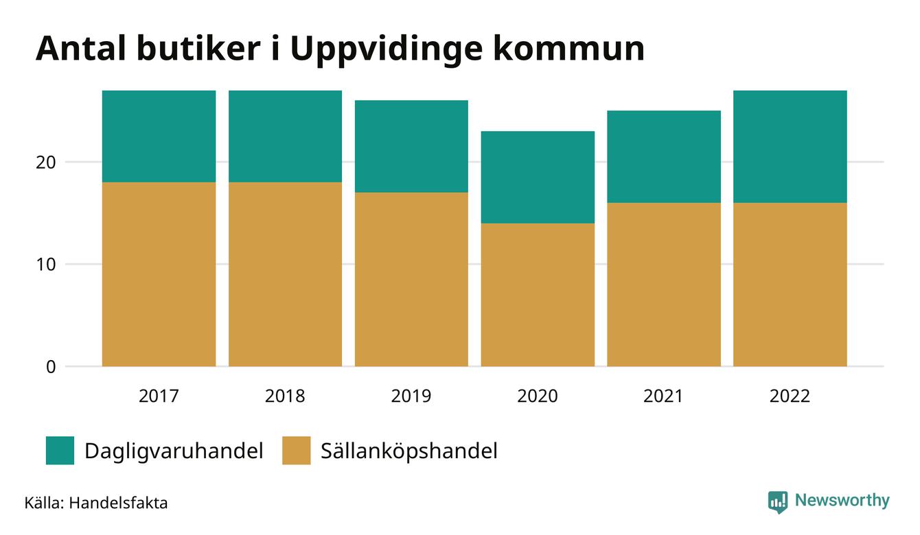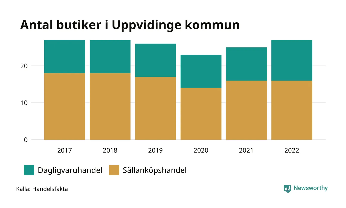 I Uppvidinge rör det sig om små tal. Den 30 november 2022 fanns 27 butiker i kommunen, vilket är två fler än året innan och lika många som 2017.