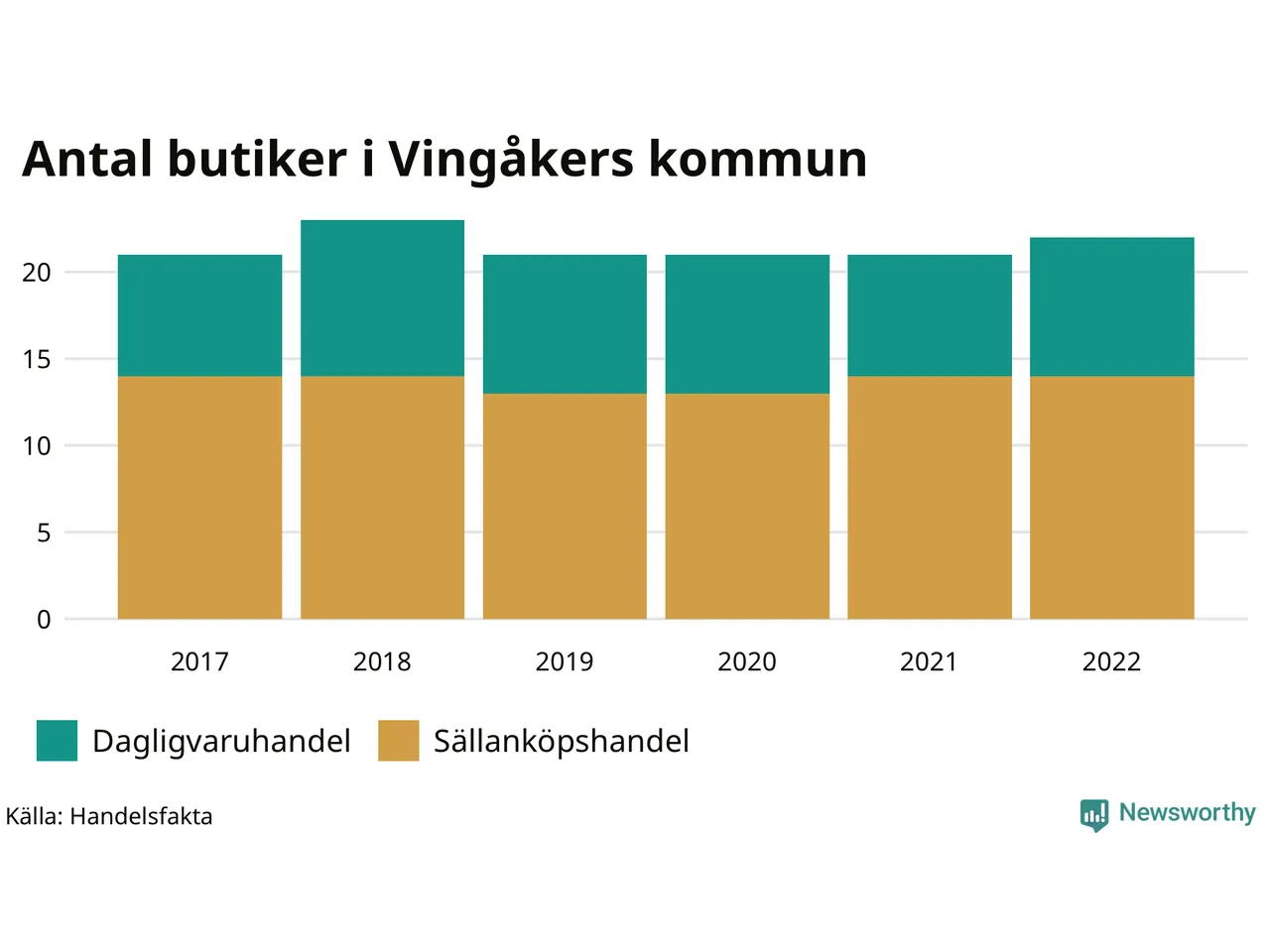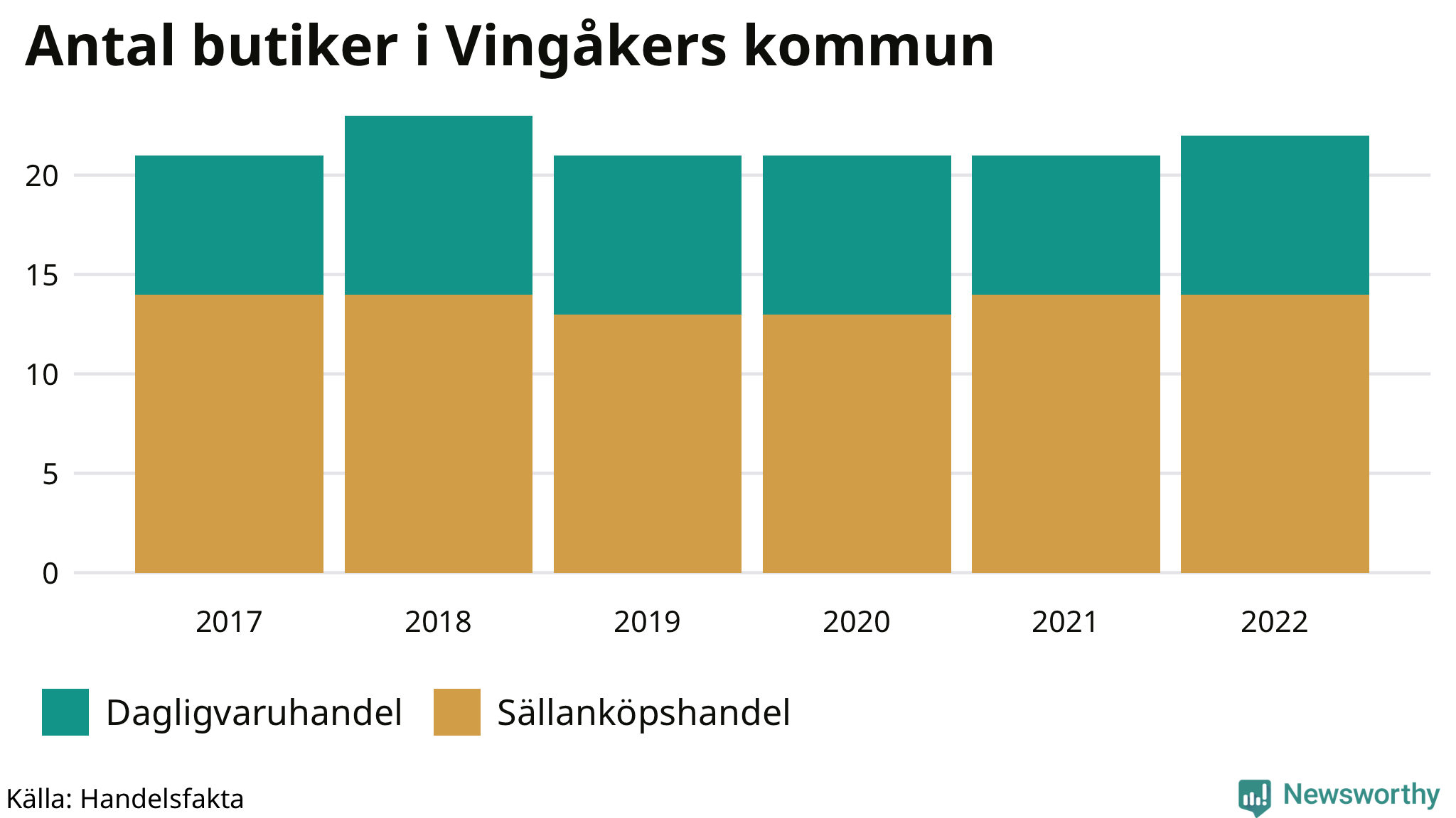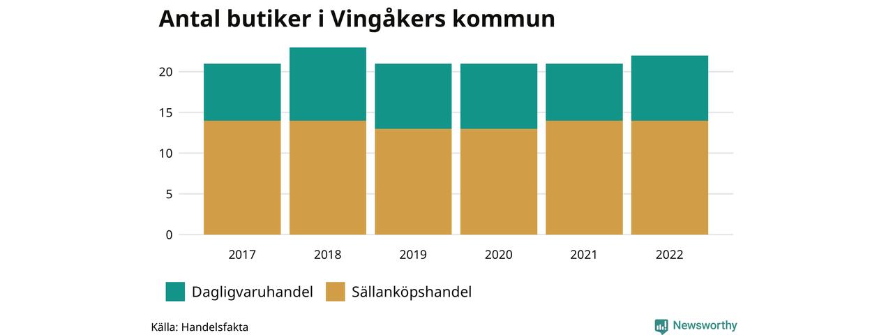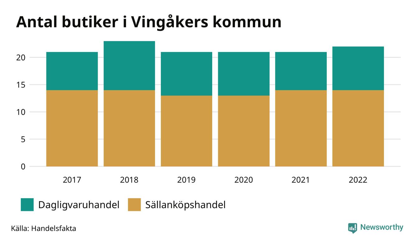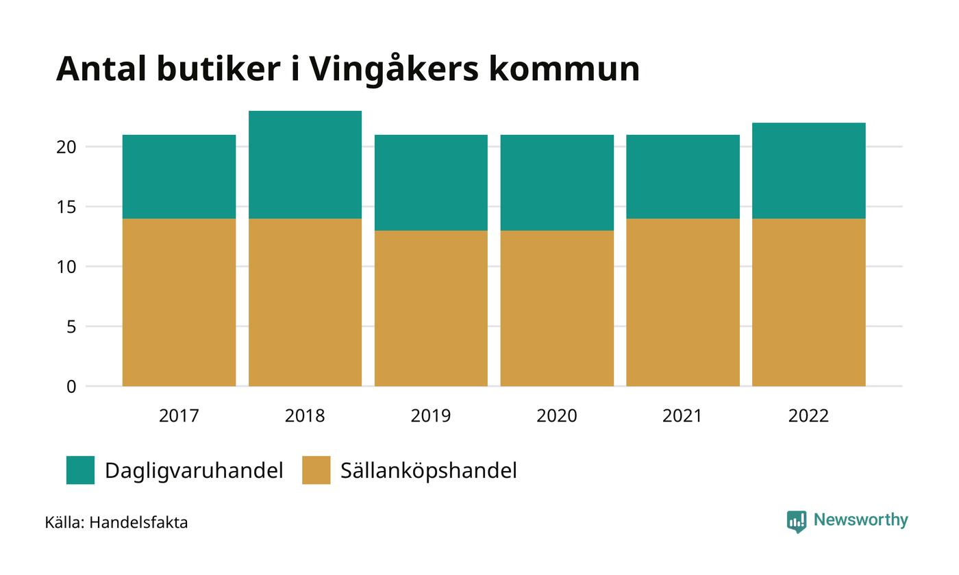 I Vingåker rör det sig om små tal. Den 30 november 2022 fanns 22 butiker i kommunen, vilket är en fler än året innan och en fler än 2017.