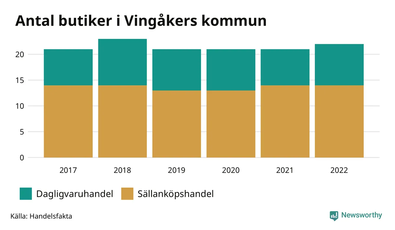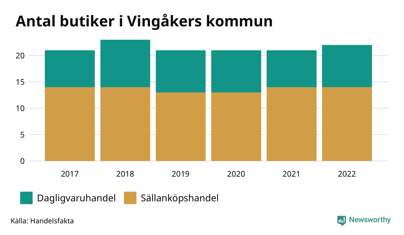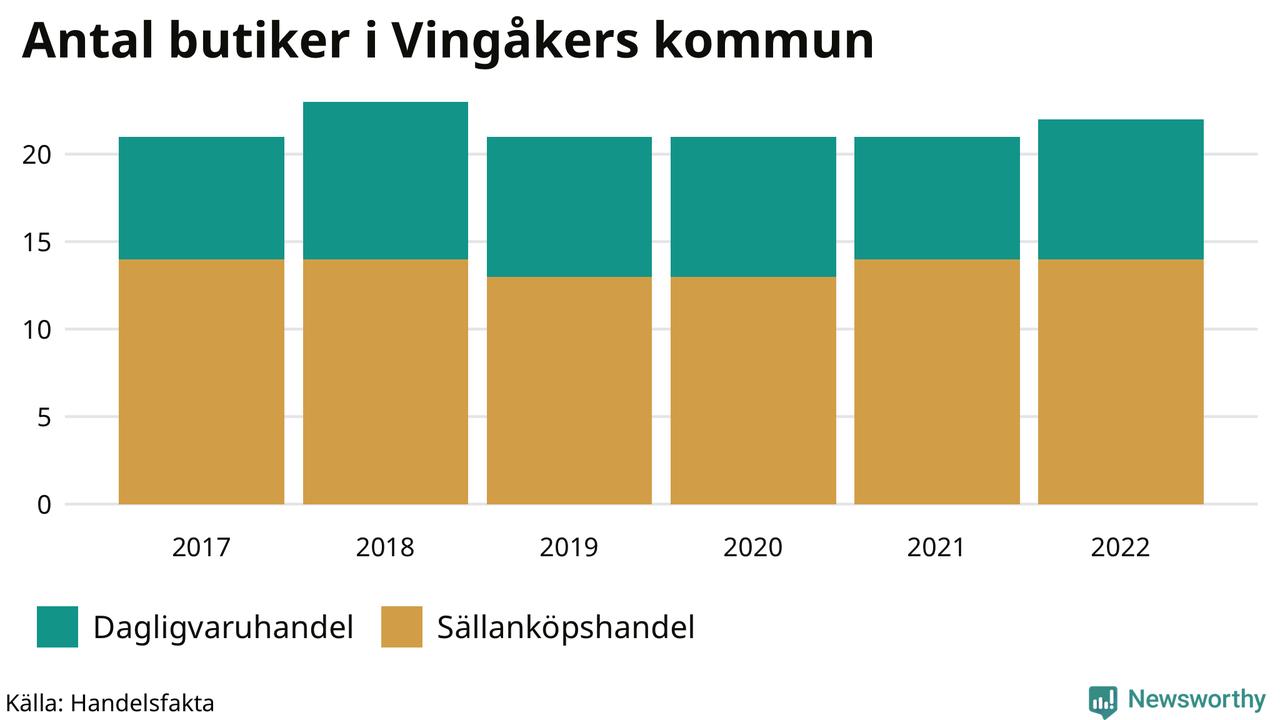 Butikerna blir allt färre i landet, sedan 2017 har antalet minskat med 7 procent. I Vingåkers kommun fanns 22 butiker 2022 – jämfört med 21 stycken fem år tidigare.