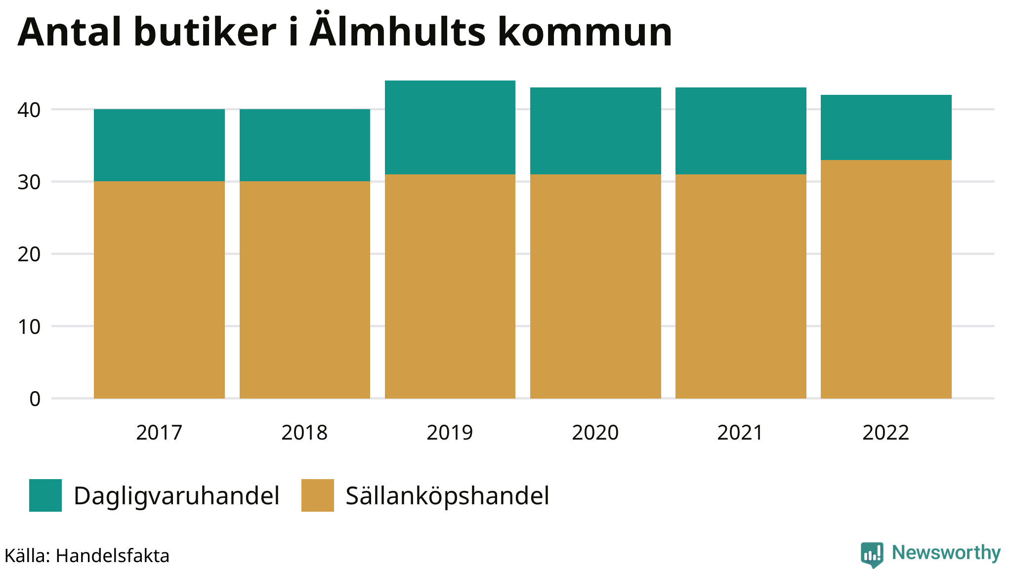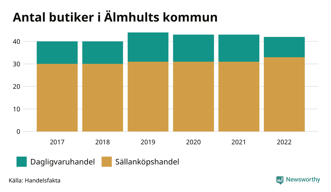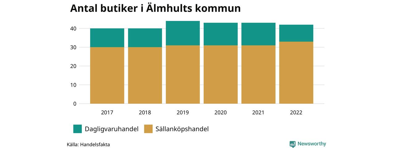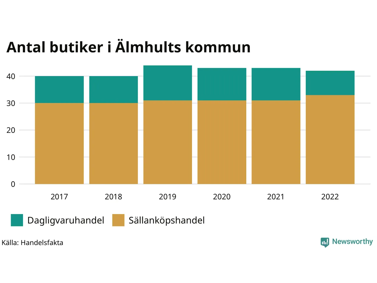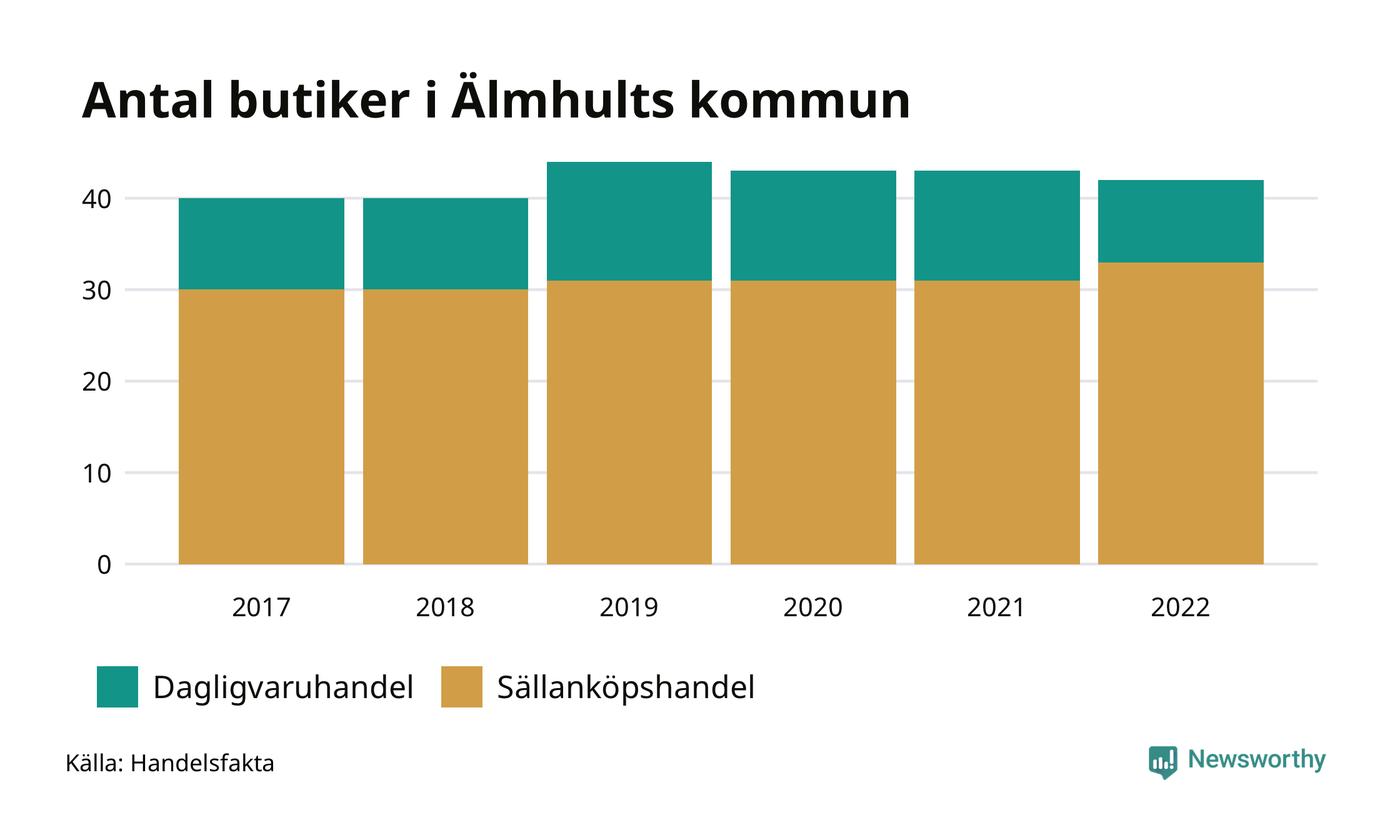 I Älmhults kommun har förändringarna varit relativt små. Den 30 november 2022 fanns 42 butiker i kommunen, vilket är en färre än året innan men två fler än 2017.