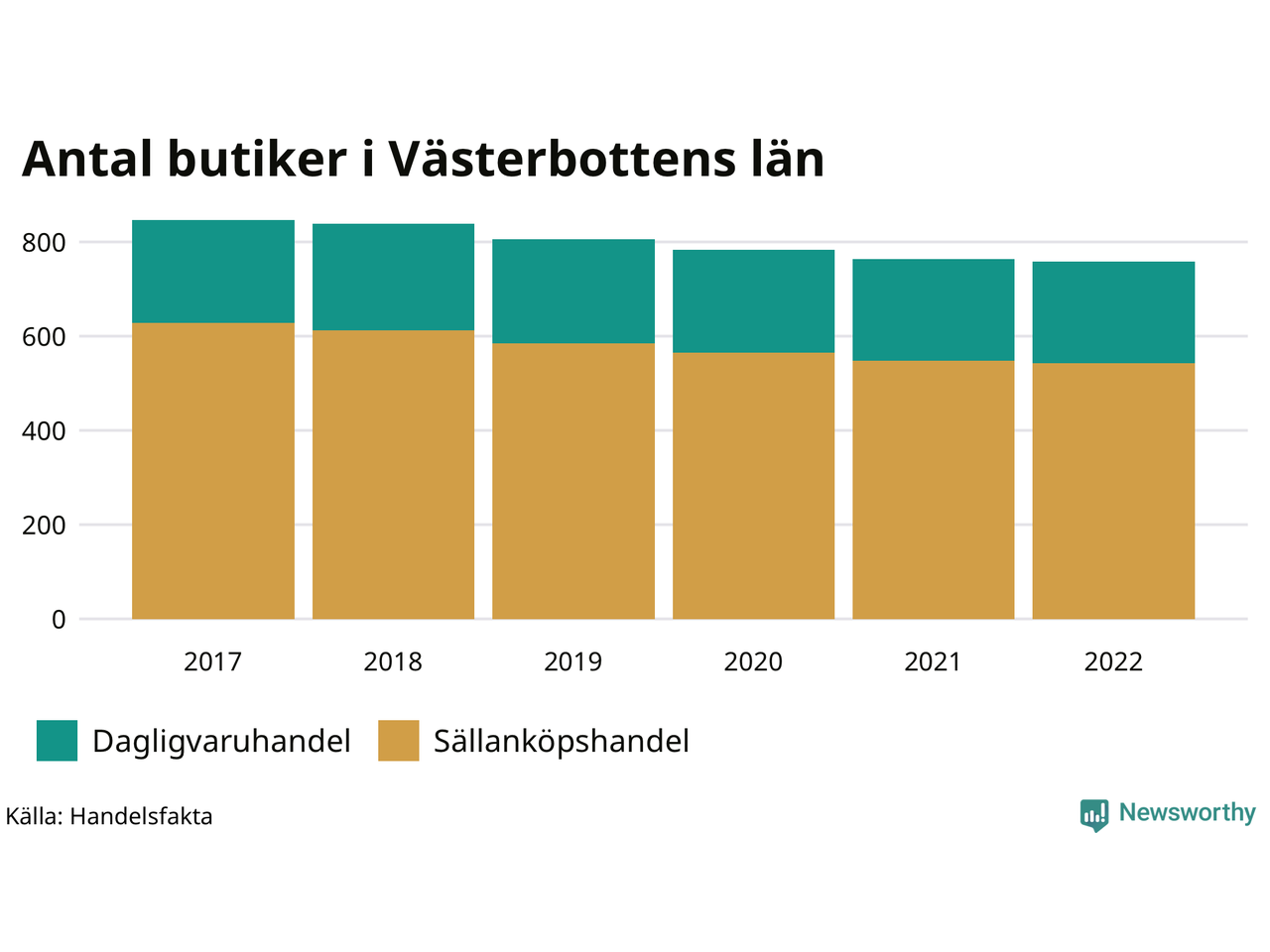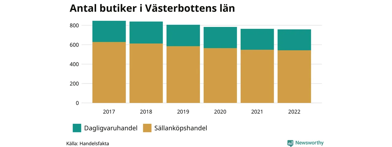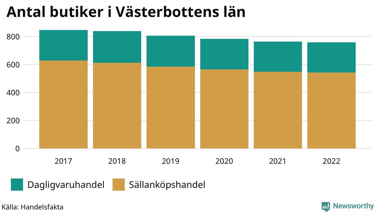 I Västerbottens län har utvecklingen gått ännu fortare. Här har var tionde butik försvunnit. Den 30 november 2022 fanns 758 butiker i länet, vilket är sex färre än året innan och 89 färre än 2017.